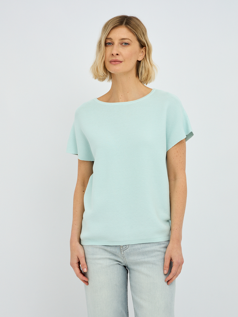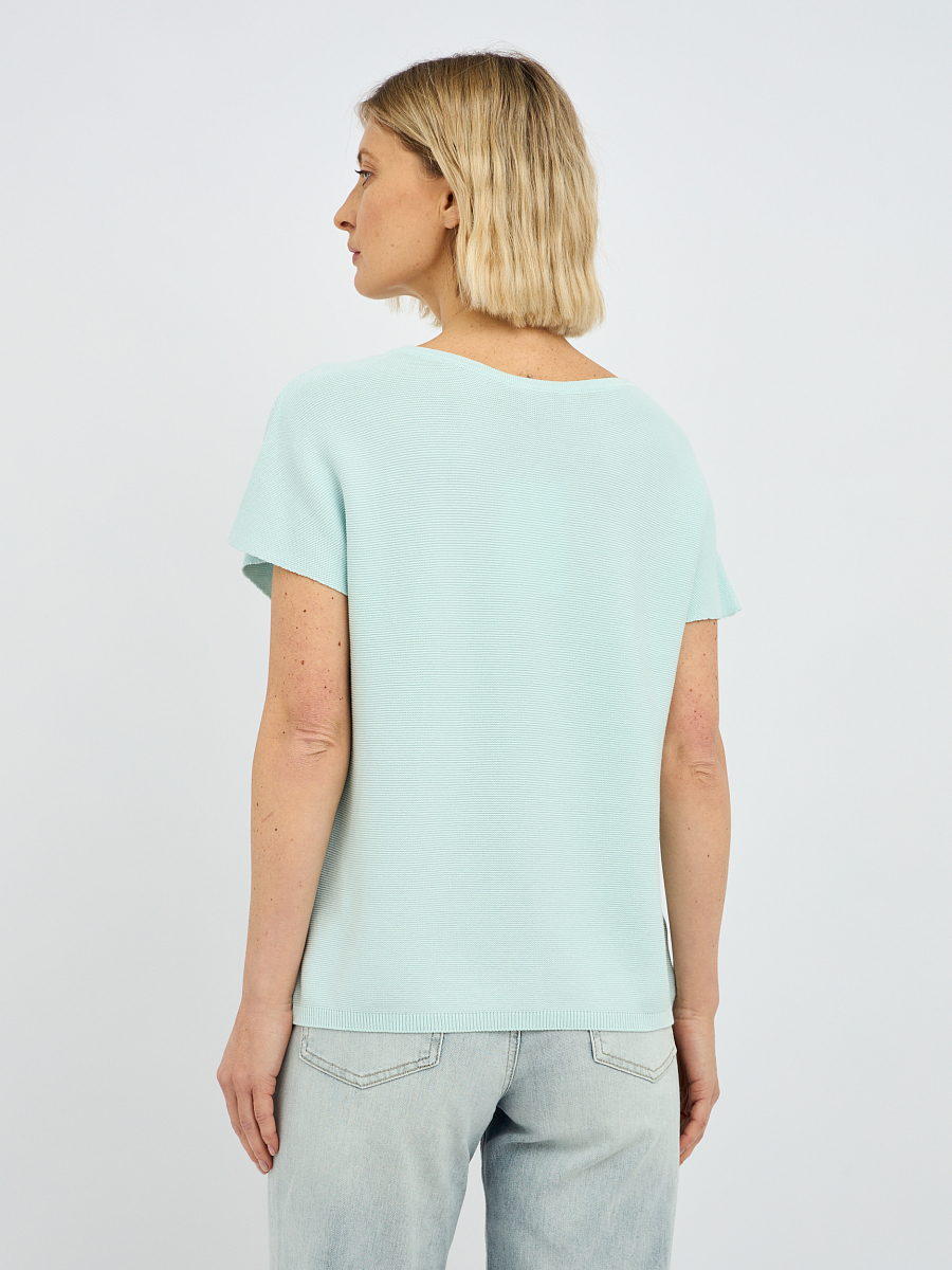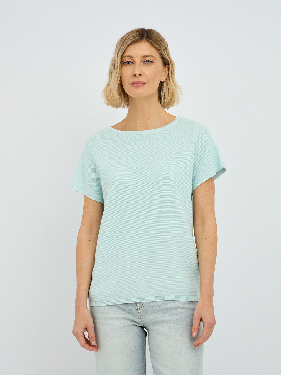 Классический круглый вырез горловины и свободный крой создают непринужденный и стильный силуэт, который подойдет для любой фигуры. Короткие рукава придают модели легкости и завершают образ. Текстура ткани, с деликатным рельефным узором, добавляет джемперу изысканности и оригинальности, делая его не просто базовой вещью, а выразительным элементом вашего гардероба.