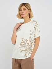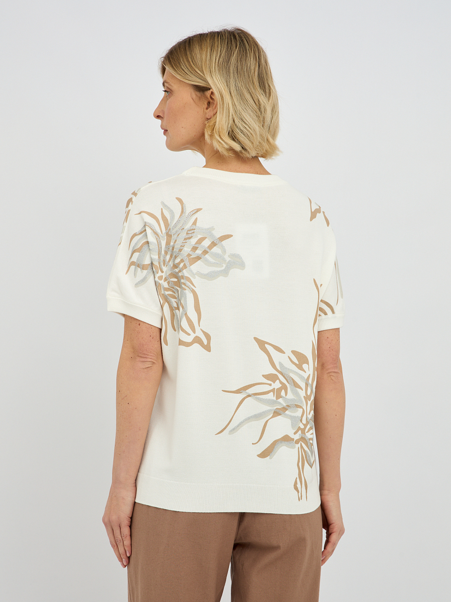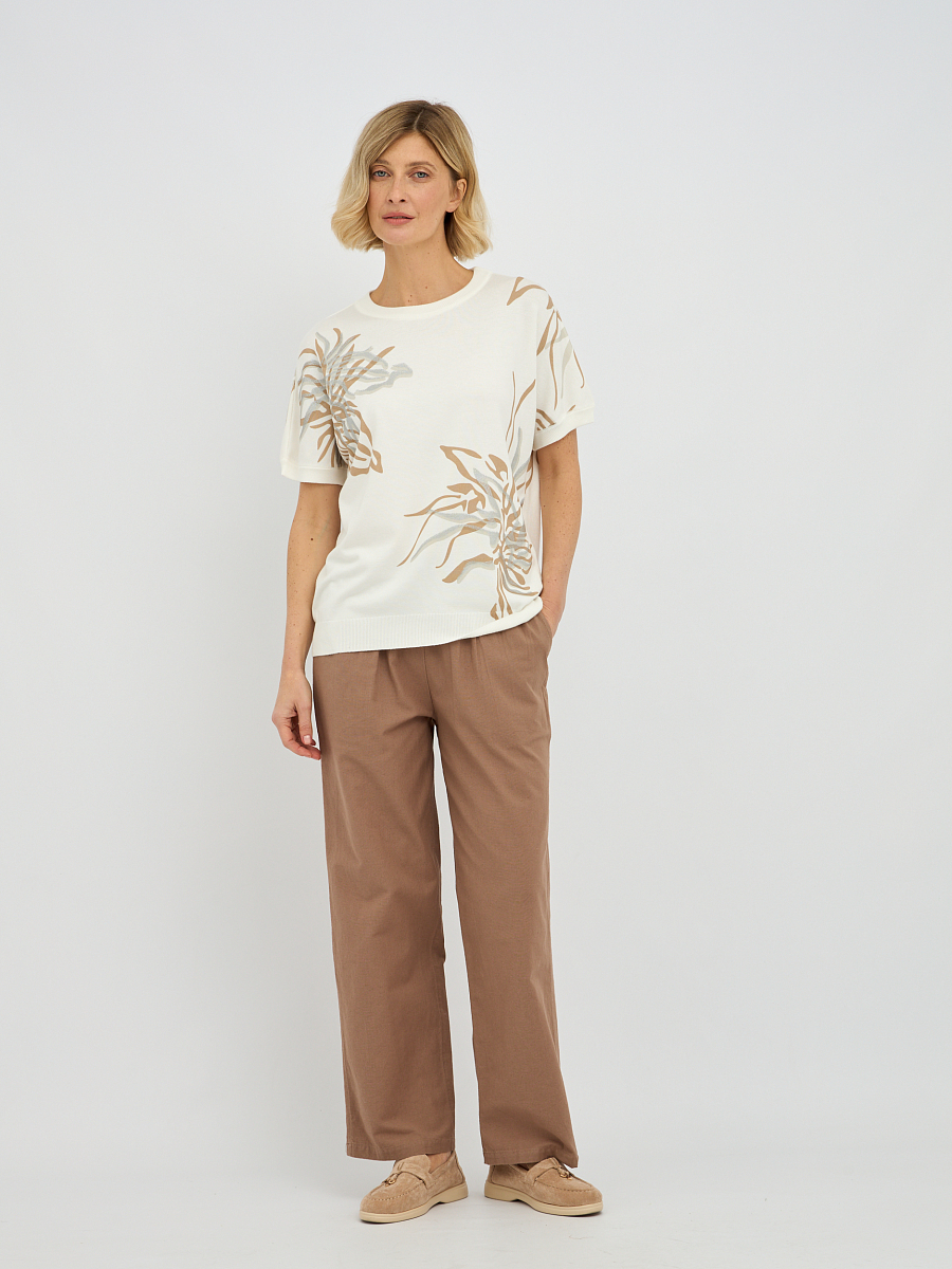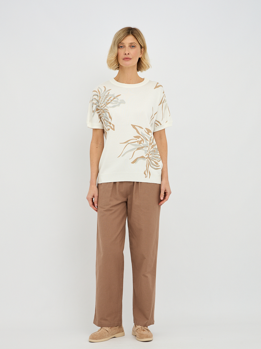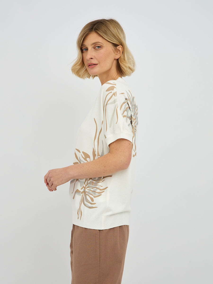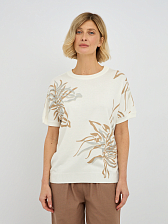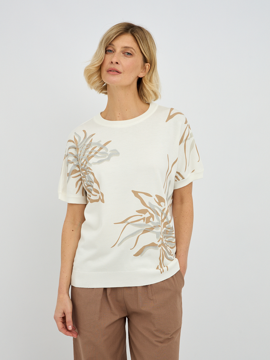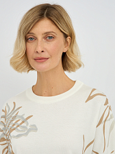 Уникальный цветочный узор, выполненный в деликатных бежевых и золотистых оттенках, придает изделию утонченный и романтичный вид, делая его идеальным выбором для создания женственных образов. Классический белый цвет делает джемпер универсальным, легко сочетаясь с любыми брюками, юбками или шортами, а также с верхней одеждой.