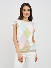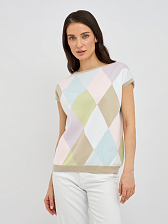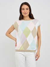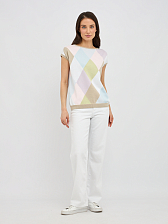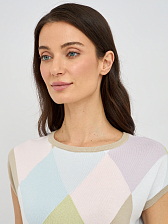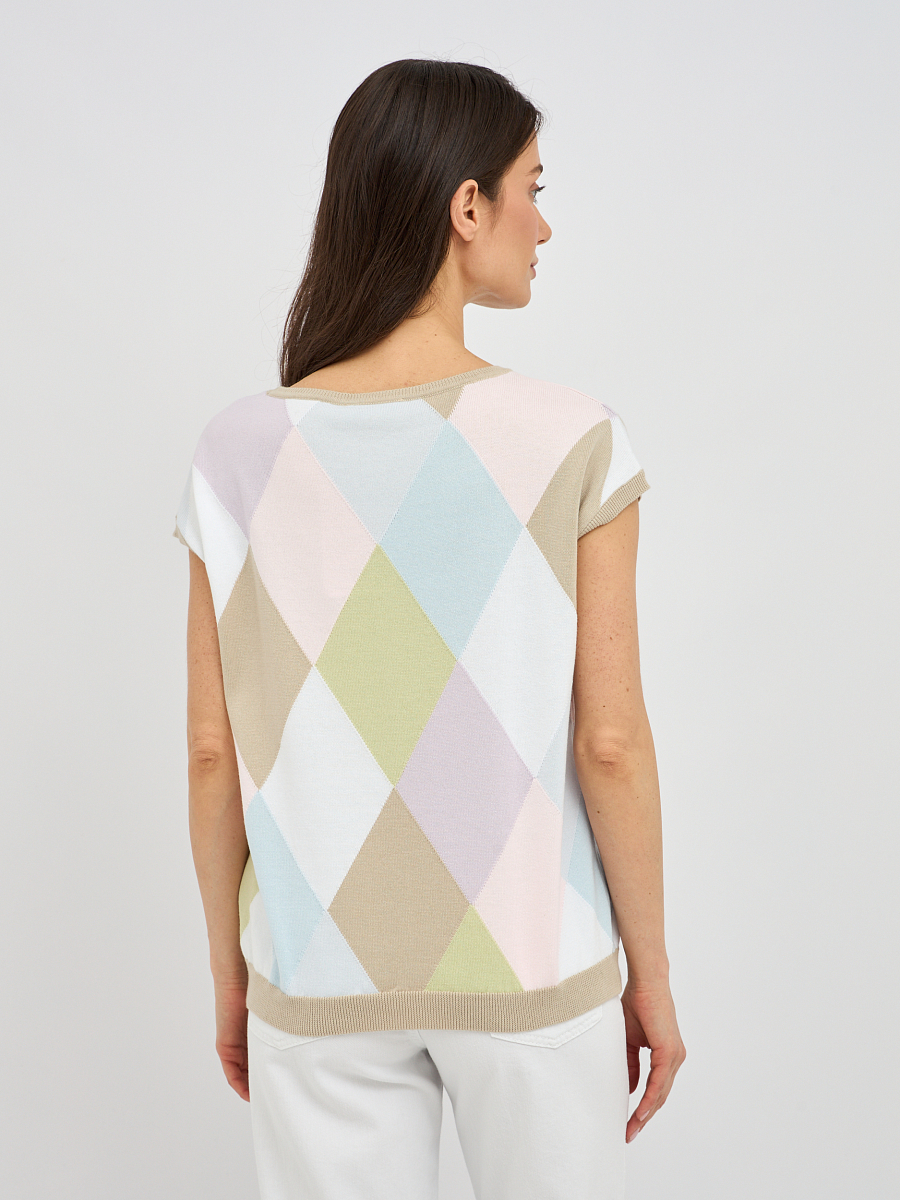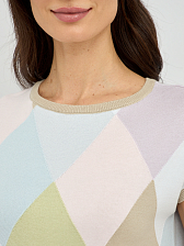 Прямой силуэт джемпера выгодно подчеркивает достоинства фигуры, не сковывая движений и создавая расслабленный, но в то же время утонченный образ. Изысканный узор в виде ромбов, выполненный в пастельных тонах, добавляет изделию особый шарм и придает ему винтажную нотку. Укороченный рукав джемпера идеально подходит для летних дней, обеспечивая свободу и комфорт, а также позволяя создавать интересные многослойные образы.