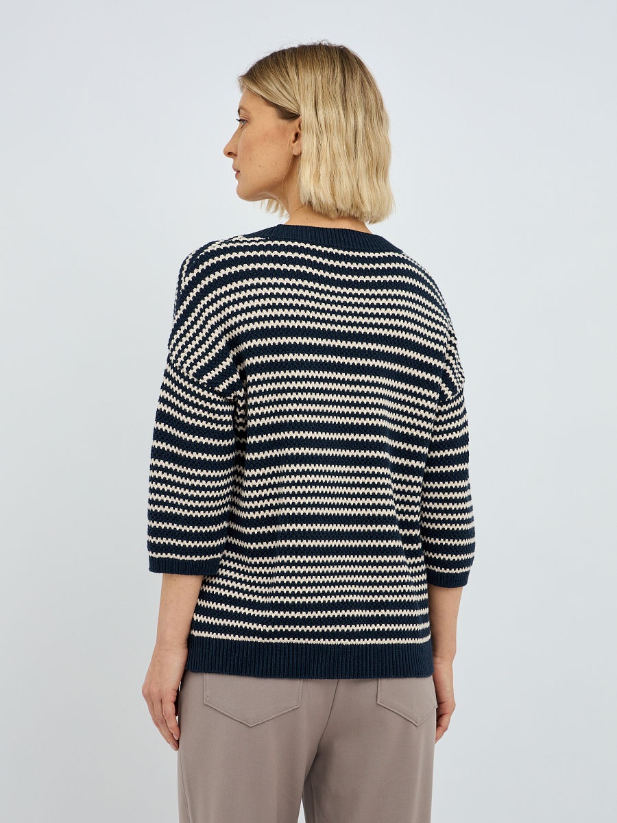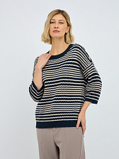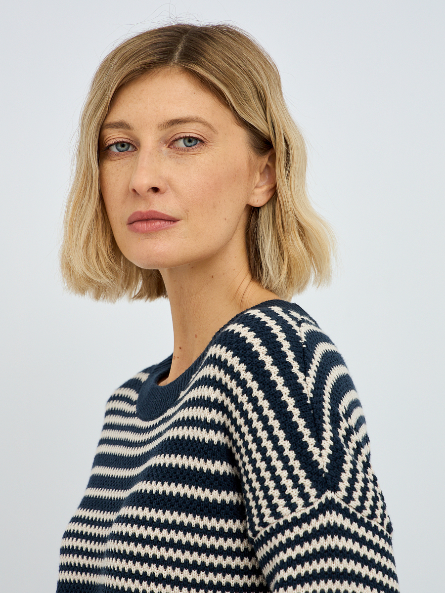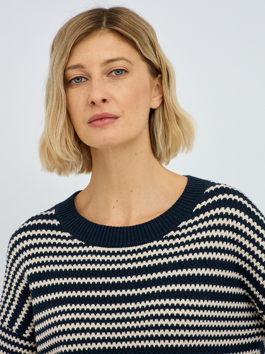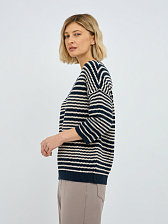 Рифленая фактура полоски не только добавляет изысканности, но и создает интересную игру текстур, делая джемпер визуально привлекательным. Синий цвет – это классика, которая всегда остается в тренде, легко сочетается с другими оттенками и придает образу глубину и благородство.