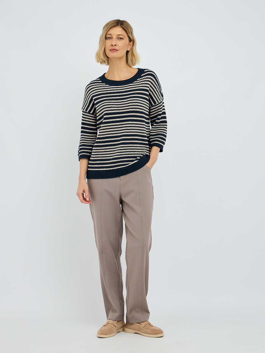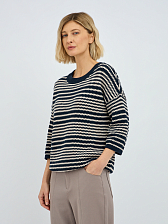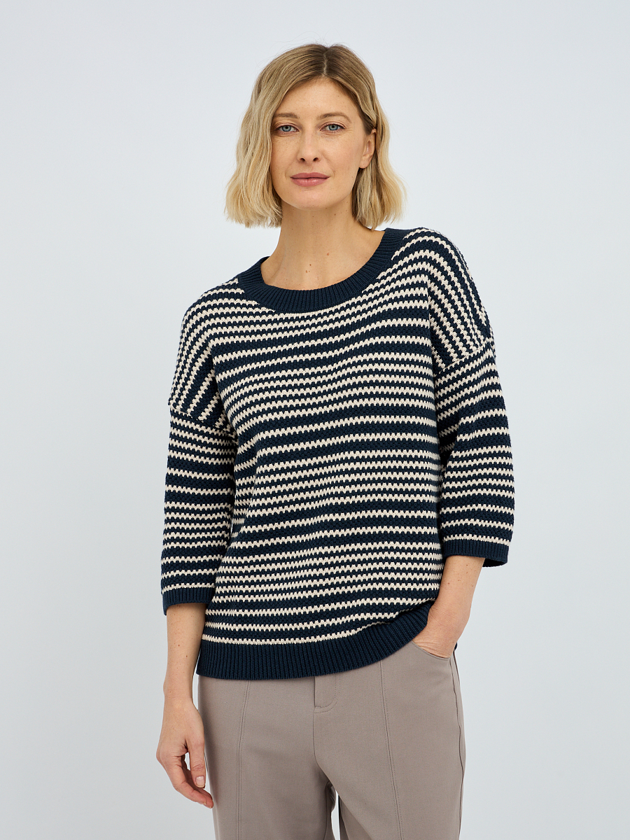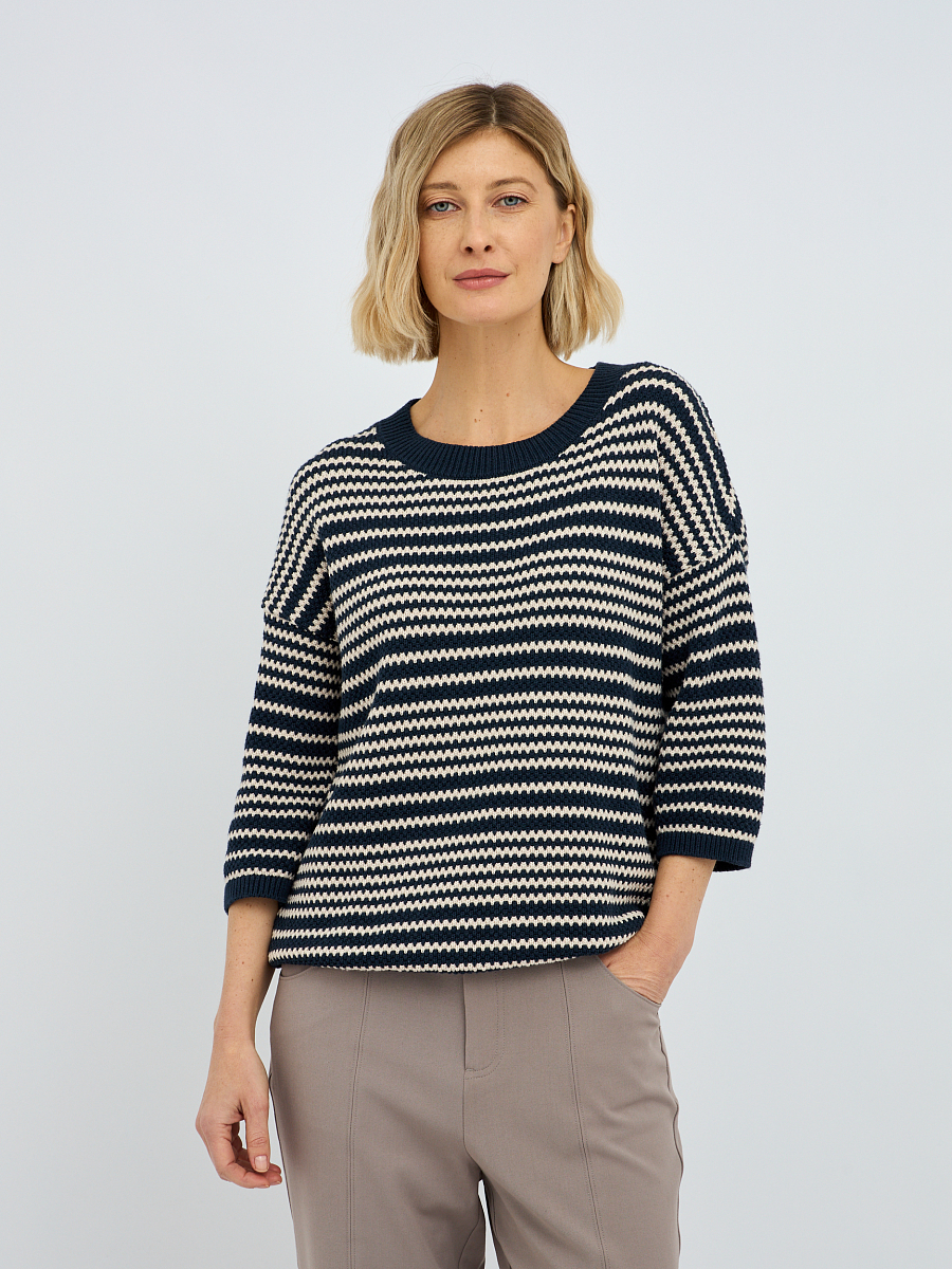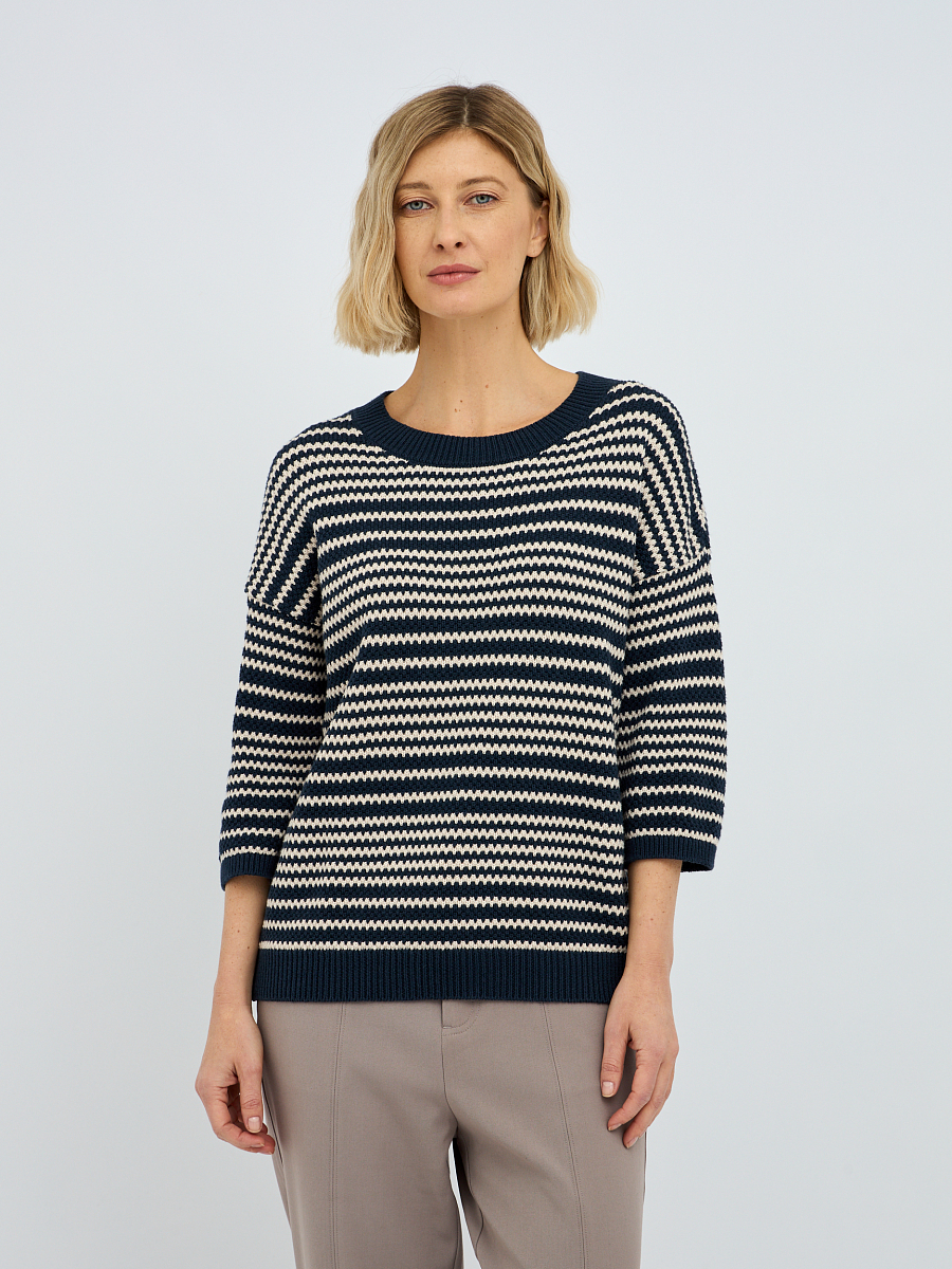 Рифленая фактура полоски не только добавляет изысканности, но и создает интересную игру текстур, делая джемпер визуально привлекательным. Синий цвет – это классика, которая всегда остается в тренде, легко сочетается с другими оттенками и придает образу глубину и благородство.