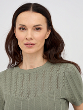 Особое внимание привлекает оригинальный дизайн джемпера: перфорированный орнамент создает интересный визуальный эффект, добавляя изделию легкости и ажурности, что делает его идеальным выбором для создания как повседневных, так и более нарядных образов. Объемные строчки подчеркивают фактуру материала и добавляют глубины дизайну, делая этот джемпер настоящим произведением искусства.