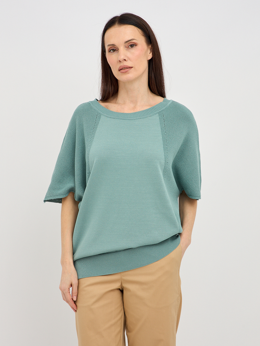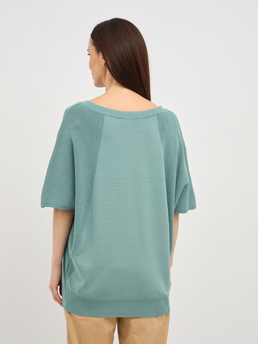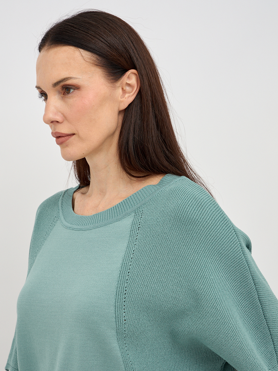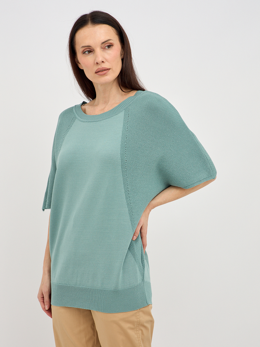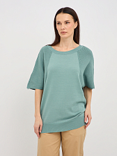 Этот удлиненный женский джемпер в спокойном зеленом цвете станет изысканным дополнением вашего гардероба. Свободный силуэт обеспечивает максимальный комфорт и легкость движений, подчеркивая непринужденный стиль. Спущенное плечо и рукав три четверти придают образу современный и стильный вид.