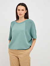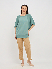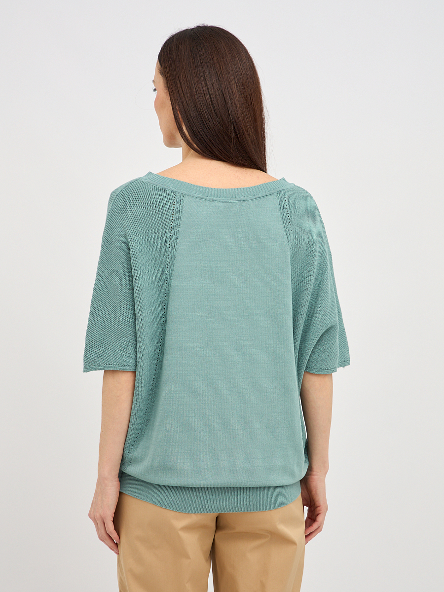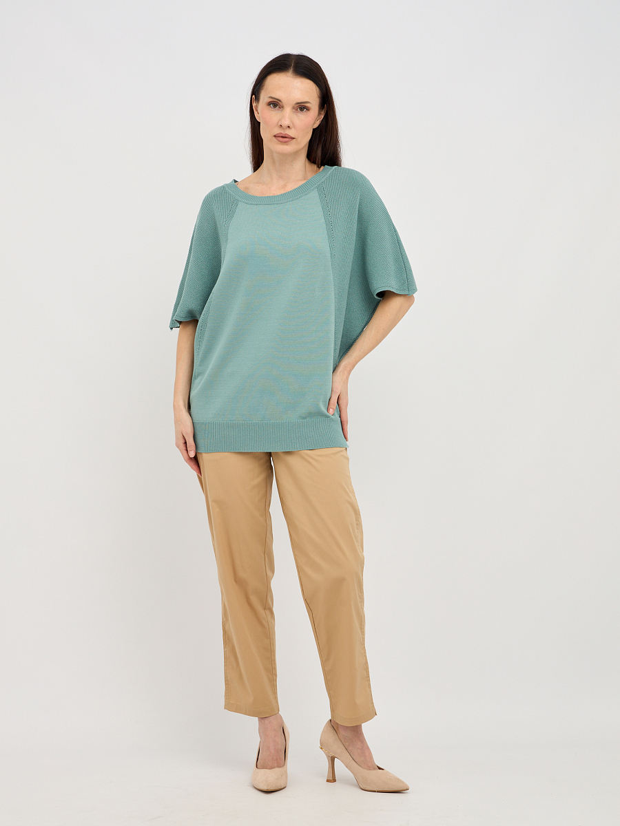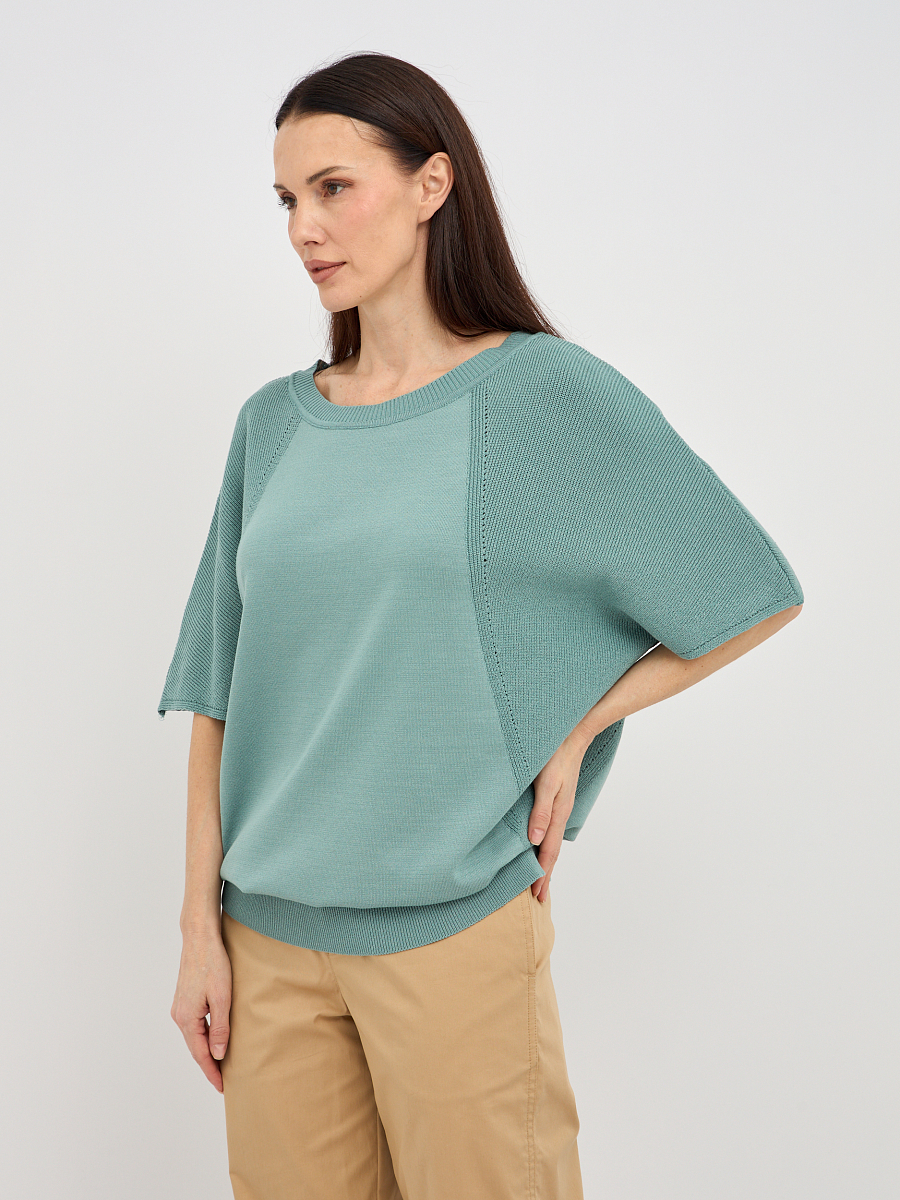 Этот удлиненный женский джемпер в спокойном зеленом цвете станет изысканным дополнением вашего гардероба. Свободный силуэт обеспечивает максимальный комфорт и легкость движений, подчеркивая непринужденный стиль. Спущенное плечо и рукав три четверти придают образу современный и стильный вид.