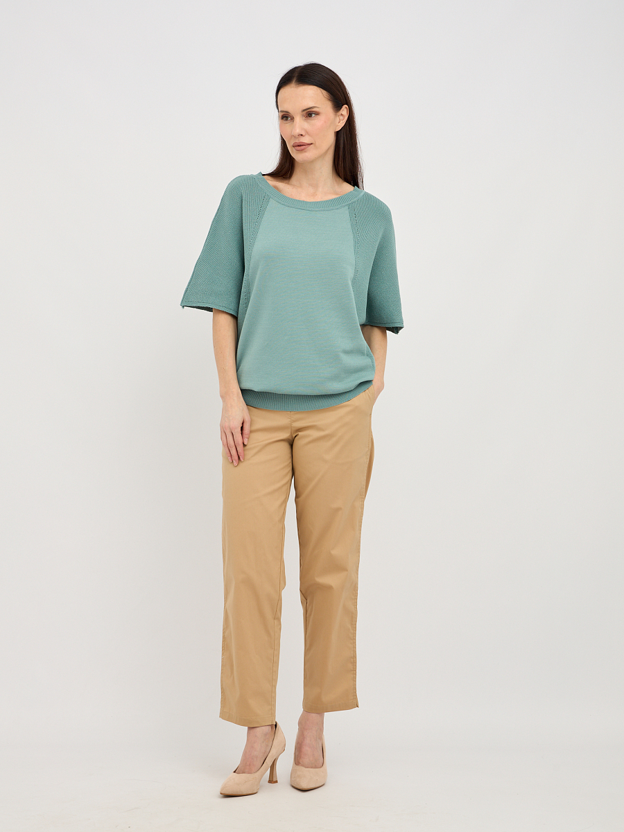 Сочетание вискозы и эластана в составе делает ткань невероятно приятной к телу, даря ощущение мягкости и шелковистости, а также отличную воздухопроницаемость. Благодаря эластану, джемпер прекрасно сохраняет форму, не сковывает движений и устойчив к износу, что гарантирует его долговечность.