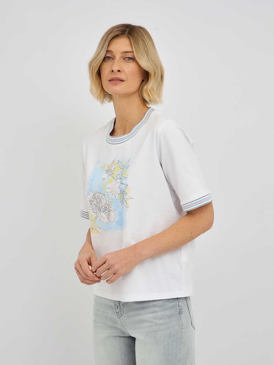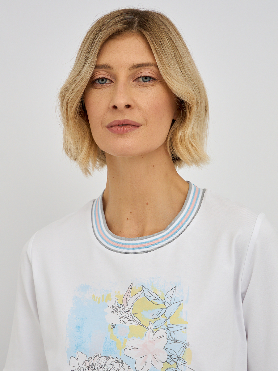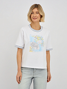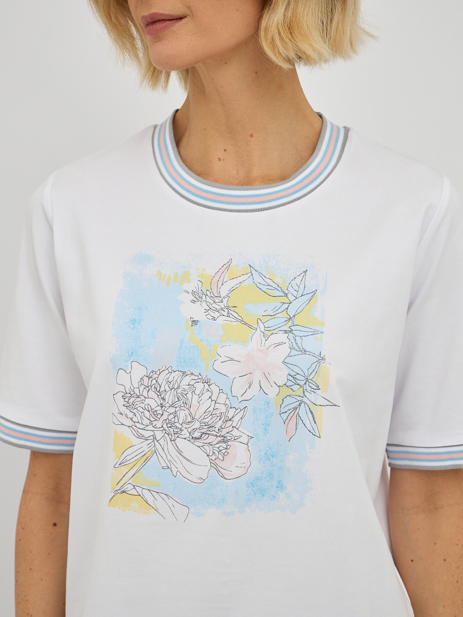 Эта модель отличается утонченным дизайном, подчеркивающим вашу индивидуальность. Контрастная окантовка по вырезу горловины и на рукавах придает футболке особую изысканность, делая ее не просто базовой вещью, а настоящим модным акцентом. Центральным элементом дизайна является оригинальный принт, который притягивает взгляды. Изысканное сочетание цветов и форм создает неповторимый образ. Особое очарование принту придают мерцающие стразы, которые добавляют нотку гламура и праздничности, преображая даже самый простой образ.