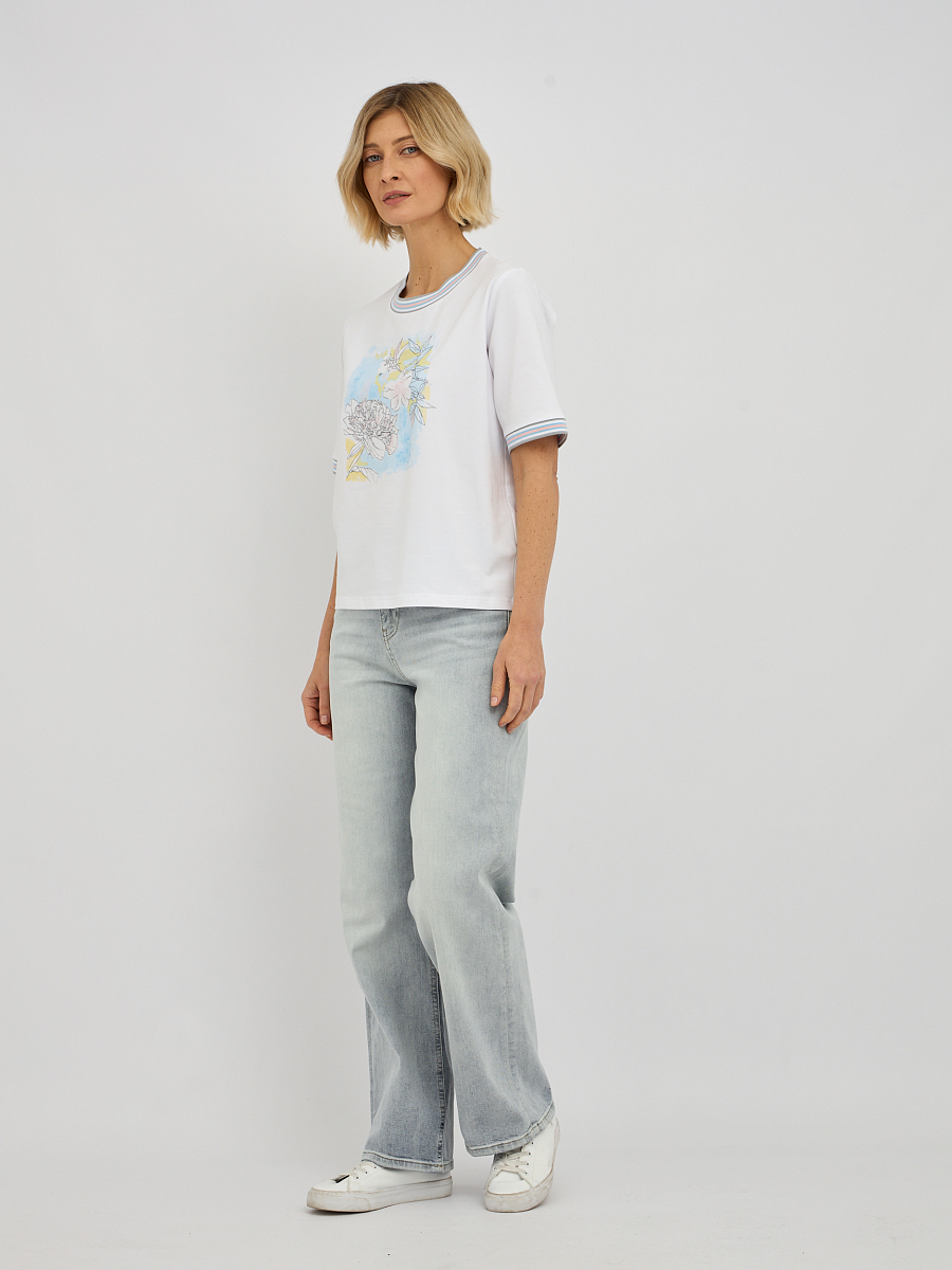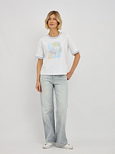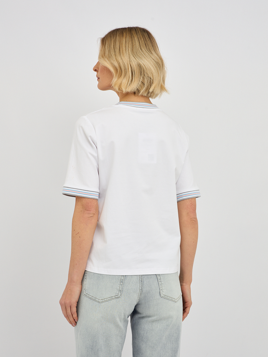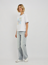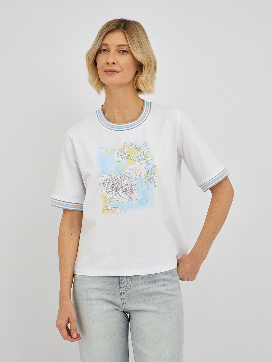 Эта модель отличается утонченным дизайном, подчеркивающим вашу индивидуальность. Контрастная окантовка по вырезу горловины и на рукавах придает футболке особую изысканность, делая ее не просто базовой вещью, а настоящим модным акцентом. Центральным элементом дизайна является оригинальный принт, который притягивает взгляды. Изысканное сочетание цветов и форм создает неповторимый образ. Особое очарование принту придают мерцающие стразы, которые добавляют нотку гламура и праздничности, преображая даже самый простой образ.