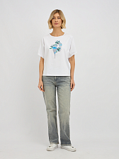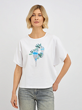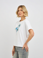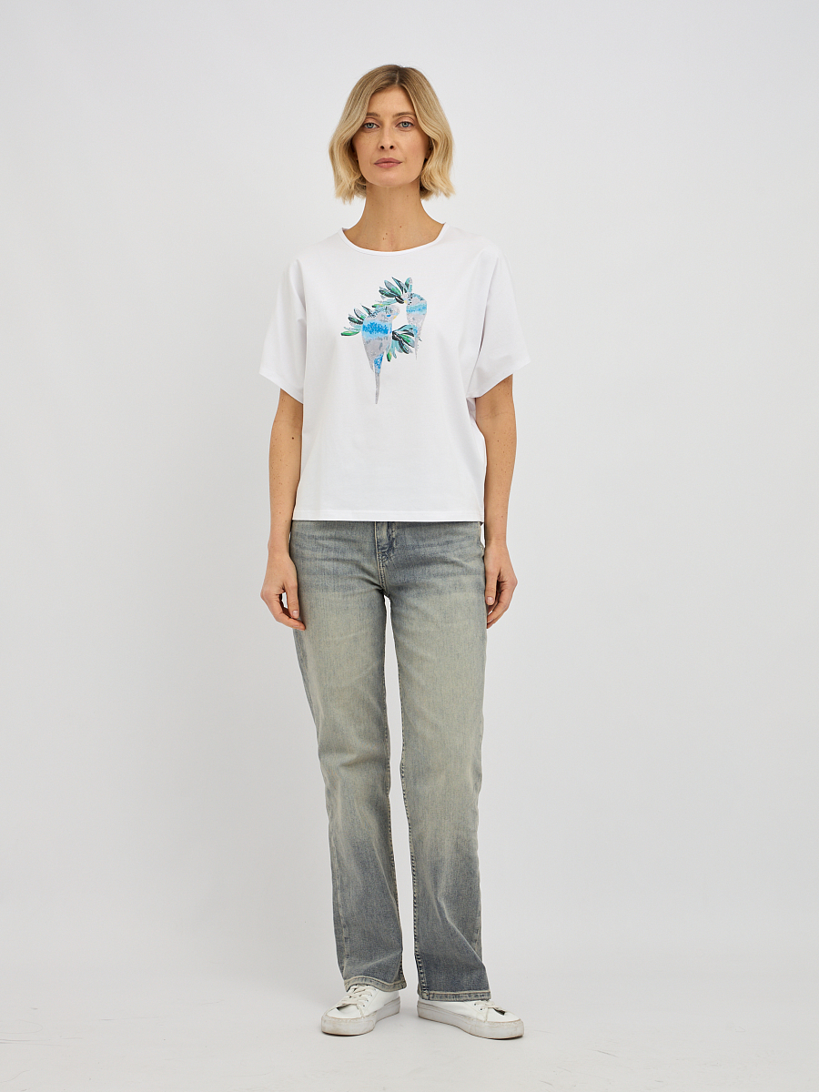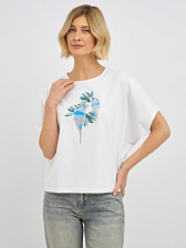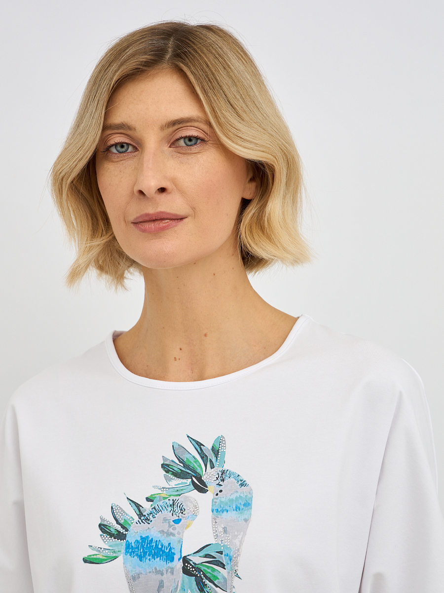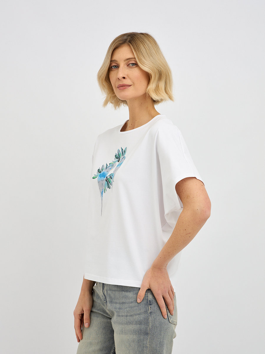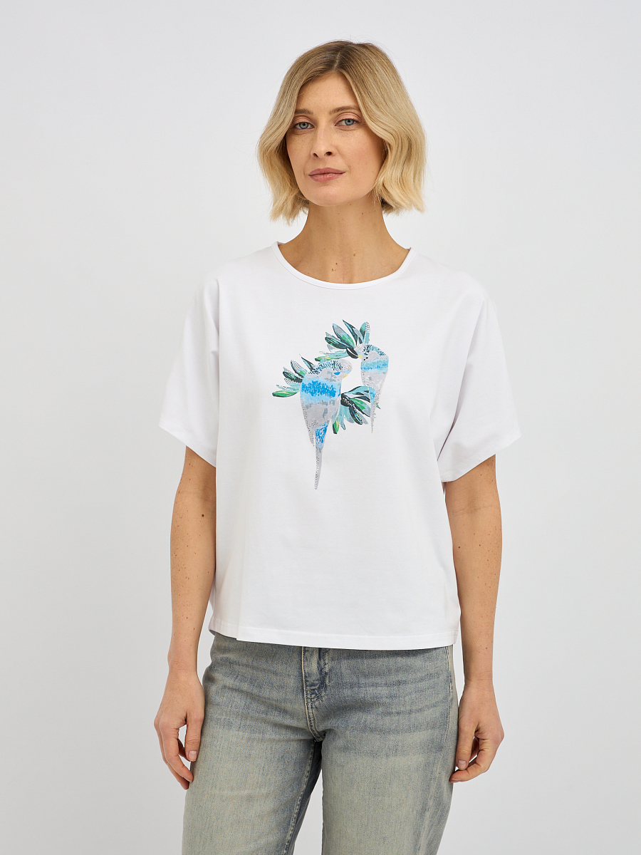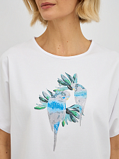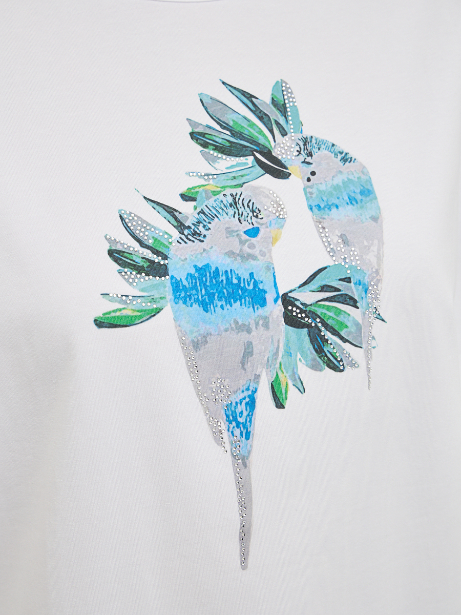футболка женская в белом цвете с принтом попугаев с добавлением страз