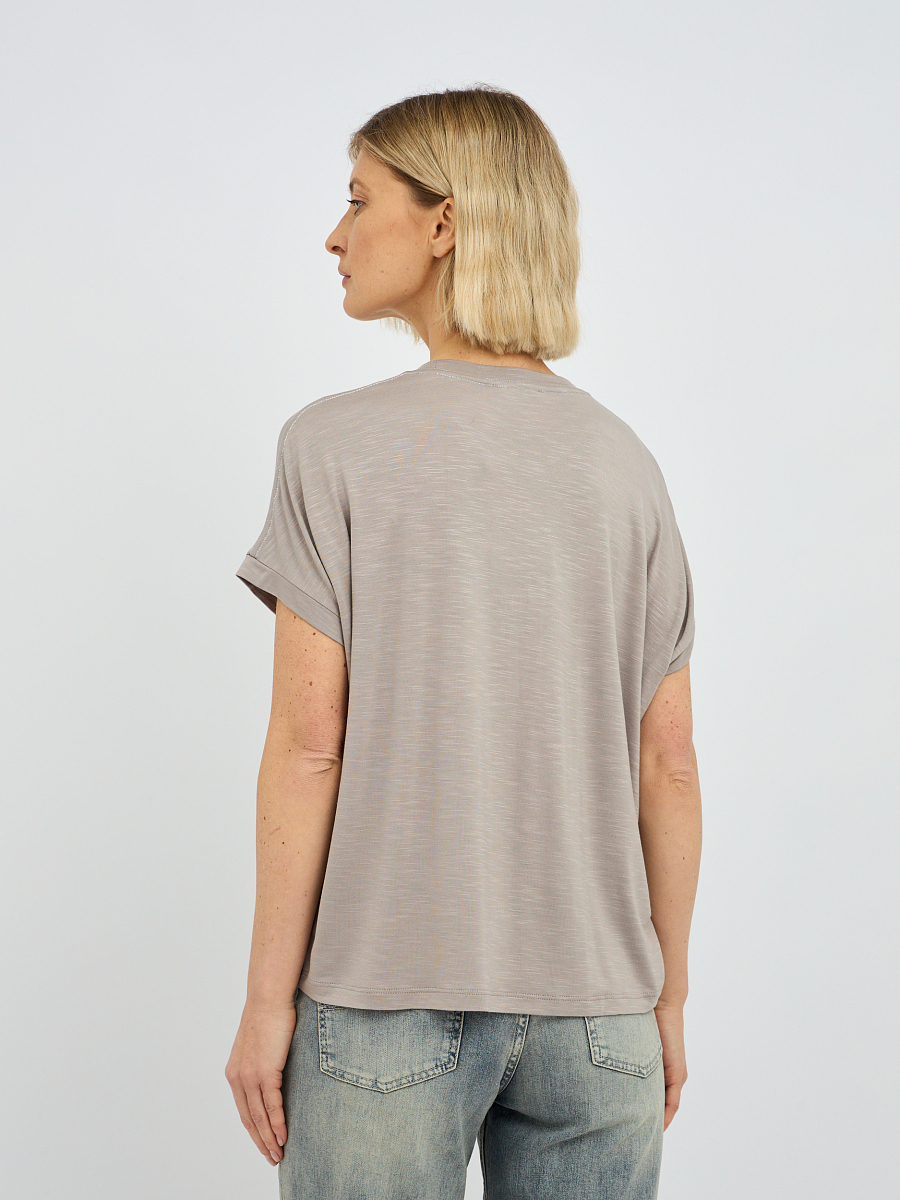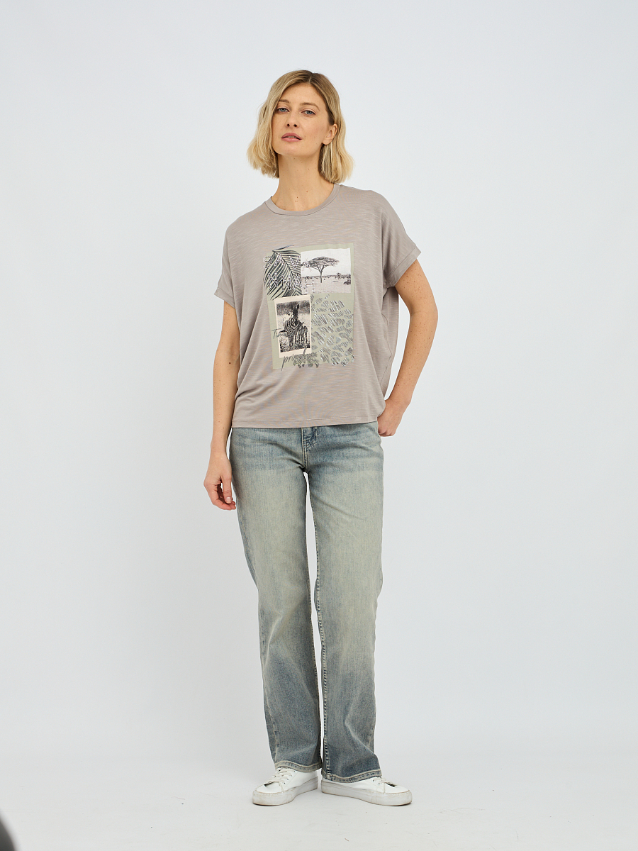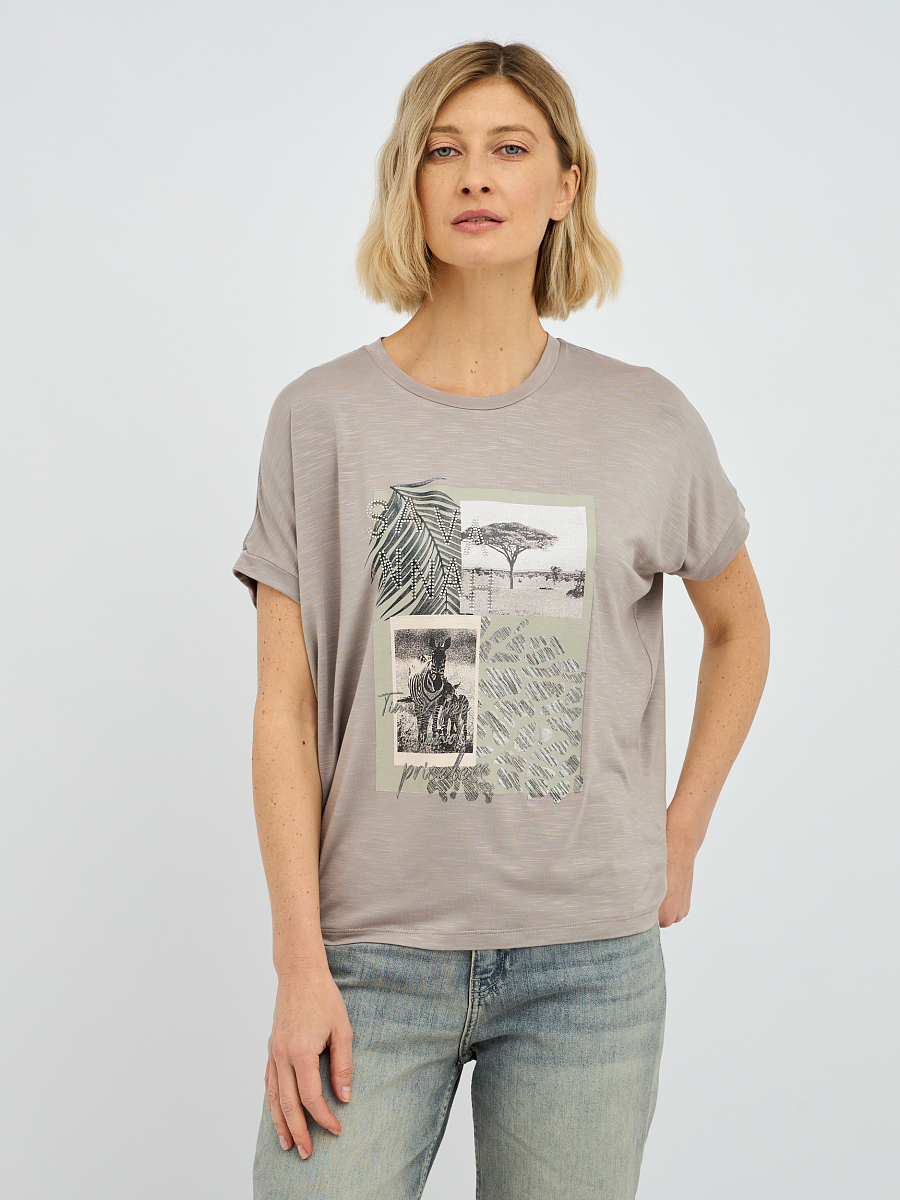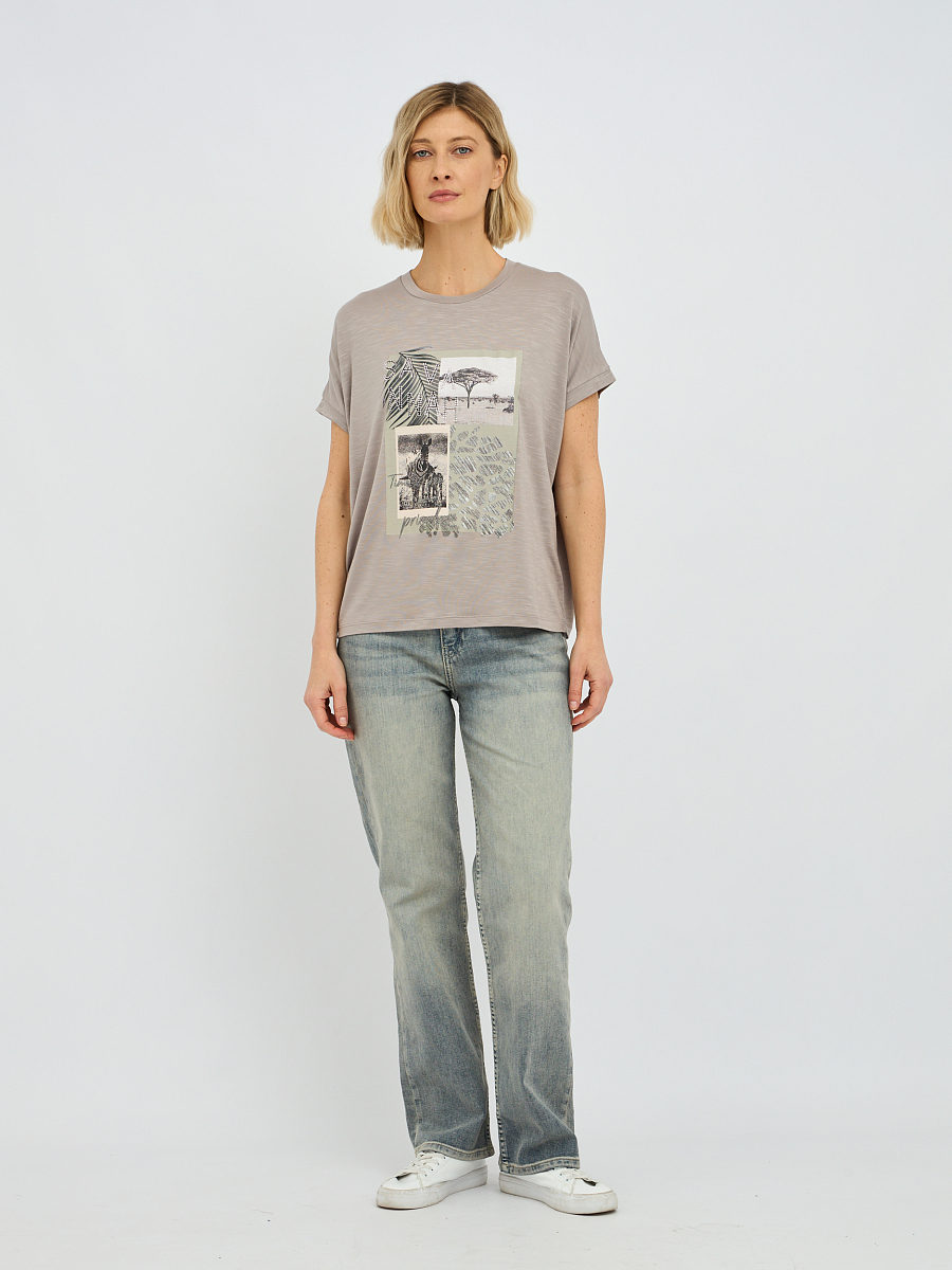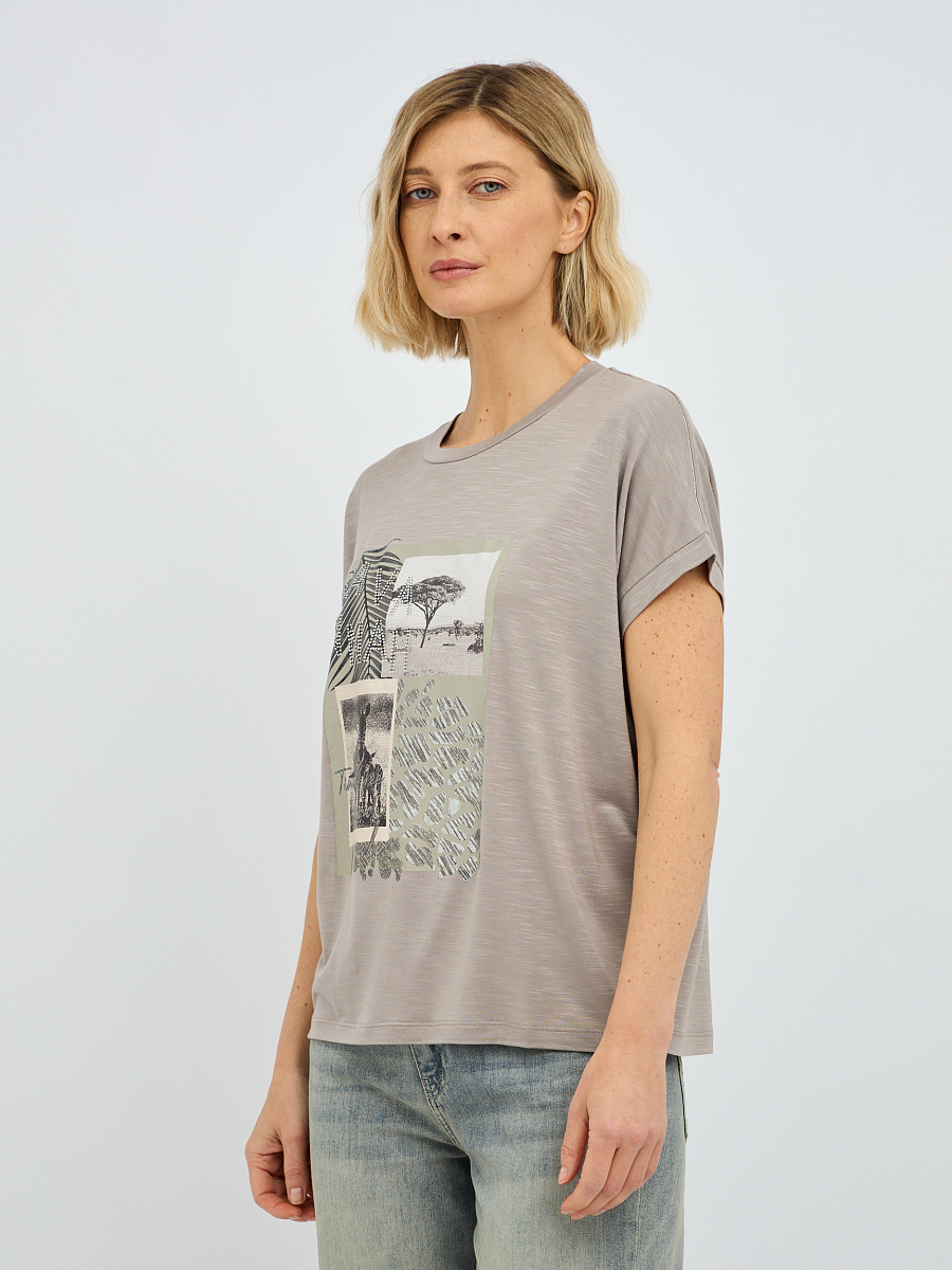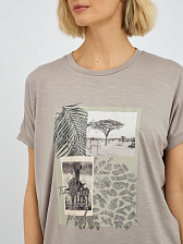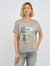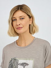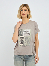 футболка женская в серо - бежевом цвете с принтом и добавлением страз