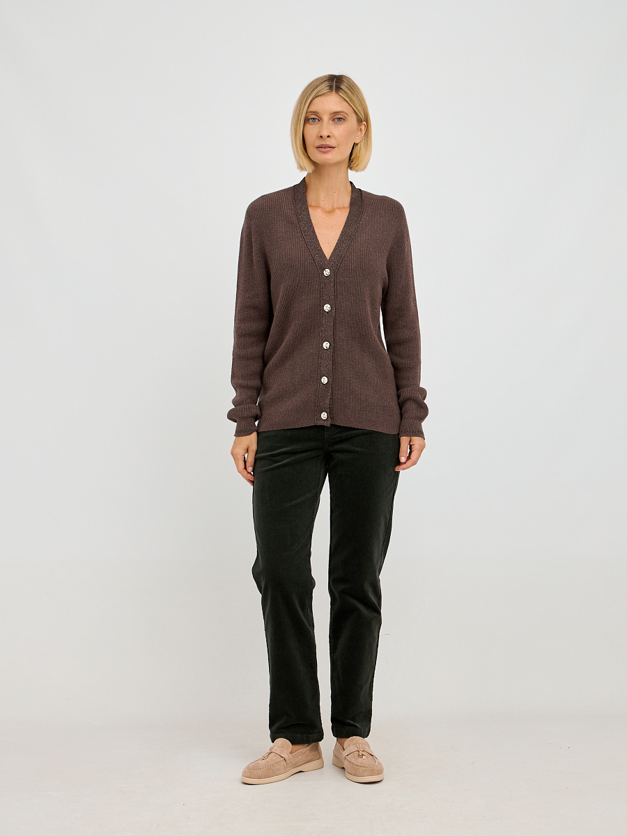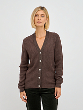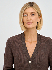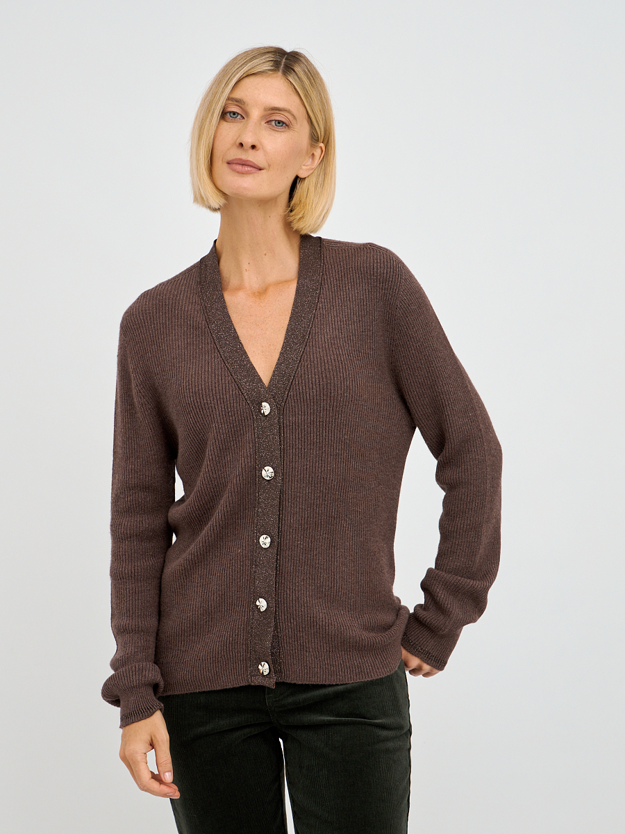 Этот женский кардиган в благородном коричневом оттенке – воплощение утонченности и современного стиля, дополненное мерцающим люрексом.