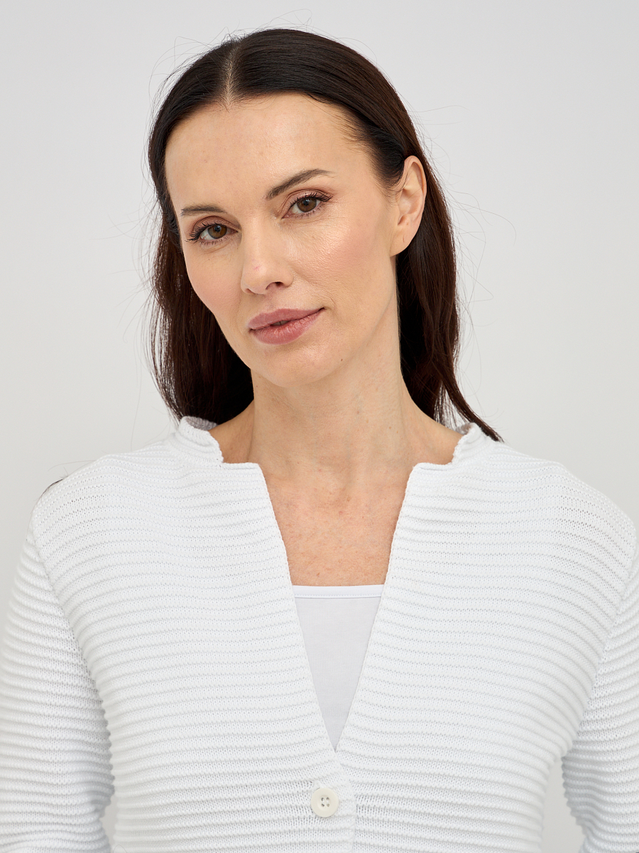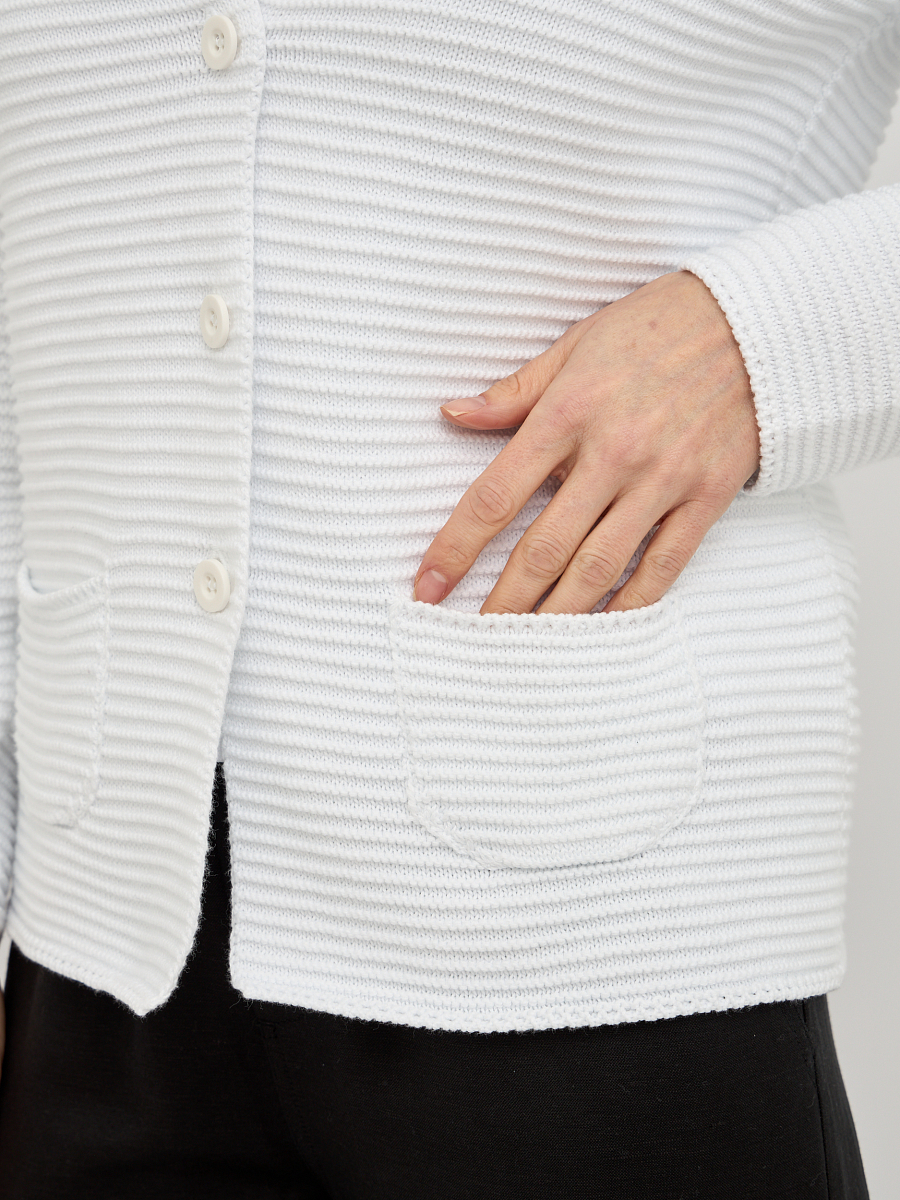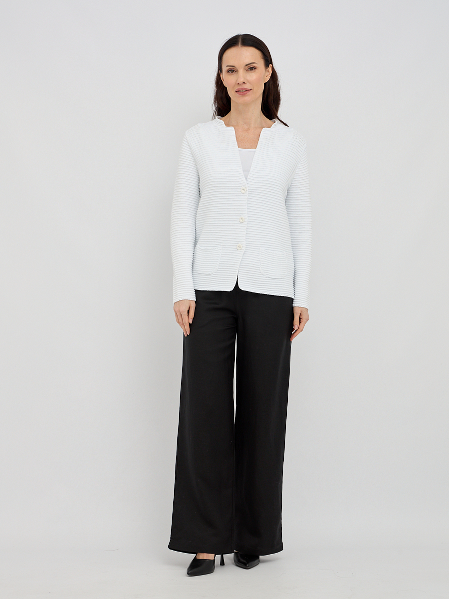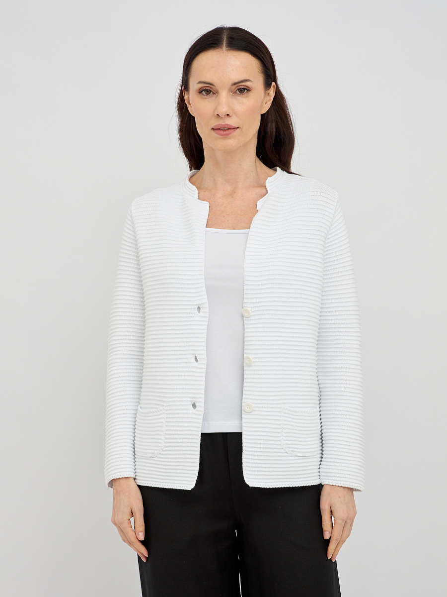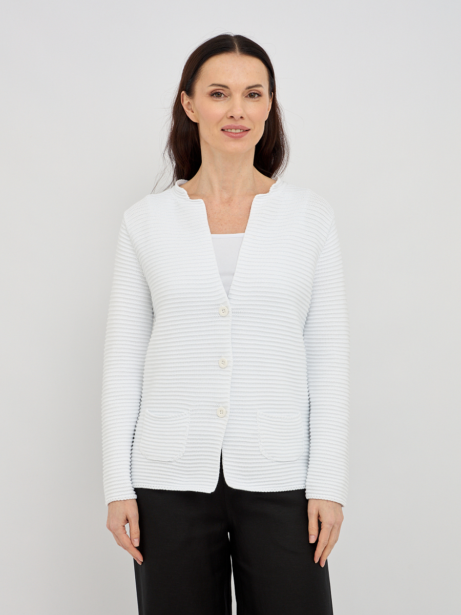 Круглый вырез горловины с мягким фигурным краем добавляет женственности и изящества, а два накладных кармана по бокам не только служат стильным акцентом, но и обеспечивают дополнительное удобство, позволяя держать под рукой необходимые мелочи. Классическая застежка на пуговицах придает кардигану завершенный вид и позволяет легко регулировать степень прилегания.