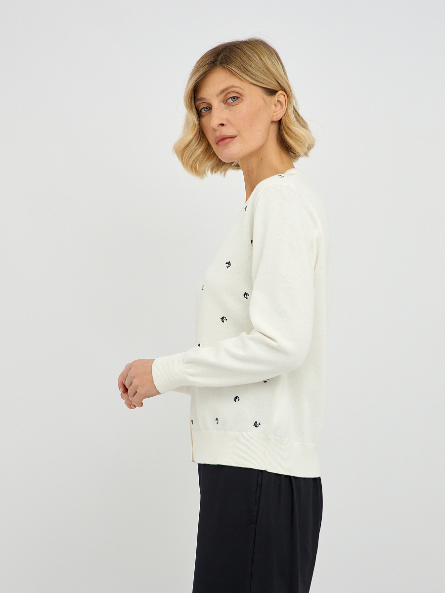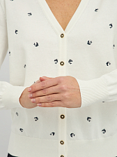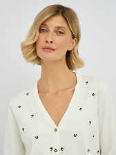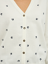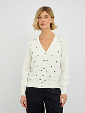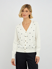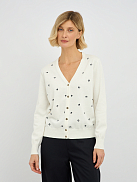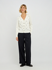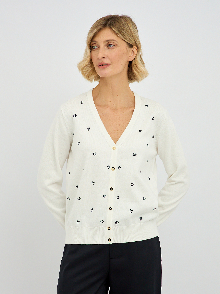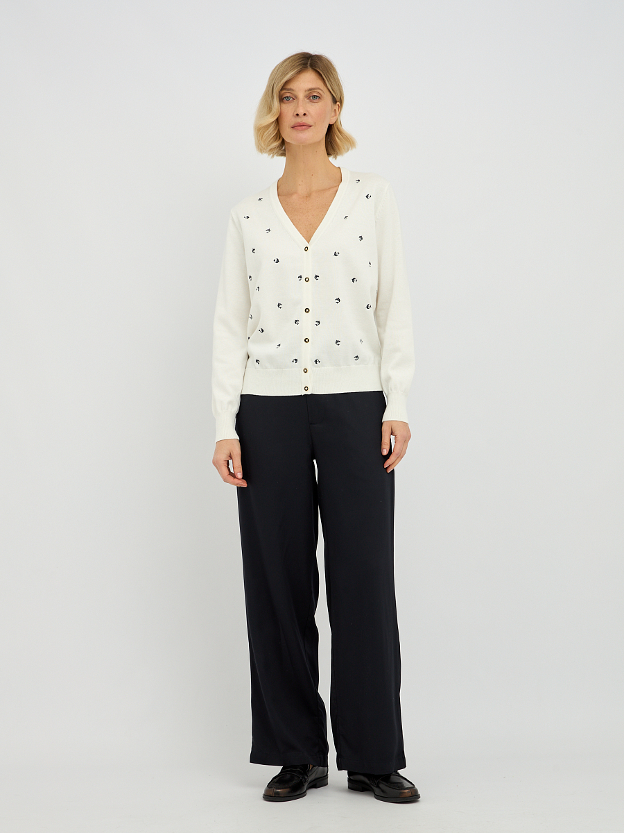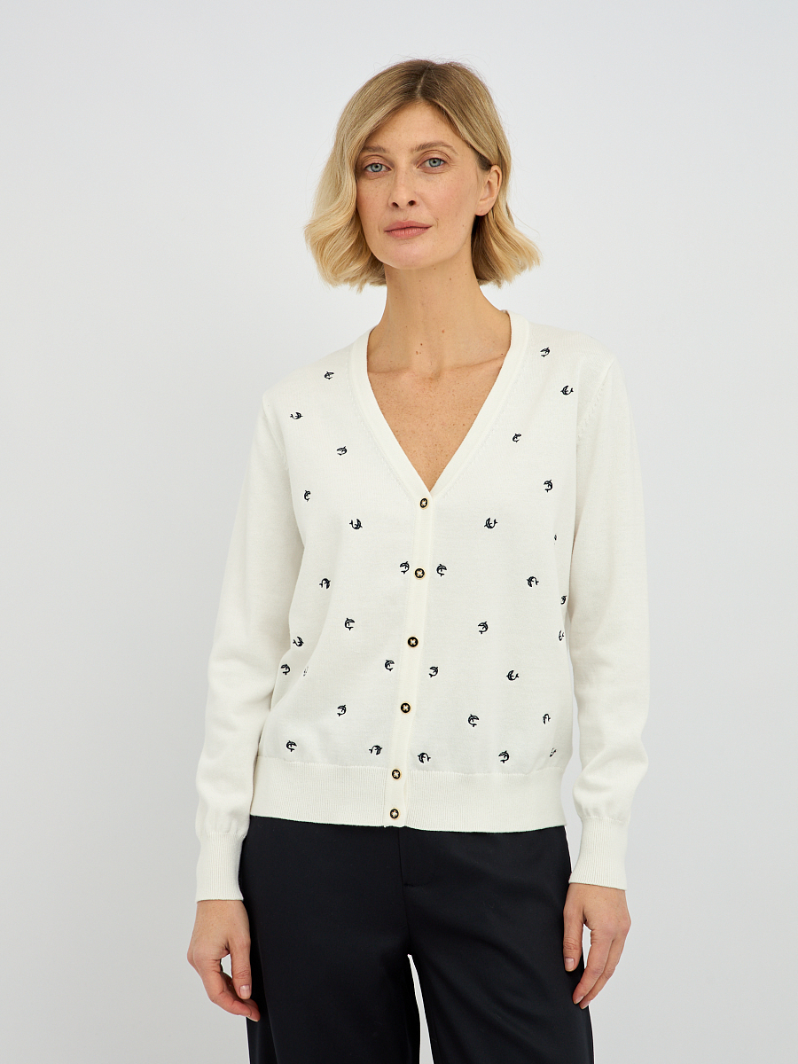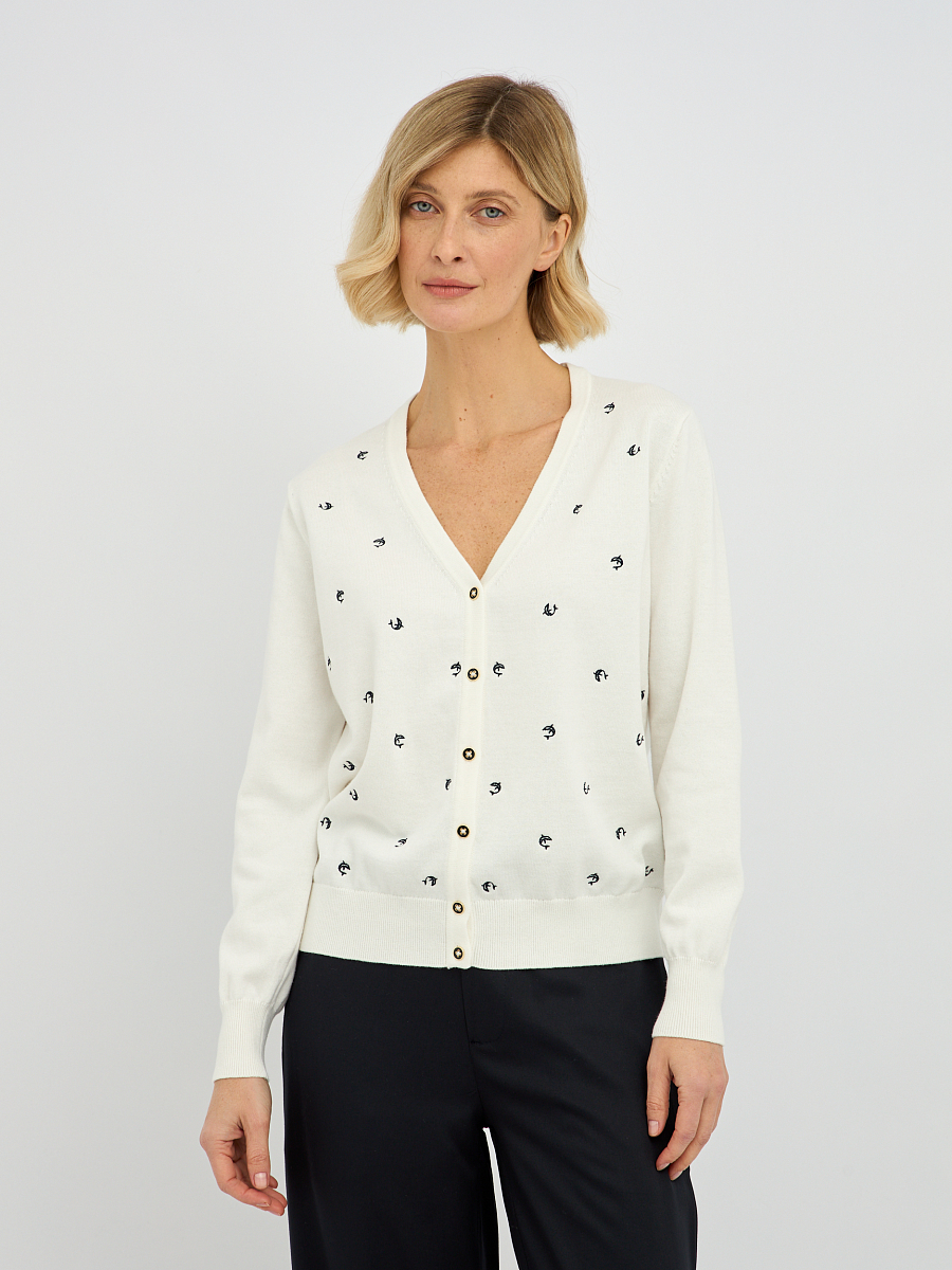 Нежная вышивка, равномерно распределенная по всей поверхности кардигана, придает изделию особый шарм и делает его по-настоящему уникальным. Дизайн с V-образным вырезом визуально удлиняет шею и подчеркивает изящество линии декольте. Прямой крой кардигана обеспечивает свободную посадку, не сковывая движений и делая его универсальным элементом для различных комплектов.