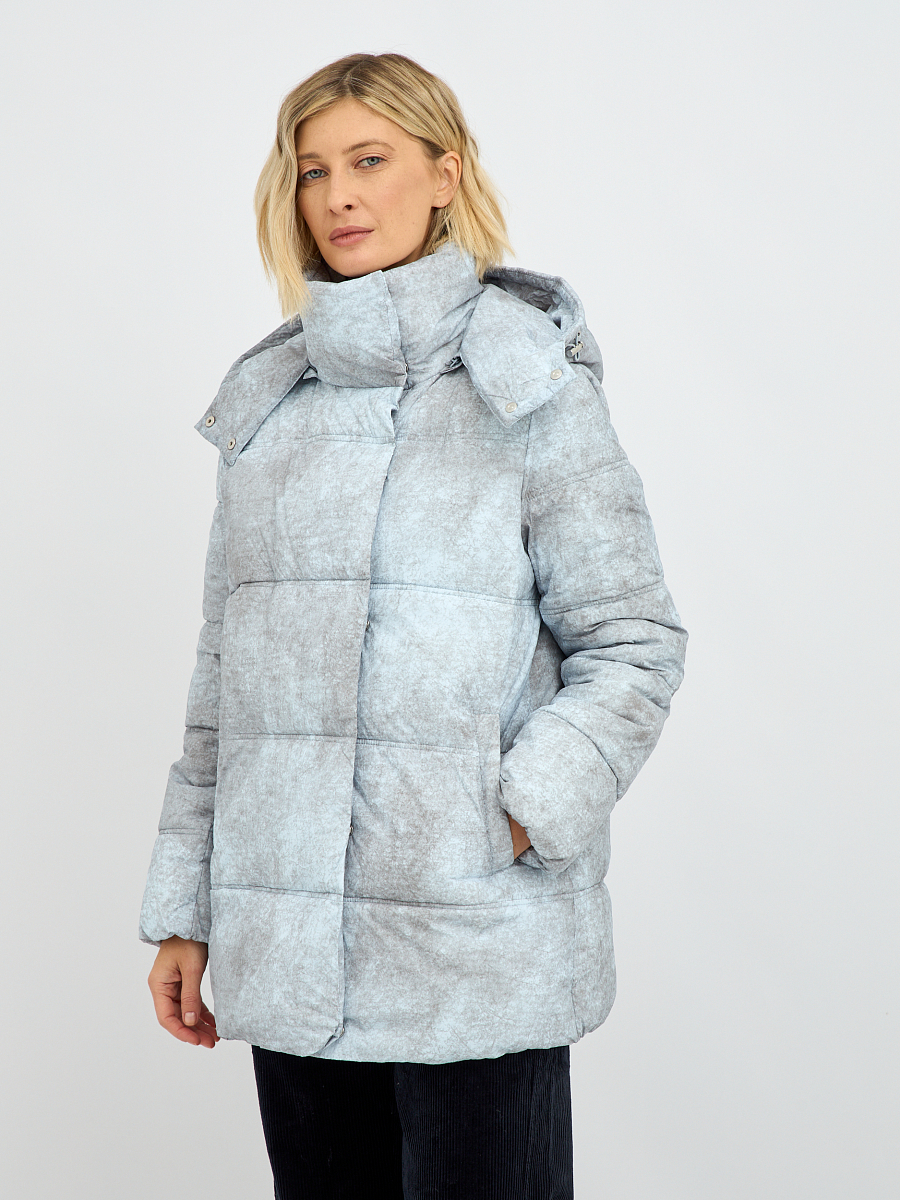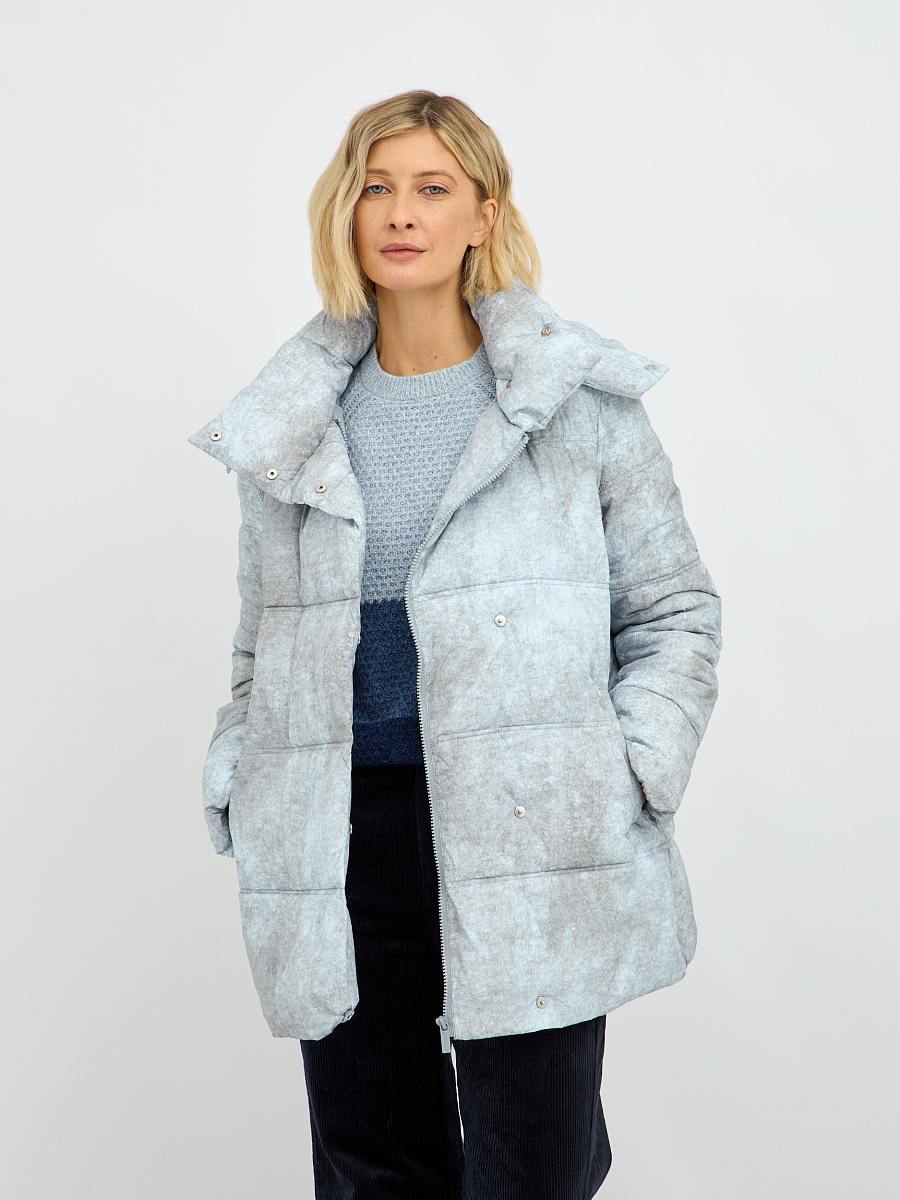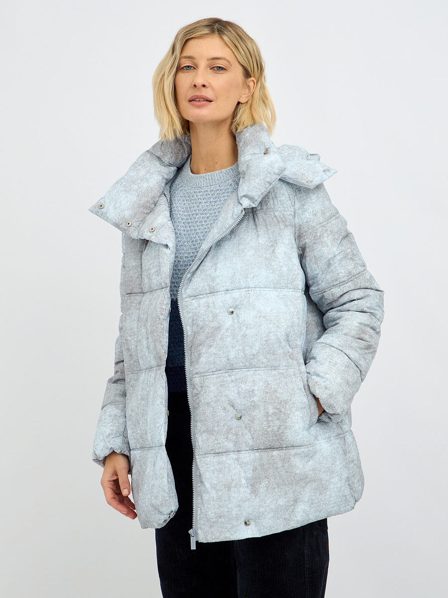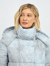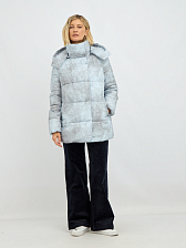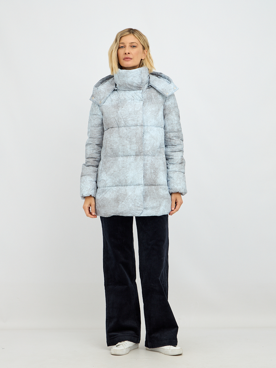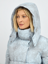 Стильная женская зимняя куртка прямого силуэта выполнена из мягкой ткани с интересным «припылённым» эффектом, который придаёт модели современный и утончённый характер. Светло-голубой оттенок с лёгкой дымкой освежает образ и отлично вписывается в повседневный городской гардероб.