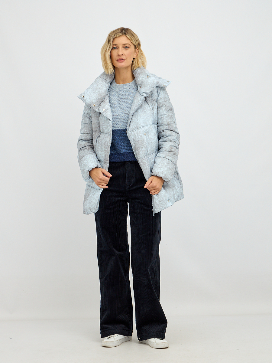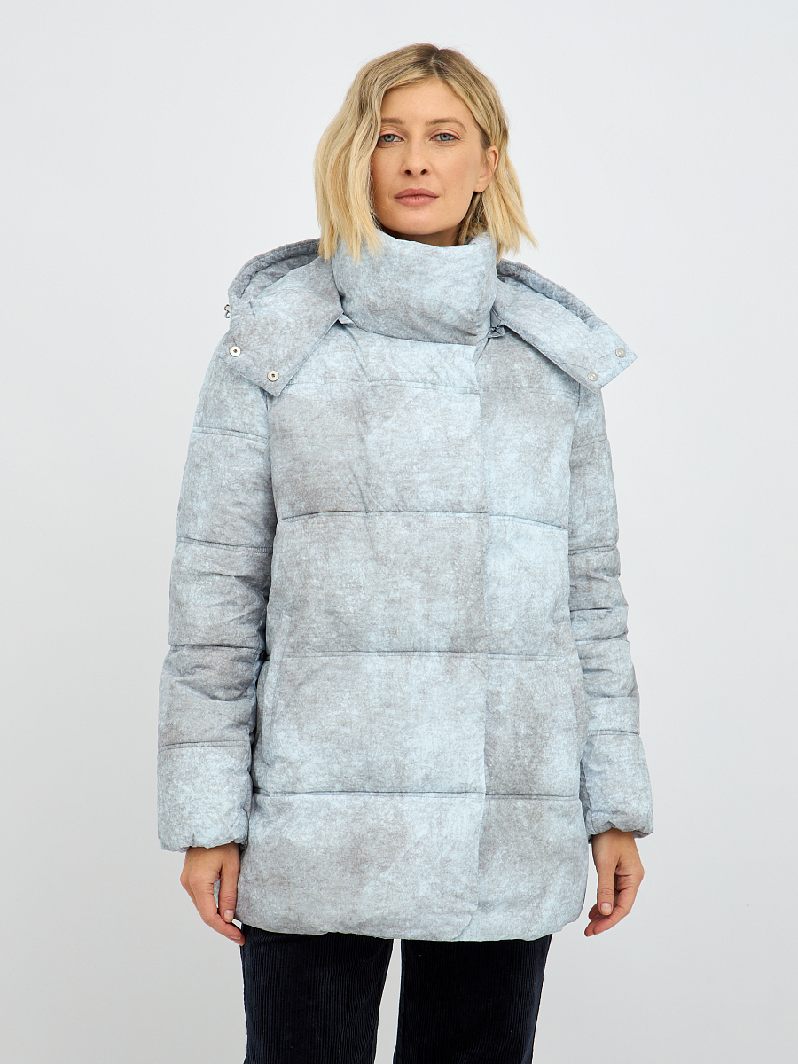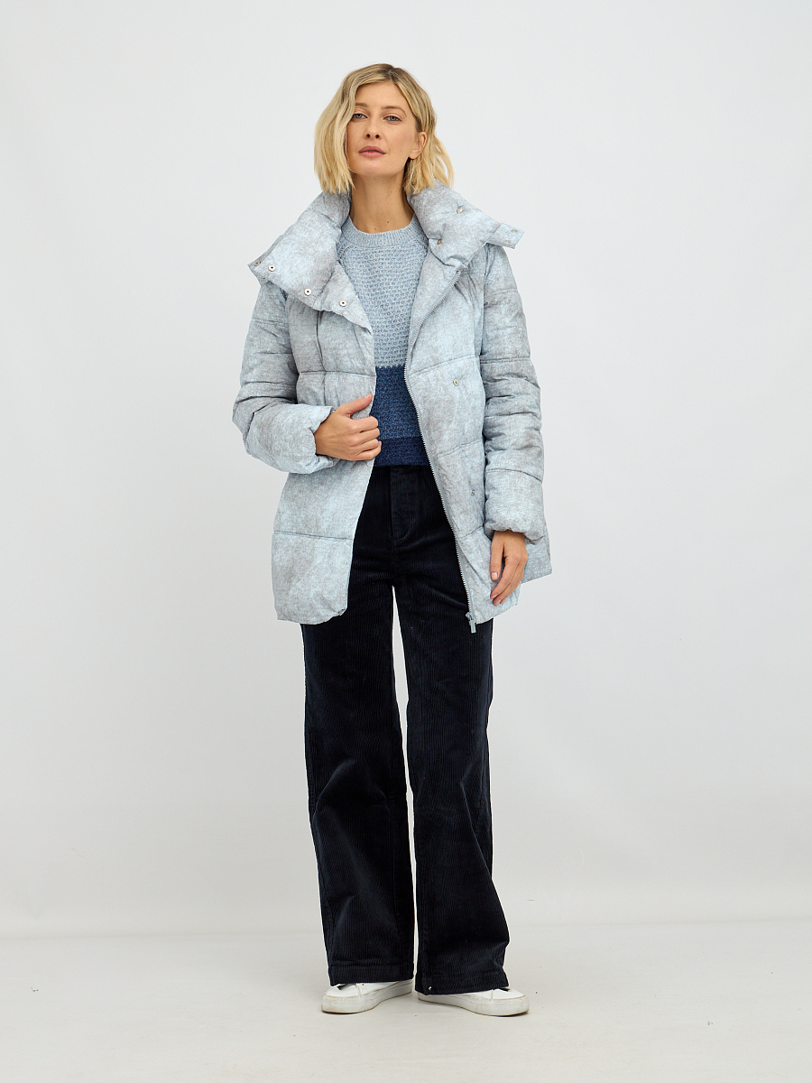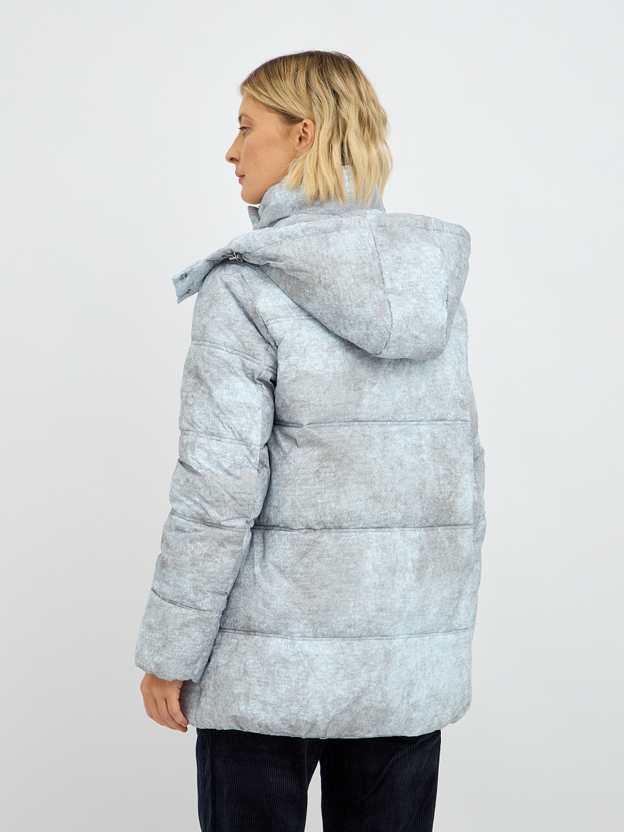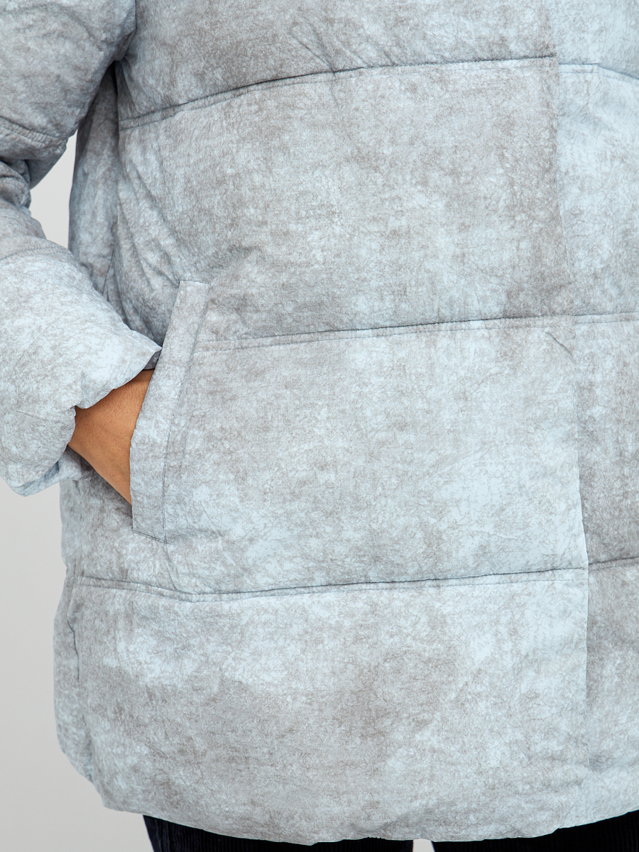 Стильная женская зимняя куртка прямого силуэта выполнена из мягкой ткани с интересным «припылённым» эффектом, который придаёт модели современный и утончённый характер. Светло-голубой оттенок с лёгкой дымкой освежает образ и отлично вписывается в повседневный городской гардероб.