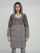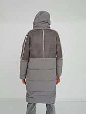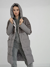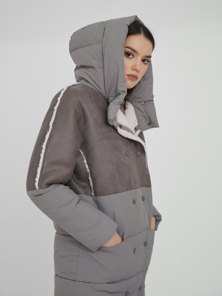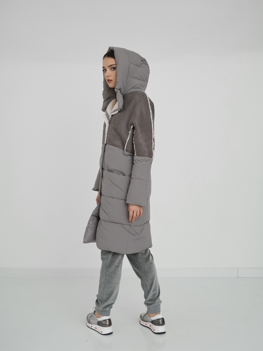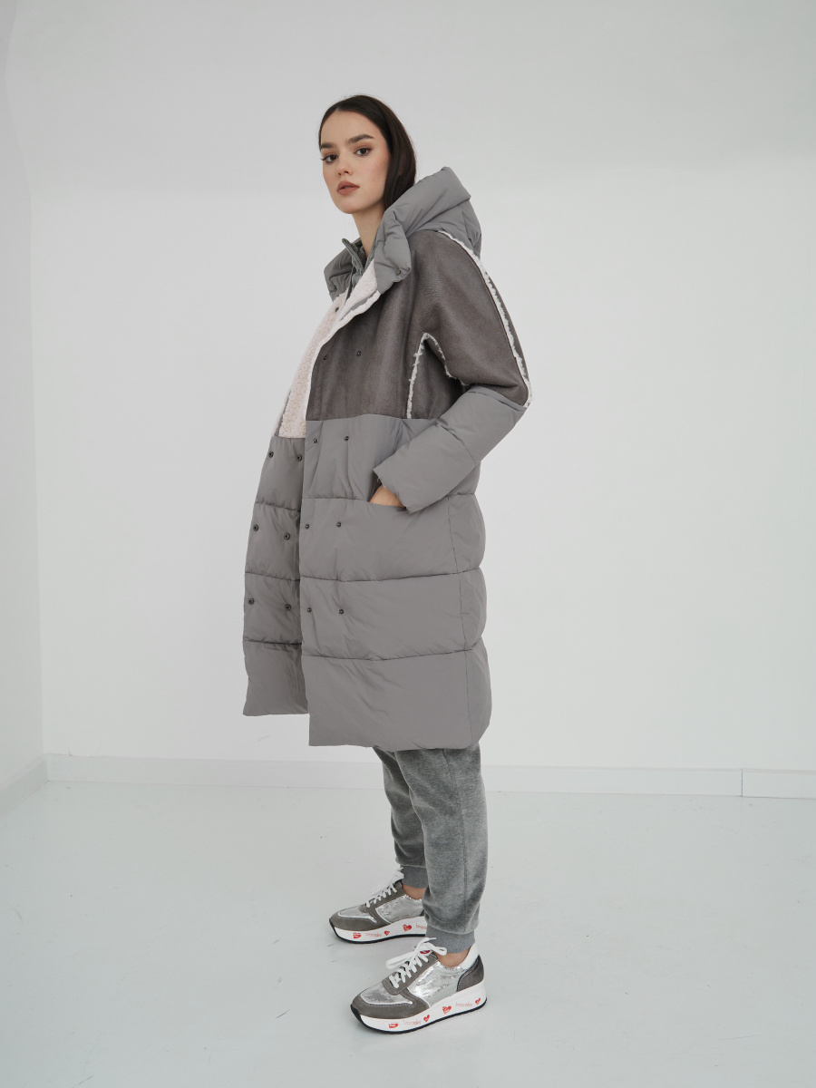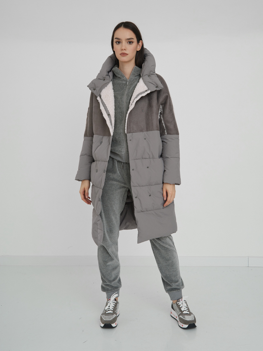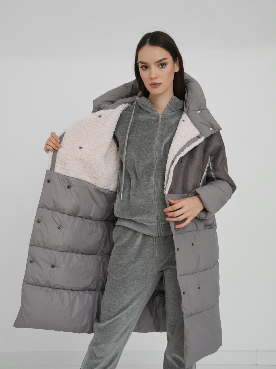 С этим пуховиком можно остаться в той же цветовой гамме и надеть под него серый спортивный костюм. Добавьте сумочку с замысловатым принтом, удобную обувь, и стильный, но максимально уютный образ готов!
