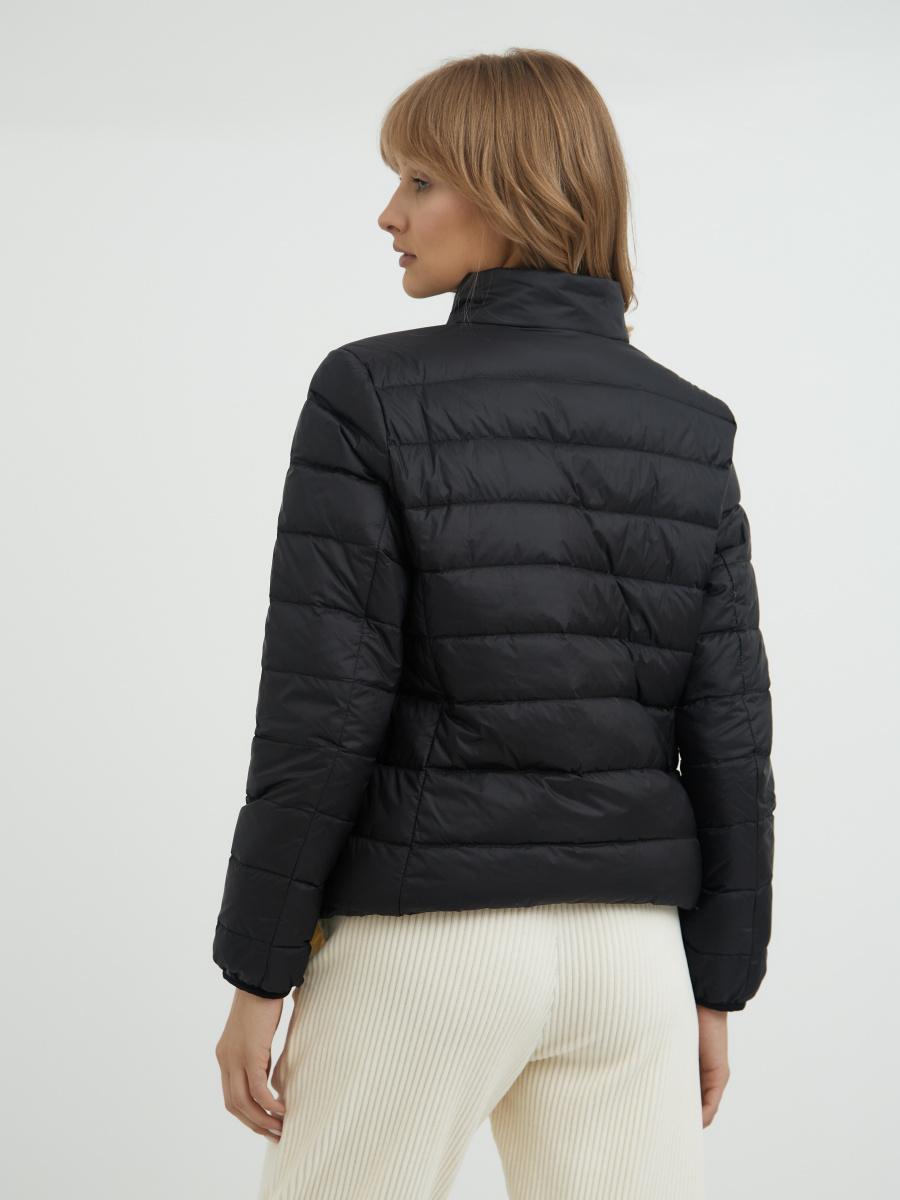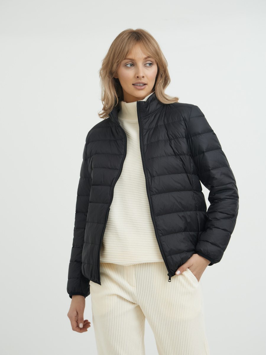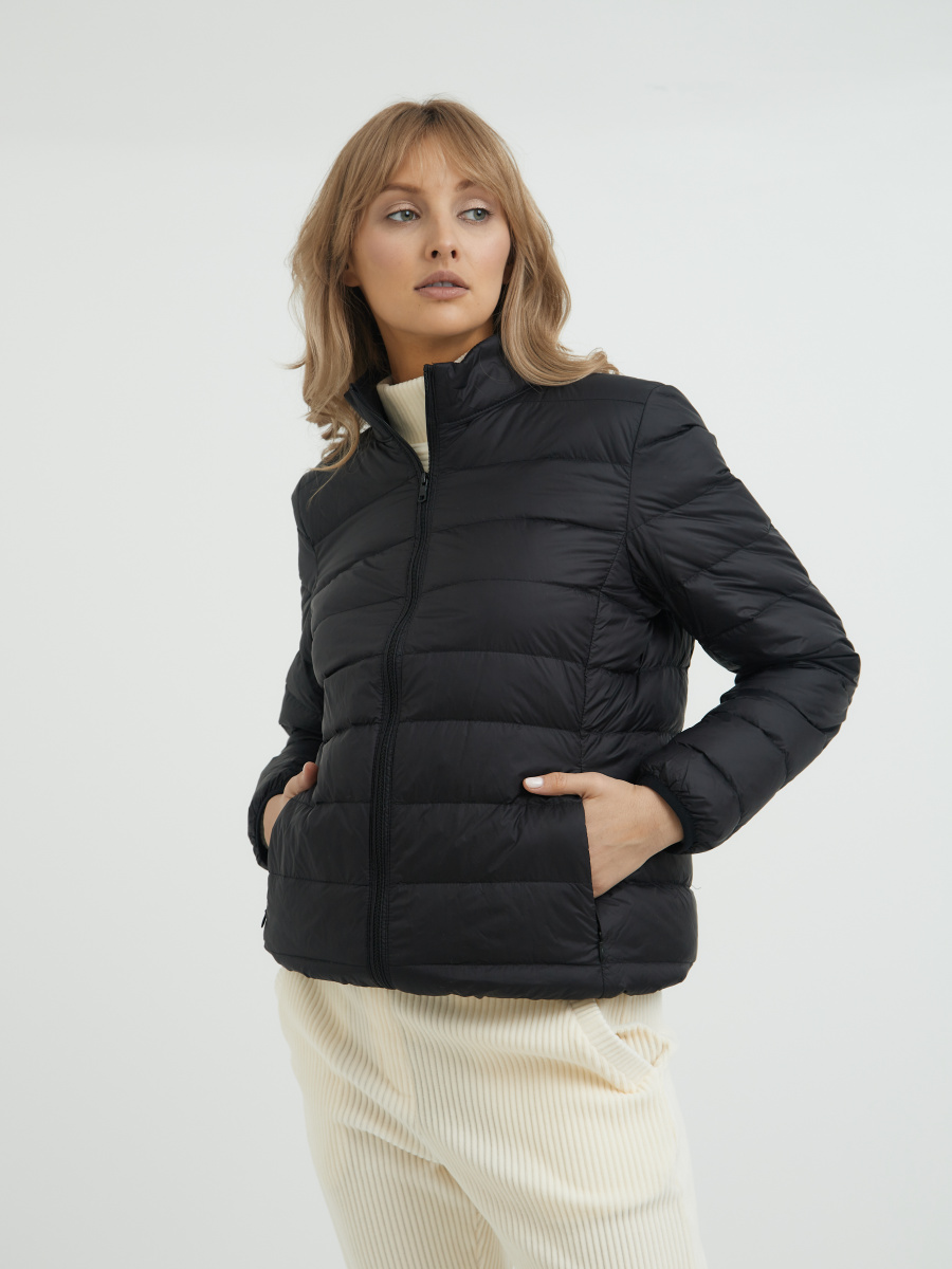 Такая модель пуховика – настоящая находка для тех, кто любит удобство, активный отдых и долгие прогулки. А в сочетании с монохромным спортивным или трикотажным костюмом ваш образ будет ещё стильнее! Смело экспериментируйте с цветами одежды под пуховик. А если не хочется экспериментов – надевайте наш чёрный костюм в рубчик – точно не прогадаете.