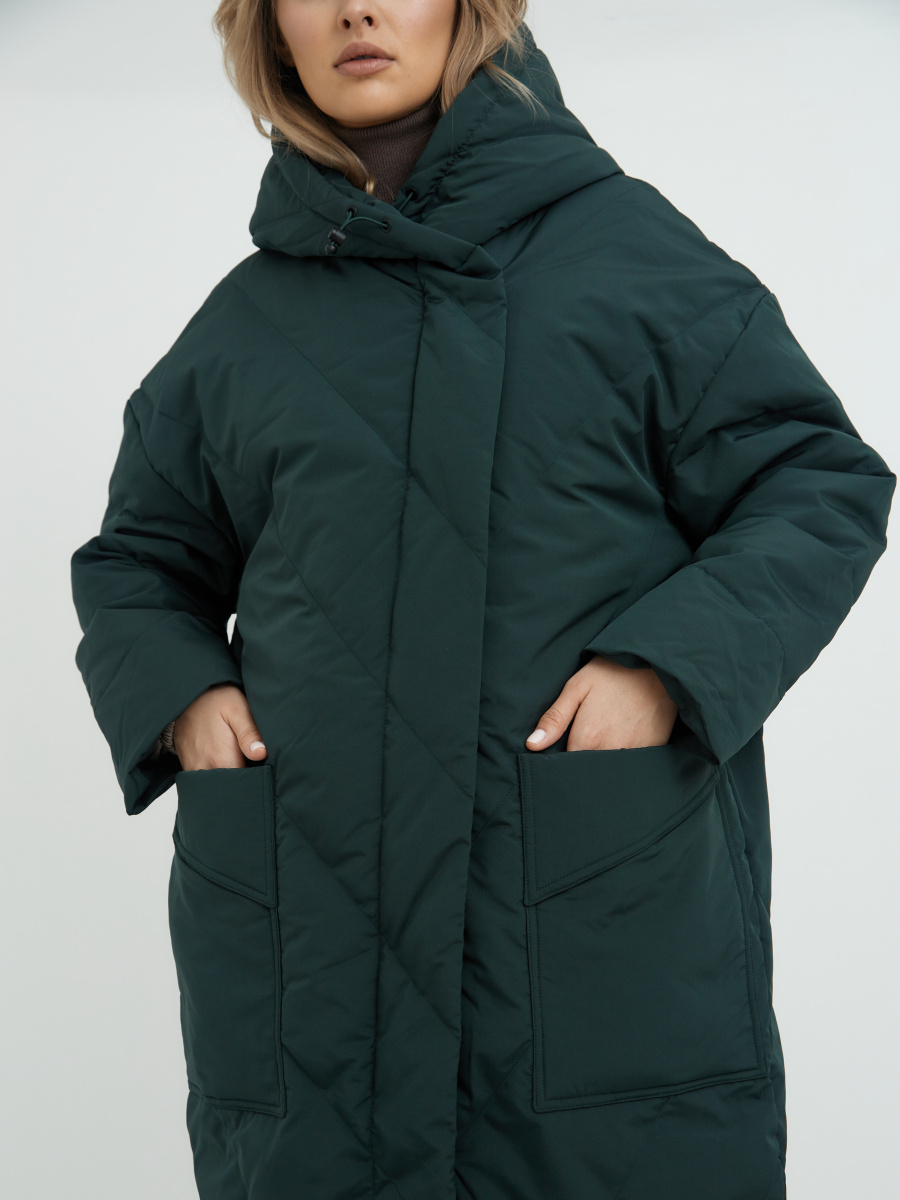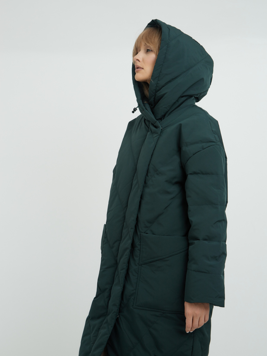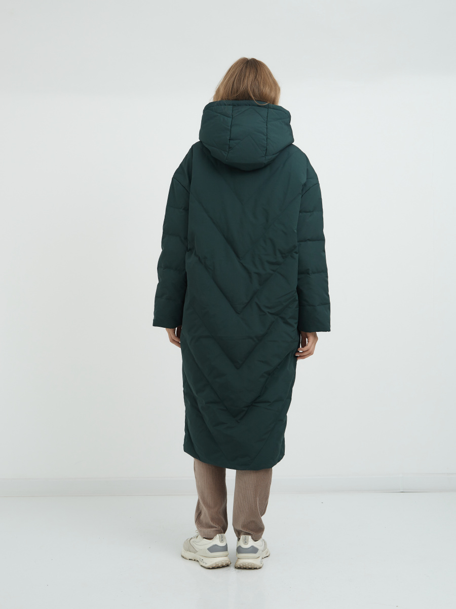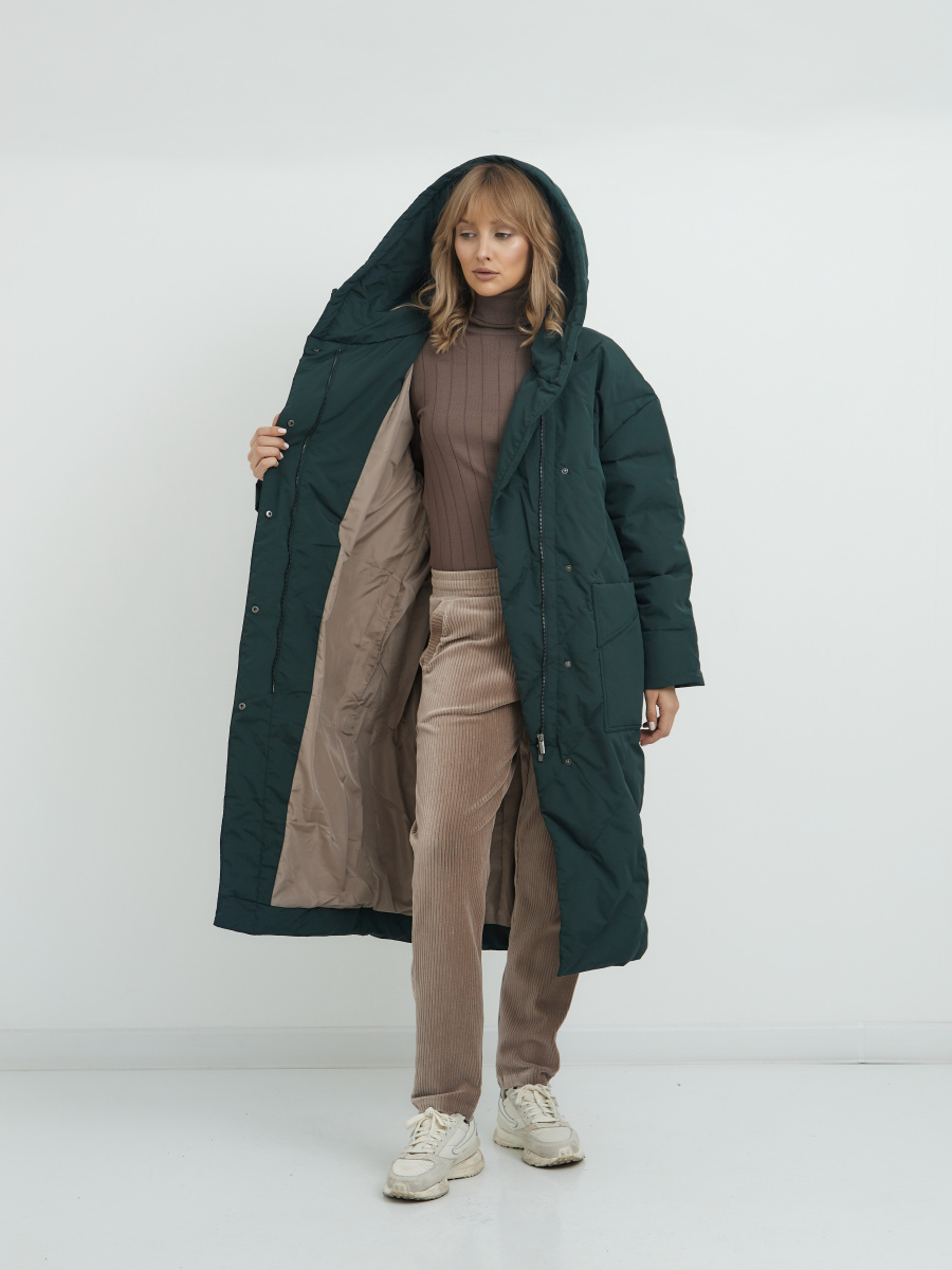 Если вы выбираете тёмно-зелёный пуховик, то смело сочетайте его с коричневыми вещами. Добавьте наши уютнейшие брюки в рубчик и тёплую коричневую водолазку, чтобы закрыть шею. Также у этой модели пуховика есть большой капюшон, который поможет спрятаться от ветра – поэтому в этом образе никакой холод вам не будет страшен!