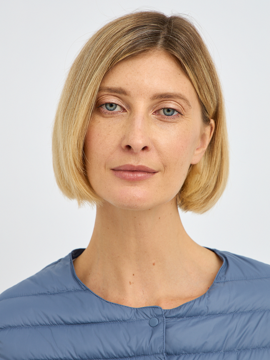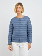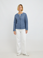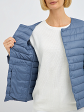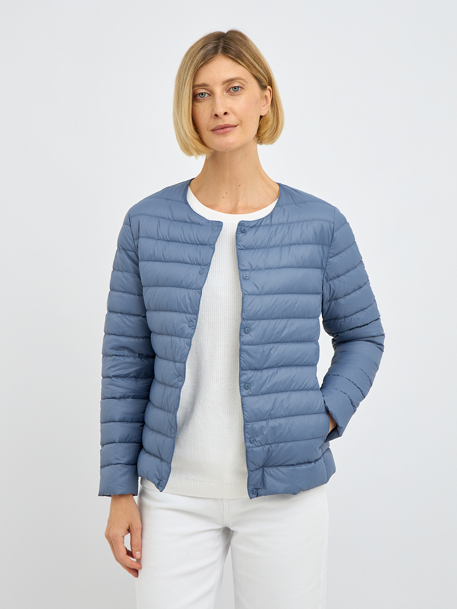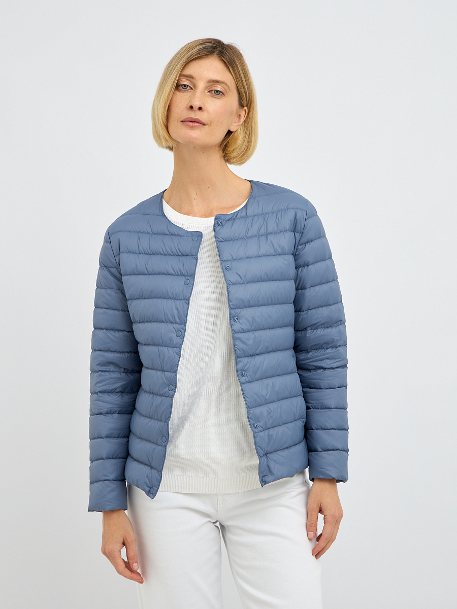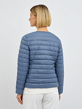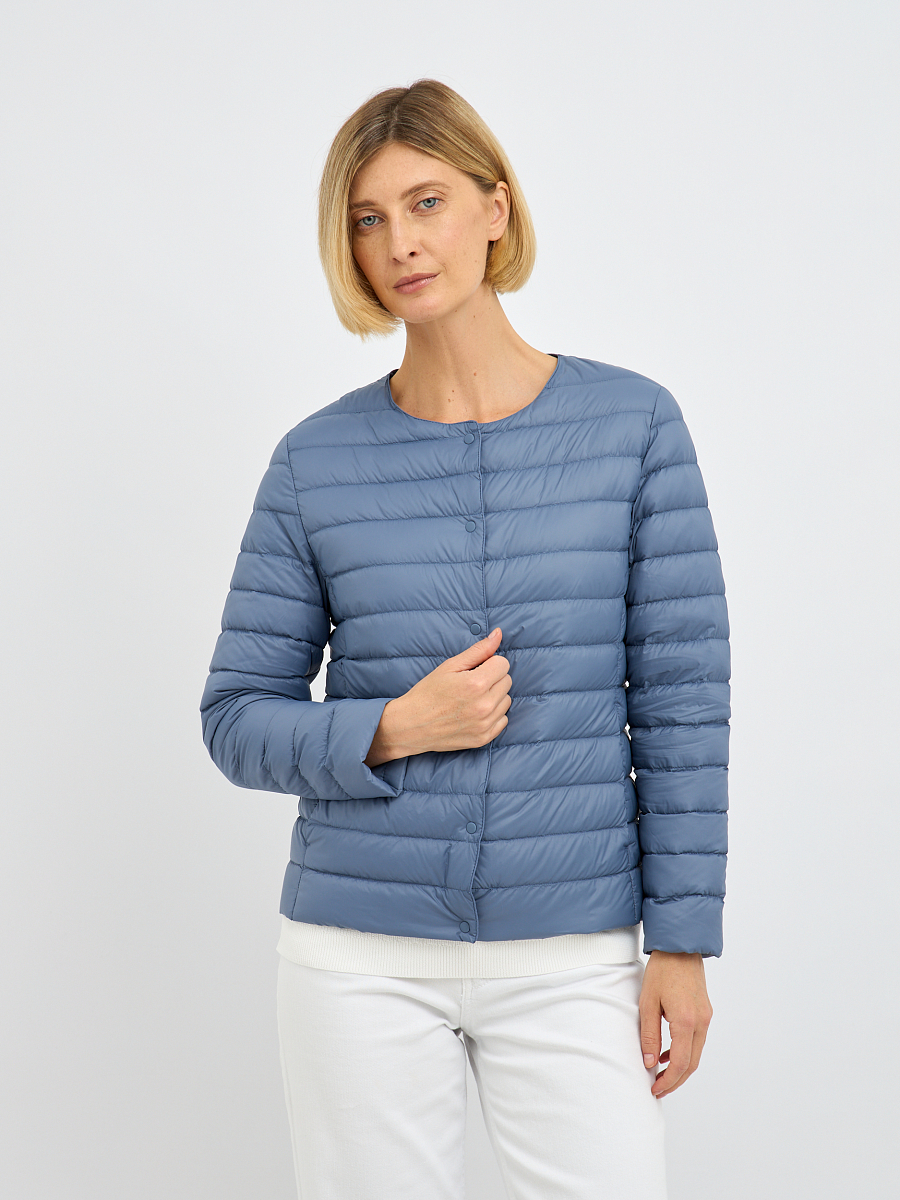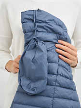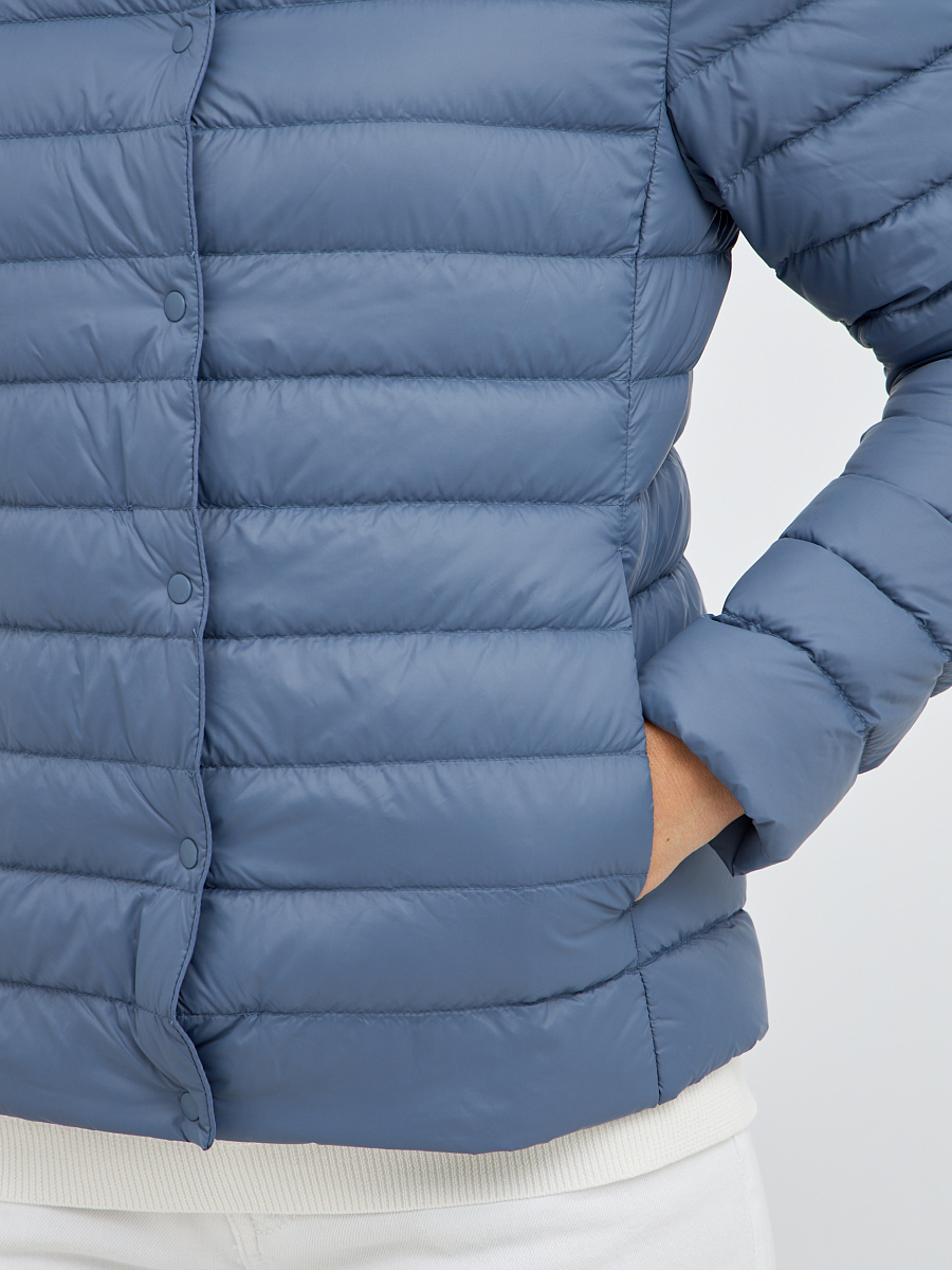 Пуховик имеет округлый вырез, который подчеркивает женственность и элегантность. Кнопки, используемые в качестве застежки, добавляют изюминку и делают модель более стильной. Этот элемент дизайна не только практичен, но и создает аккуратный и современный вид.