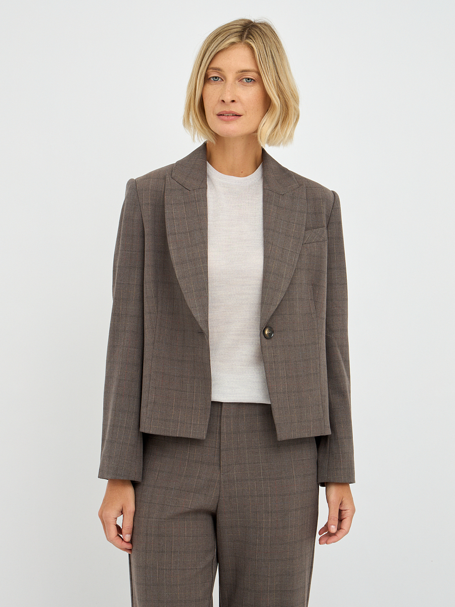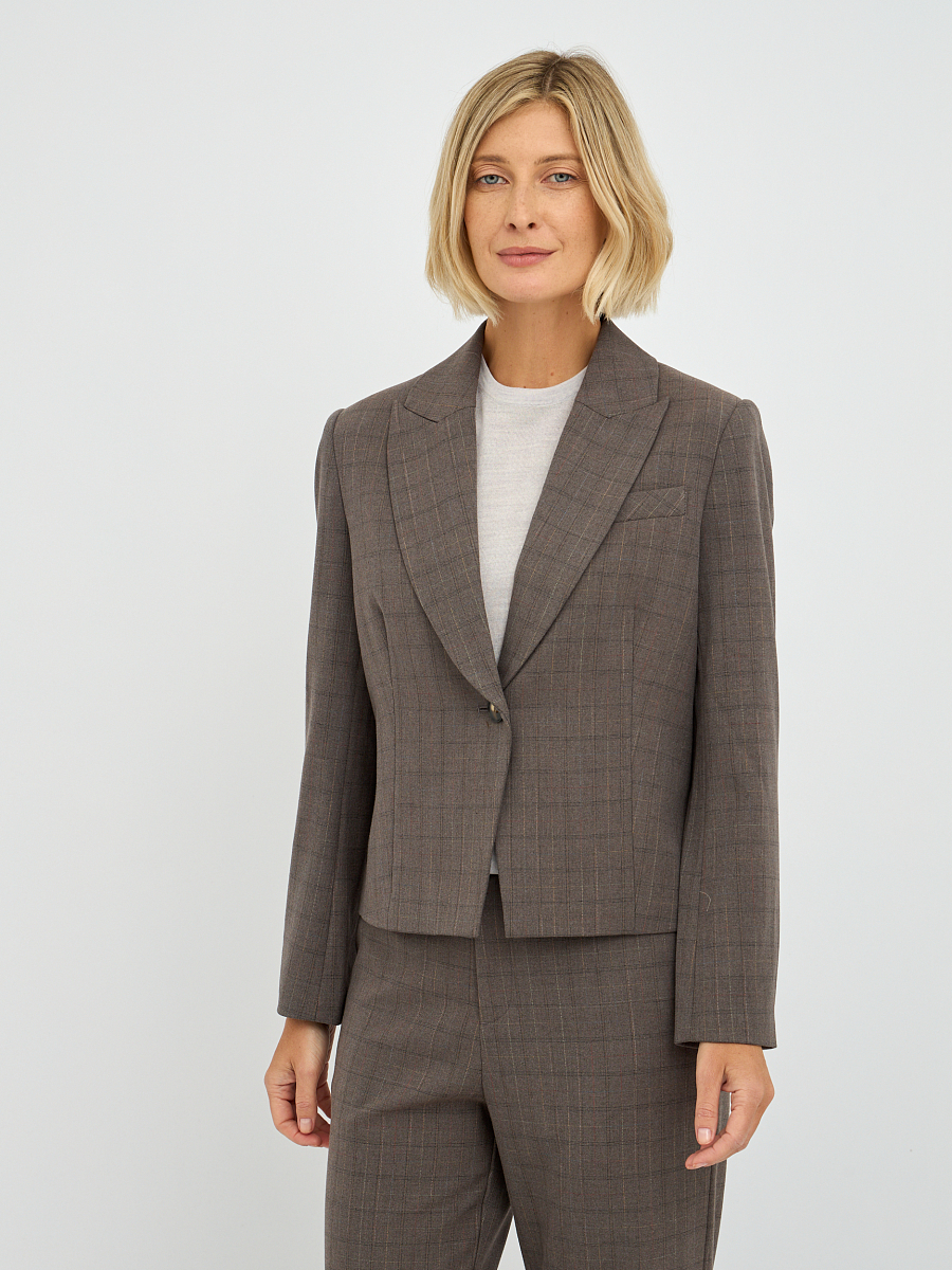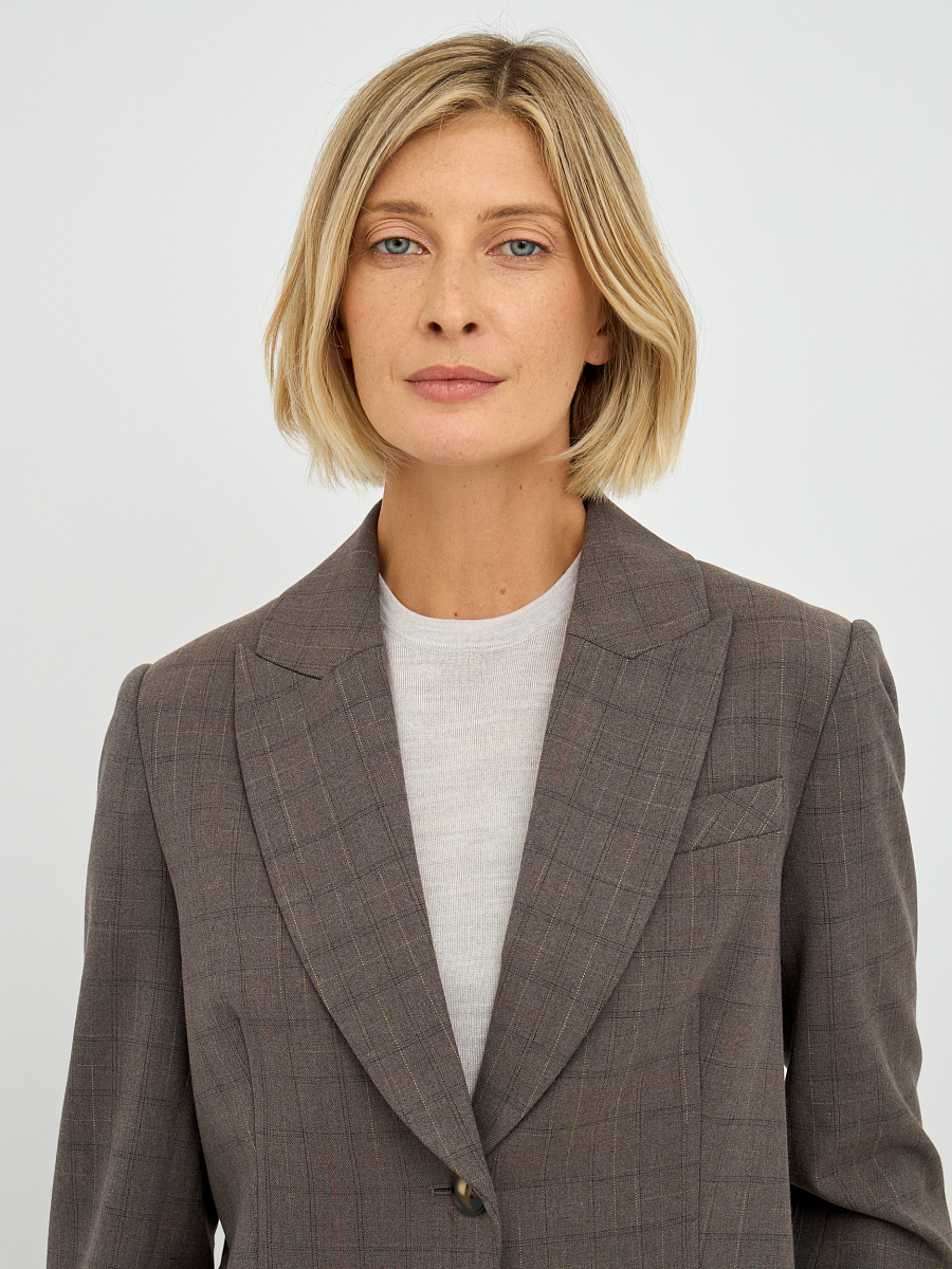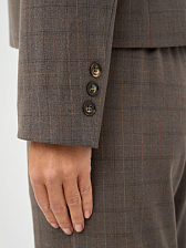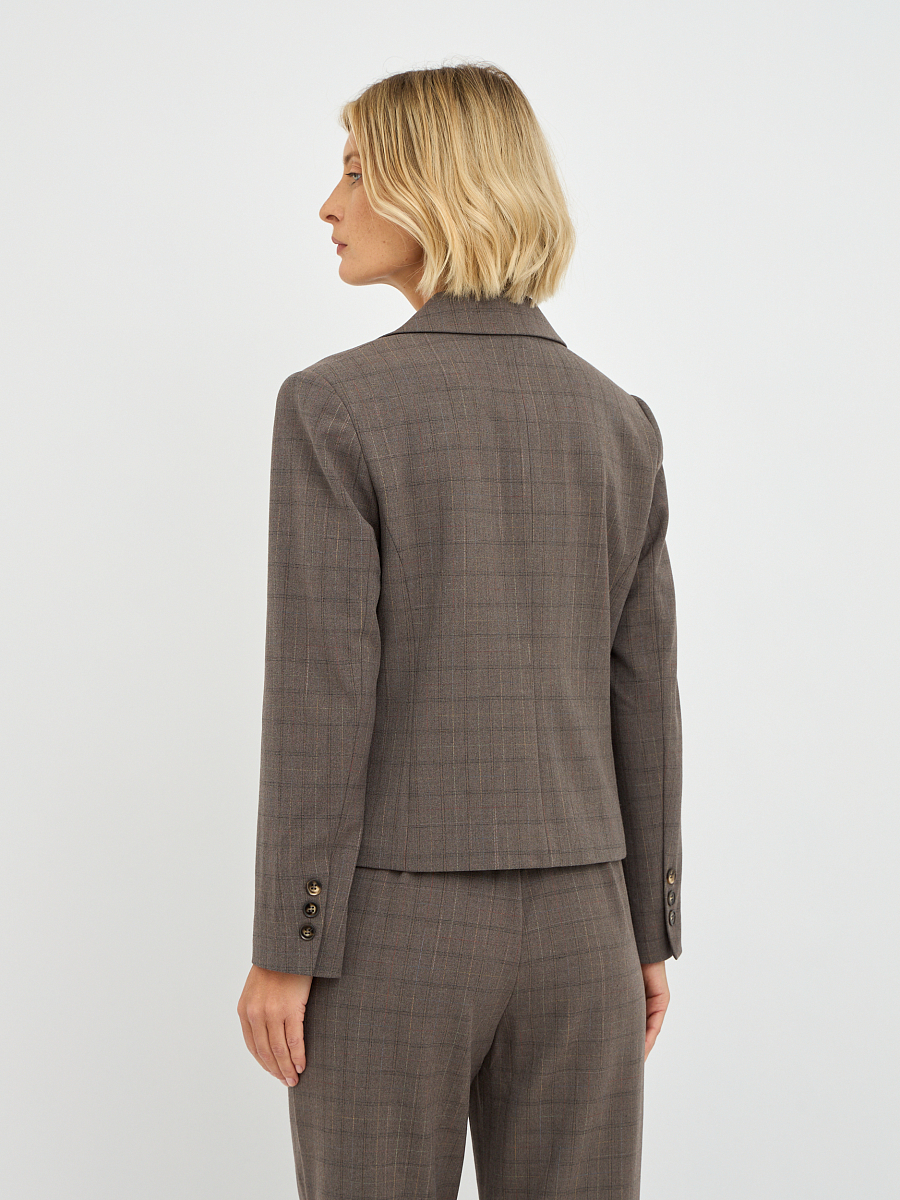 Этот элегантный женский жакет, выполненный в приглушенном оттенке "фанго" с клетчатым узором, станет прекрасным дополнением к вашему гардеробу.