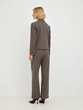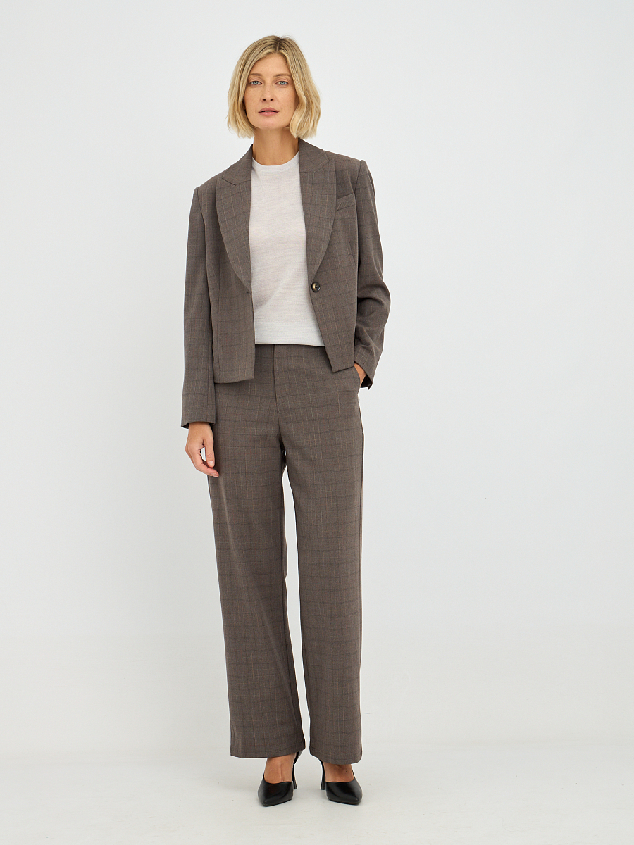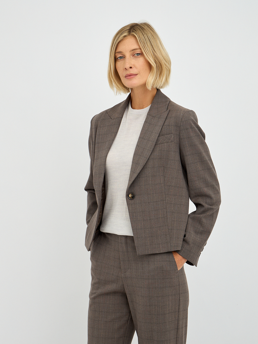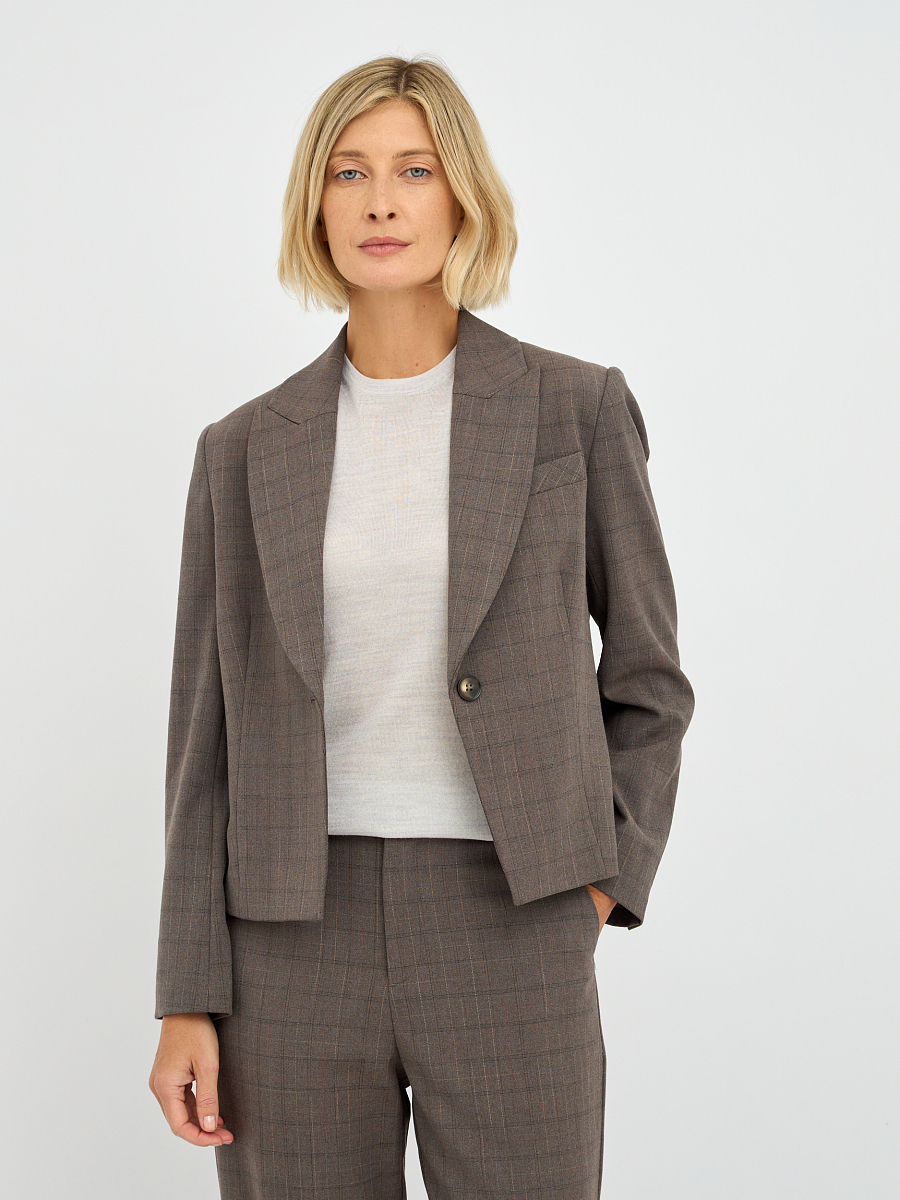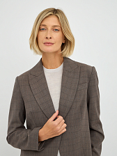 Этот элегантный женский жакет, выполненный в приглушенном оттенке "фанго" с клетчатым узором, станет прекрасным дополнением к вашему гардеробу.
