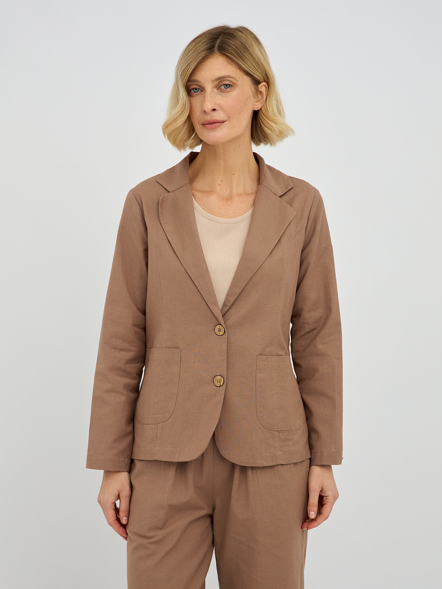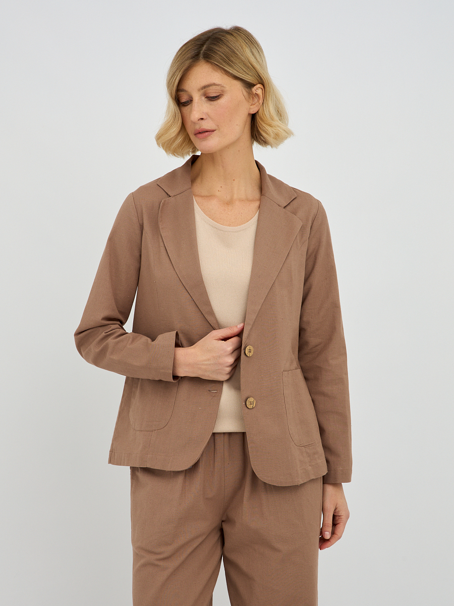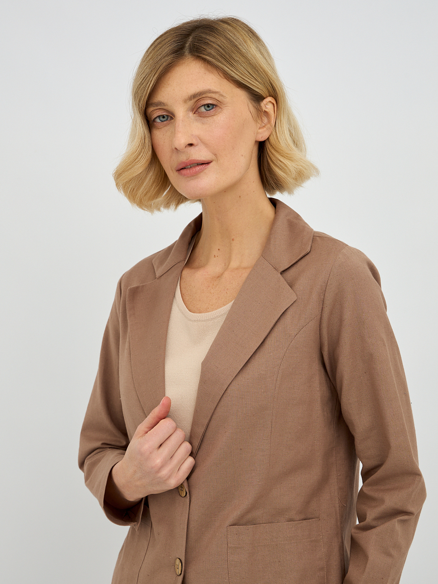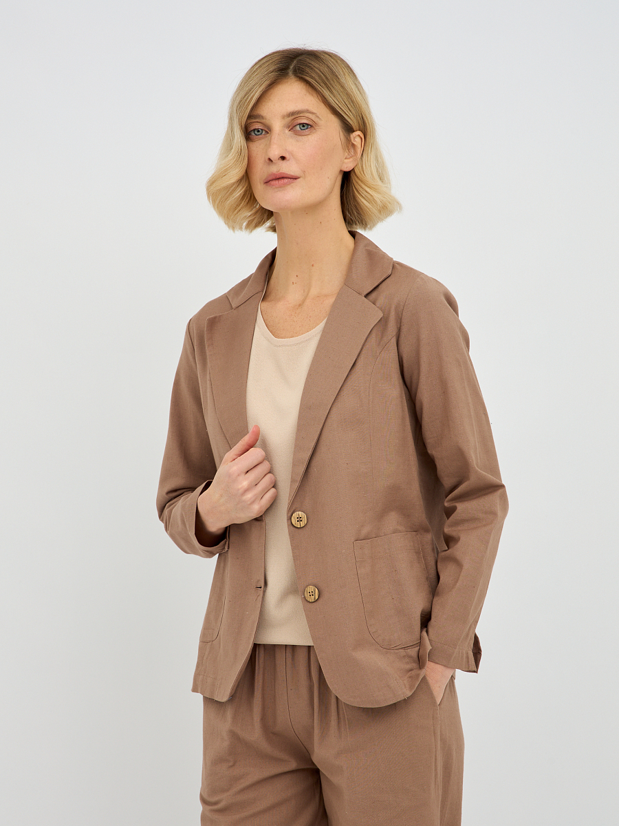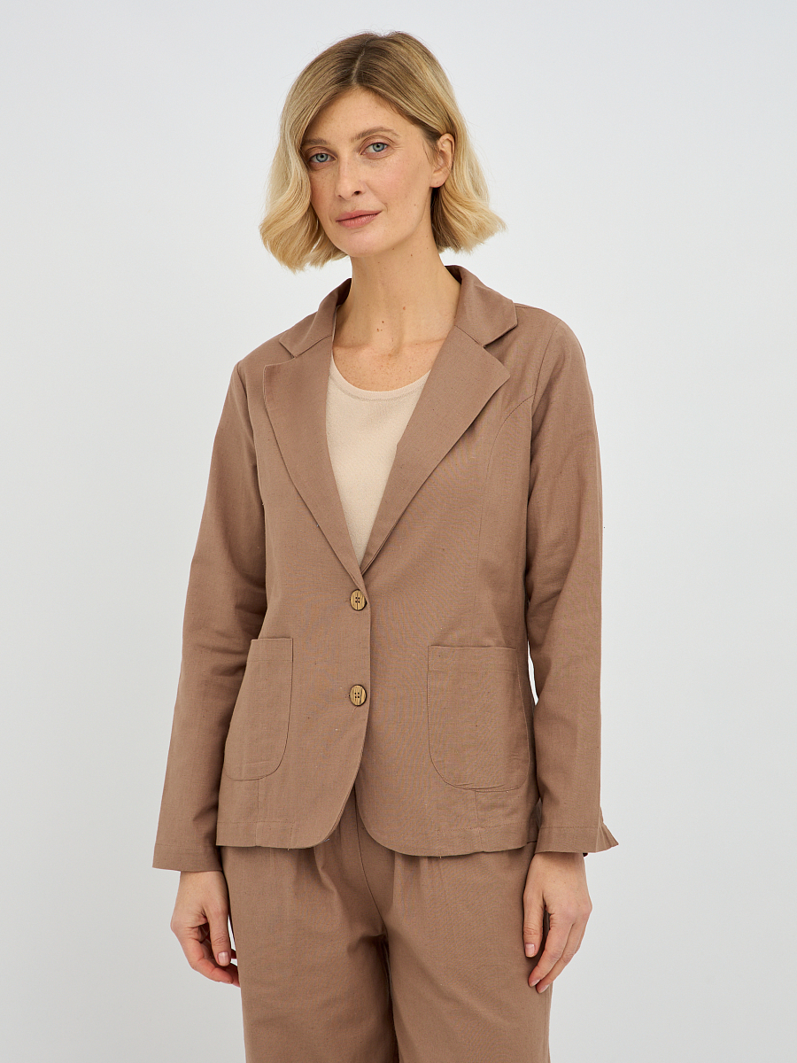 Этот однобортный женский жакет, выполненный из натурального хлопка и льна, представляет собой идеальное сочетание стиля и комфорта. Мягкая и дышащая ткань хлопка обеспечивает приятные тактильные ощущения и долговечность, а лен придает изделию благородную фактуру и отличную воздухопроницаемость. Классический однобортный крой с элегантным отложным воротником подчеркивает утонченность женской фигуры, создавая одновременно строгий и женственный образ. Накладные карманы не только добавляют функциональности, но и служат стильным акцентом, придавая жакету легкую небрежность и современный вид.