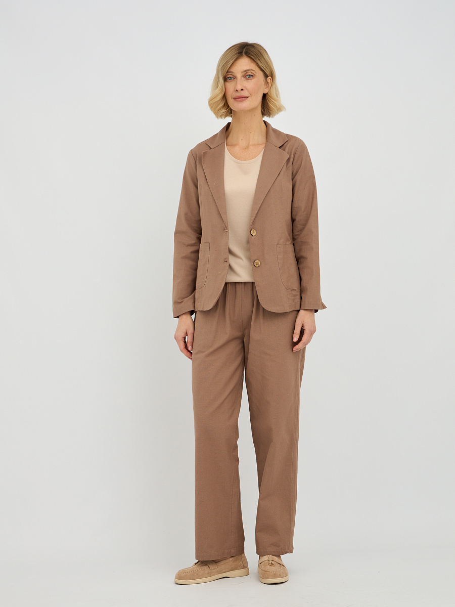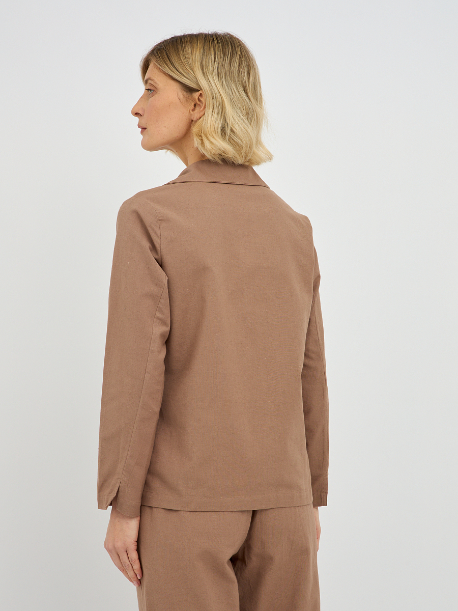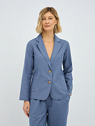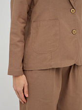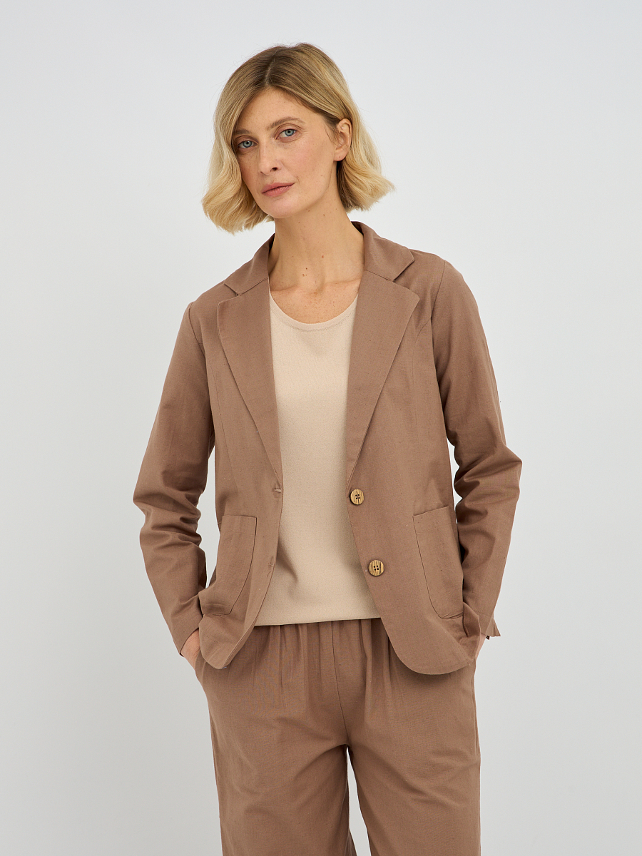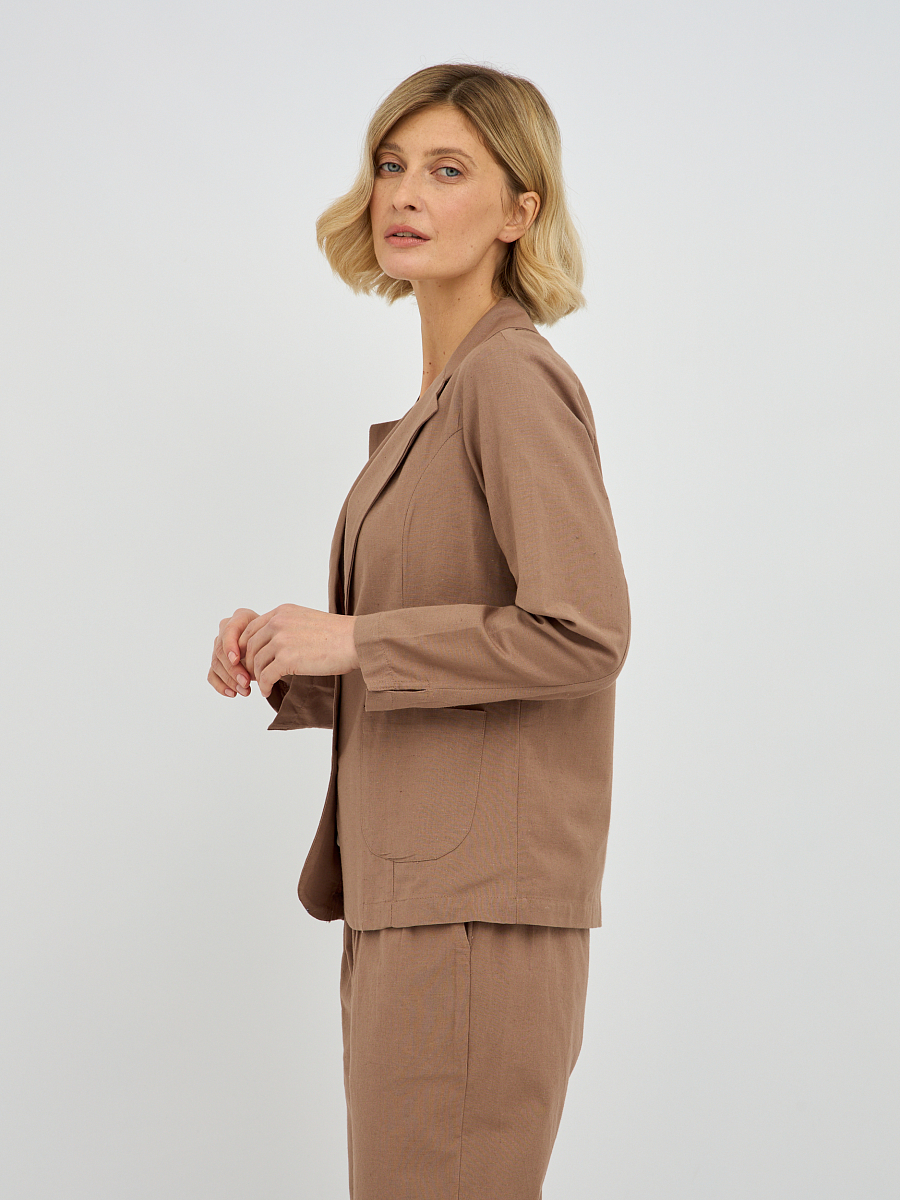 Этот однобортный женский жакет, выполненный из натурального хлопка и льна, представляет собой идеальное сочетание стиля и комфорта. Мягкая и дышащая ткань хлопка обеспечивает приятные тактильные ощущения и долговечность, а лен придает изделию благородную фактуру и отличную воздухопроницаемость. Классический однобортный крой с элегантным отложным воротником подчеркивает утонченность женской фигуры, создавая одновременно строгий и женственный образ. Накладные карманы не только добавляют функциональности, но и служат стильным акцентом, придавая жакету легкую небрежность и современный вид.