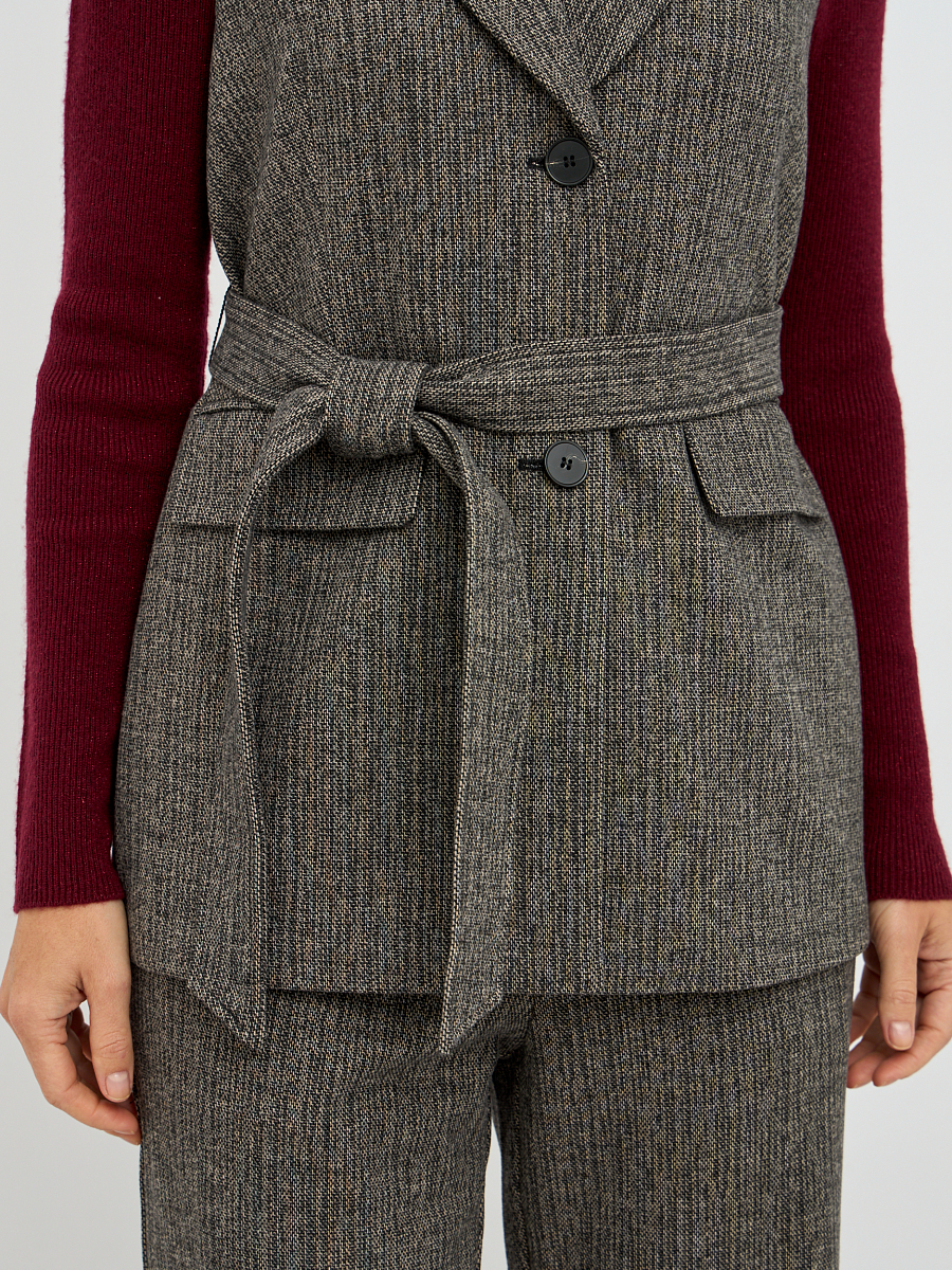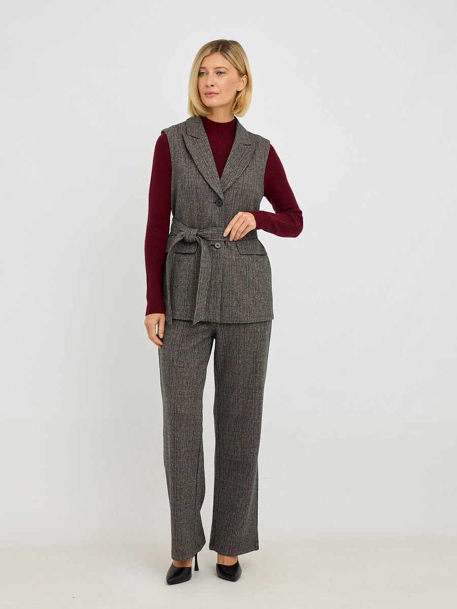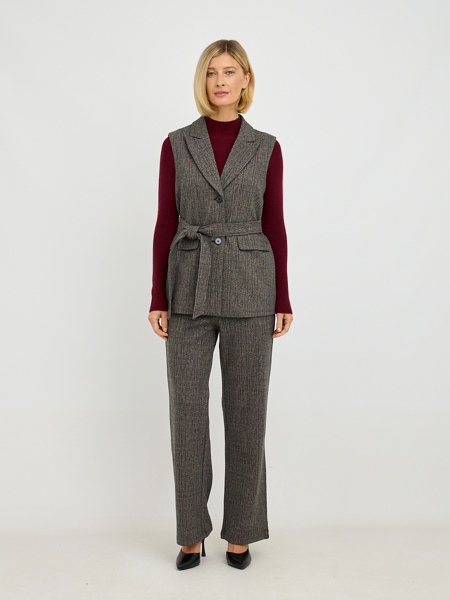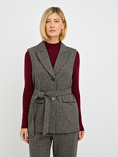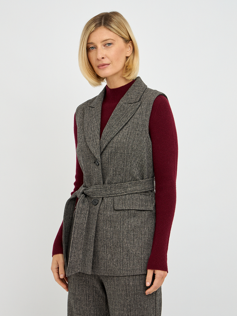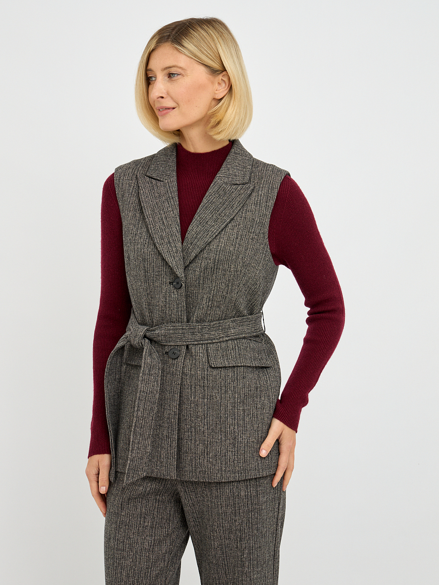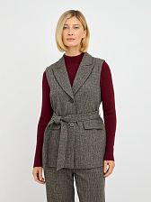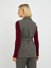 Жилет с поясом можно носить как самостоятельно, так и в сочетании с блузами, рубашками или топами. Пояс позволяет регулировать силуэт, подчеркивая талию и создавая эффектный акцент на фигуре.