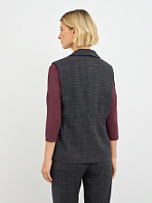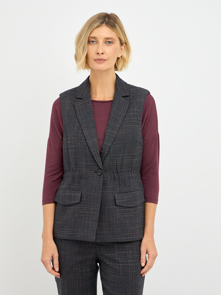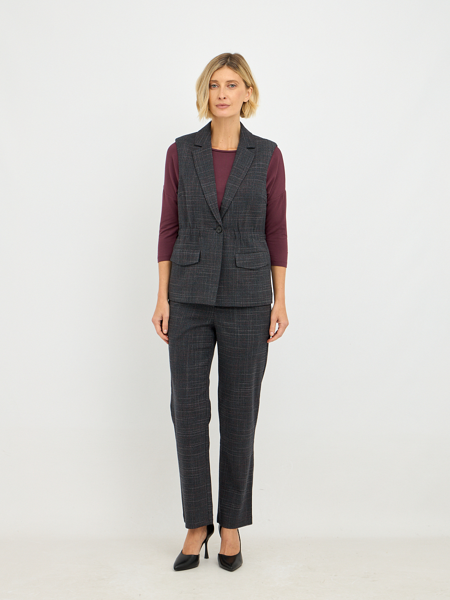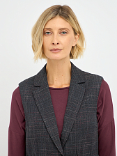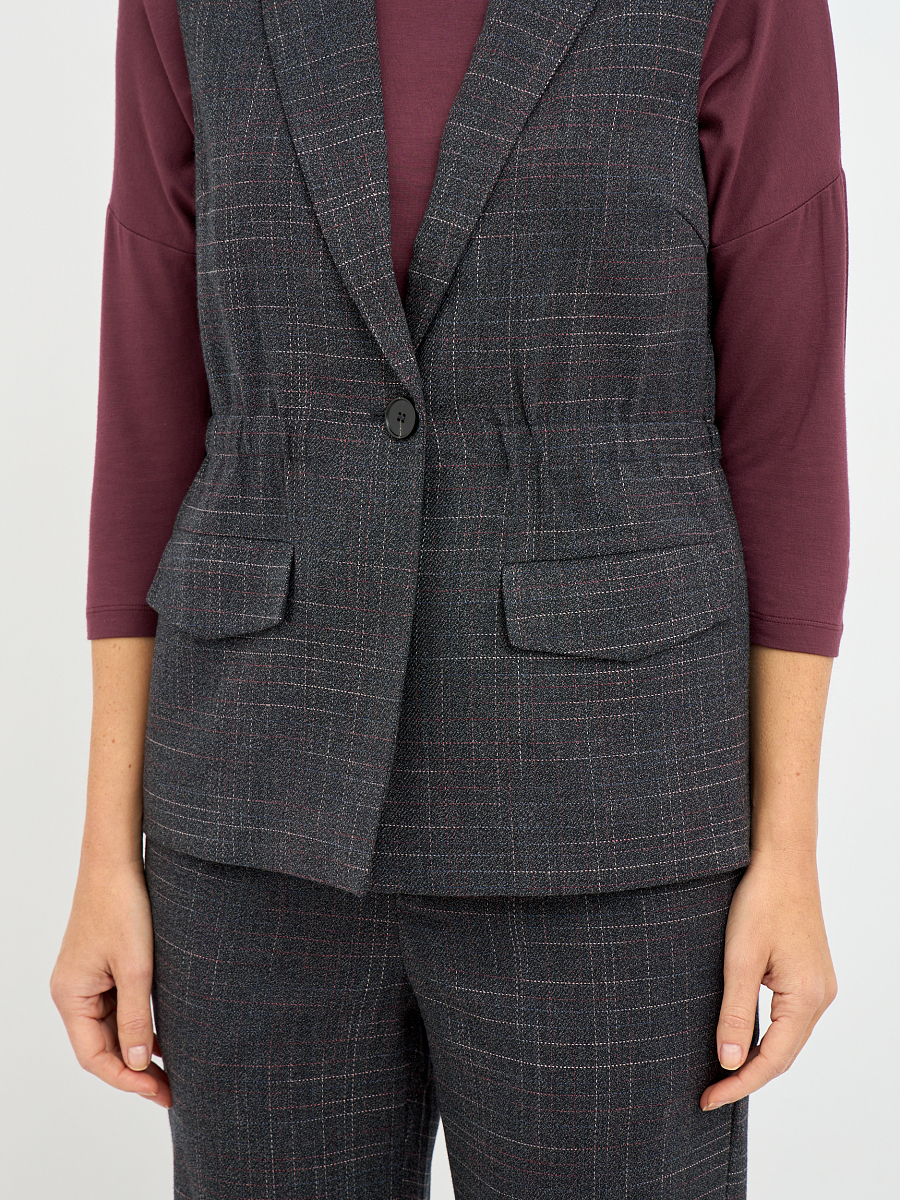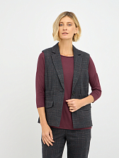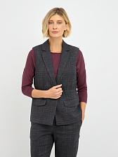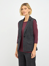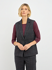 Благородный синий цвет в сочетании с классическим клетчатым узором придает образу изысканность и утонченность. Дизайн жилета идеально подчеркивает фигуру, создавая женственный силуэт. Отсутствие рукавов позволяет носить его в любое время года, комбинируя с блузками, водолазками или тонкими свитерами. Жилет застегивается на одну пуговицу, что добавляет ему элегантности и позволяет регулировать посадку. Два аккуратных кармана не только функциональны, но и являются стильным элементом дизайна.