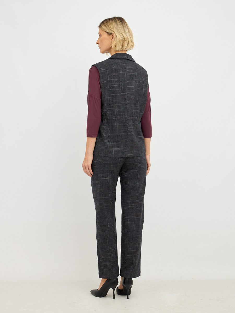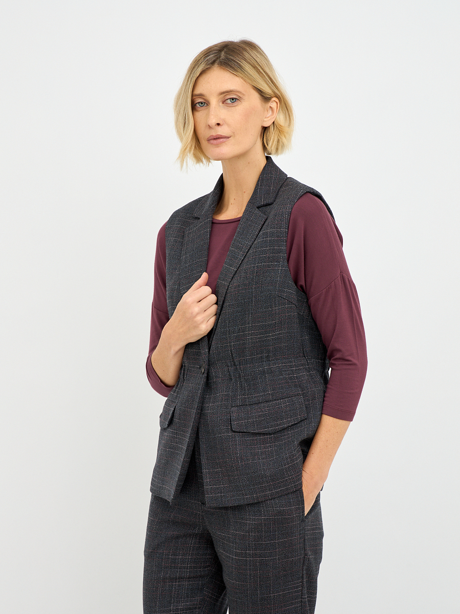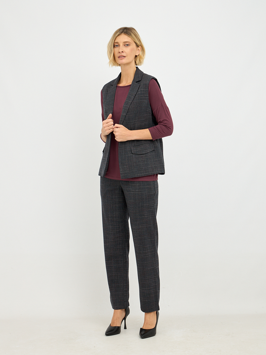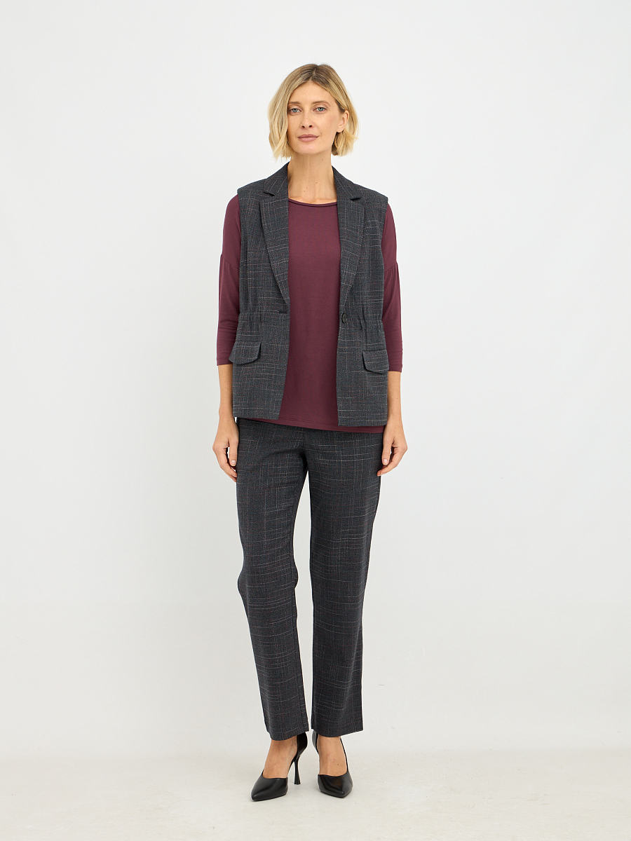Благородный синий цвет в сочетании с классическим клетчатым узором придает образу изысканность и утонченность. Дизайн жилета идеально подчеркивает фигуру, создавая женственный силуэт. Отсутствие рукавов позволяет носить его в любое время года, комбинируя с блузками, водолазками или тонкими свитерами. Жилет застегивается на одну пуговицу, что добавляет ему элегантности и позволяет регулировать посадку. Два аккуратных кармана не только функциональны, но и являются стильным элементом дизайна.