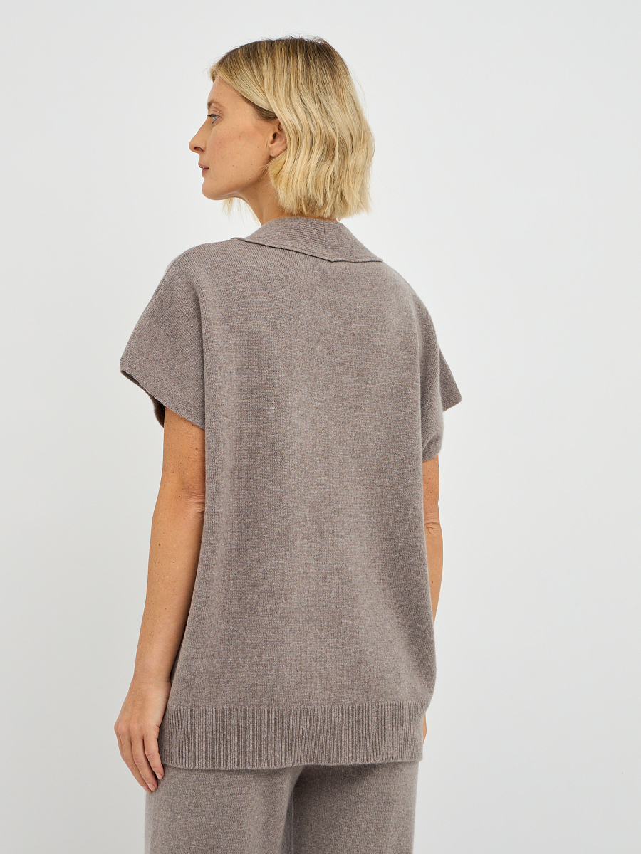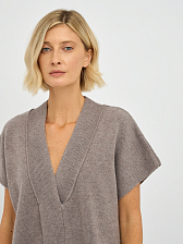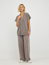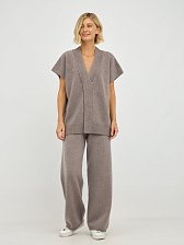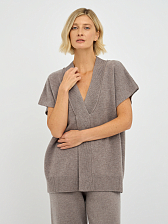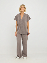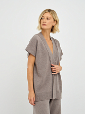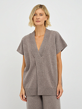 Жилет имеет элегантный V-образный вырез, который подчеркивает линию шеи и создает утонченный силуэт. Свободный крой обеспечивает максимальную свободу движений, позволяя вам чувствовать себя комфортно в любой ситуации. Особый акцент сделан на нижней части жилета, где расположен стильный вырез с запахом, добавляющий нотку оригинальности и динамики в общий образ.