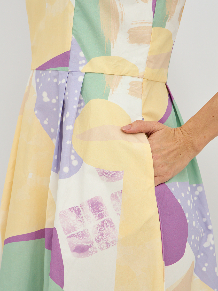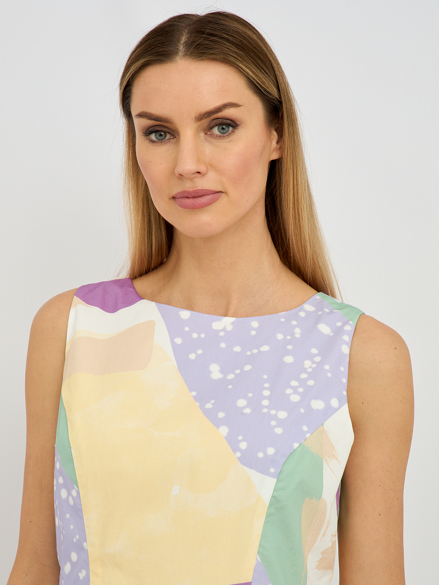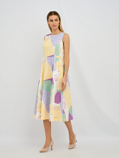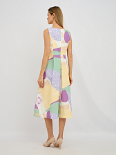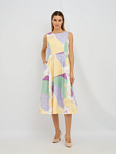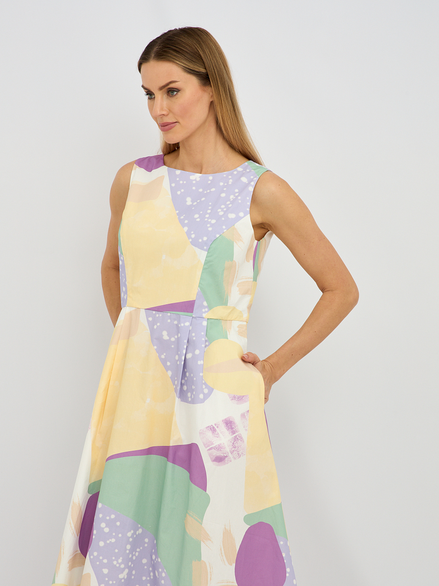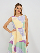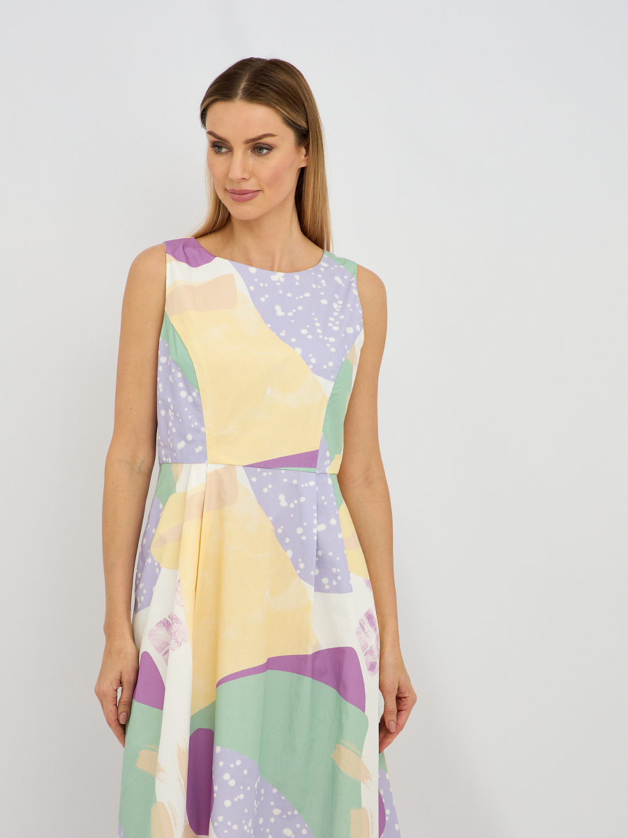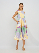 Это стильное цветное платье без рукавов длиной миди станет идеальным дополнением вашего гардероба. Юбка полусолнце придаёт образу лёгкость и романтичность, а свободный крой обеспечивает комфорт в течение всего дня.
