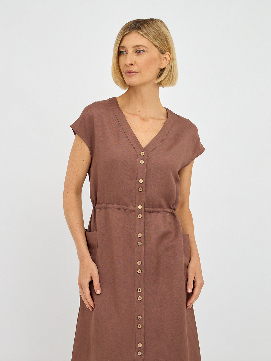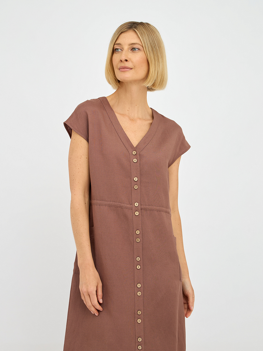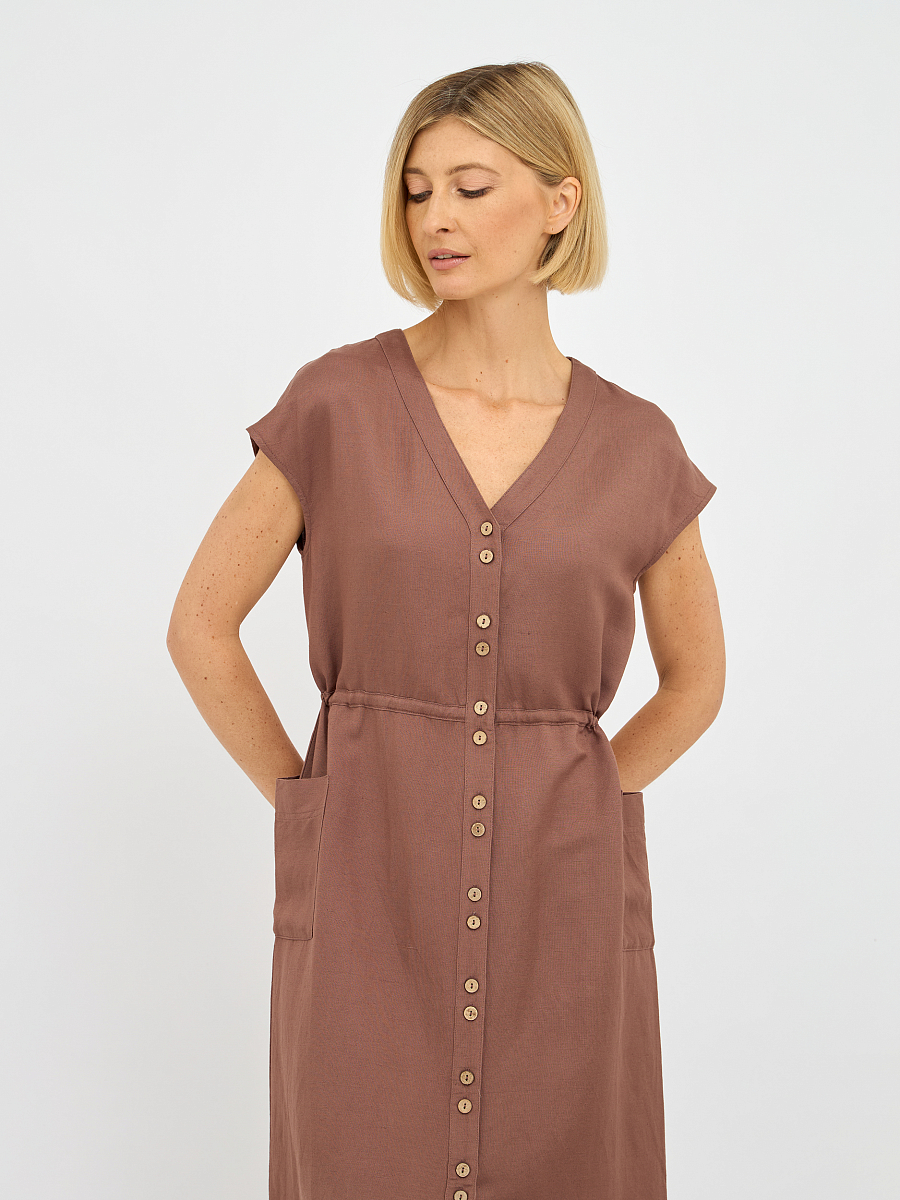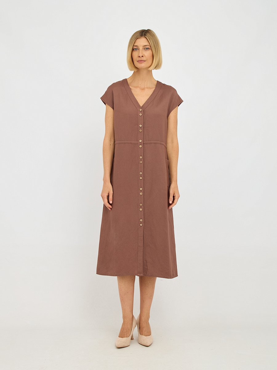 Это платье на пуговицах с элегантным V-образным вырезом подчеркивает женственность и создает утонченный силуэт.