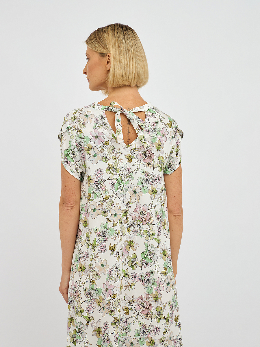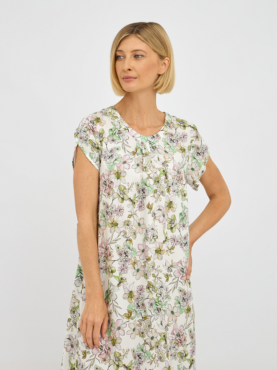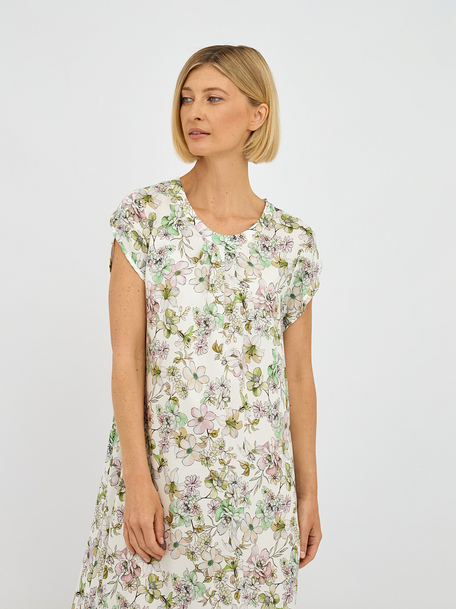 Это платье выполнено из 100% лиоцелла — материала, известного своей мягкостью и воздухопроницаемостью, что обеспечивает комфорт в течение всего дня.