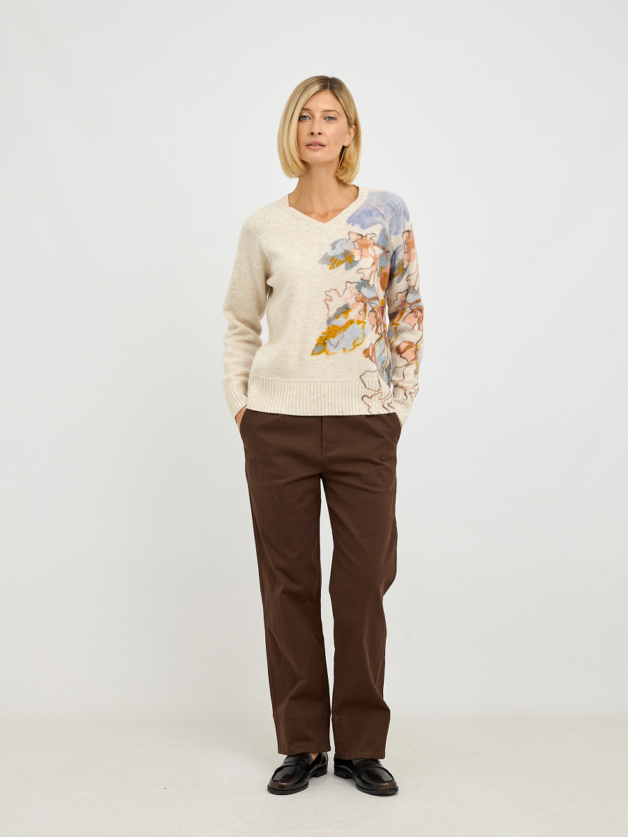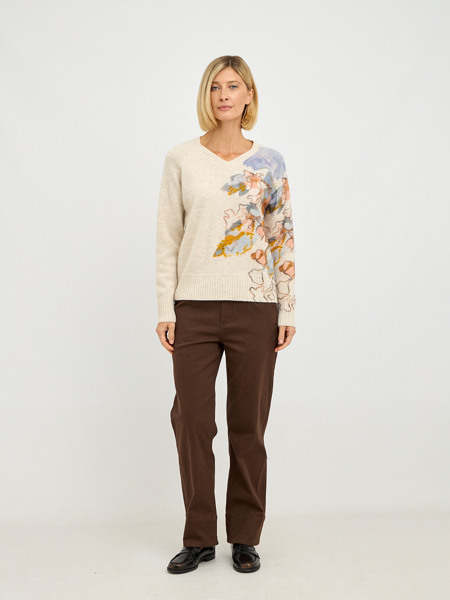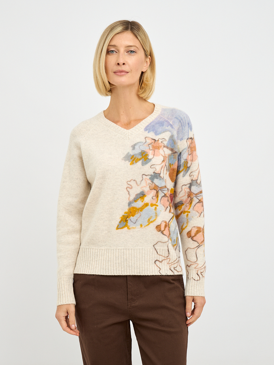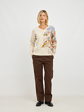 Этот изысканный женский пуловер в благородном бежевом оттенке станет настоящей жемчужиной вашего гардероба, сочетая в себе элегантность и утонченность. Его уникальность заключается в потрясающем акварельном цветочным принте, который добавляет образу легкости и романтичности. Дизайн пуловера подчеркивает индивидуальность, а деликатные переливы красок создают ощущение художественной работы, выполненной с любовью и мастерством.