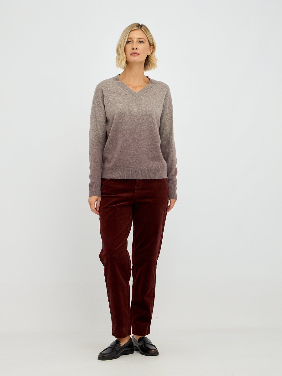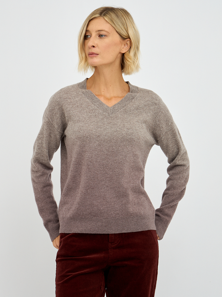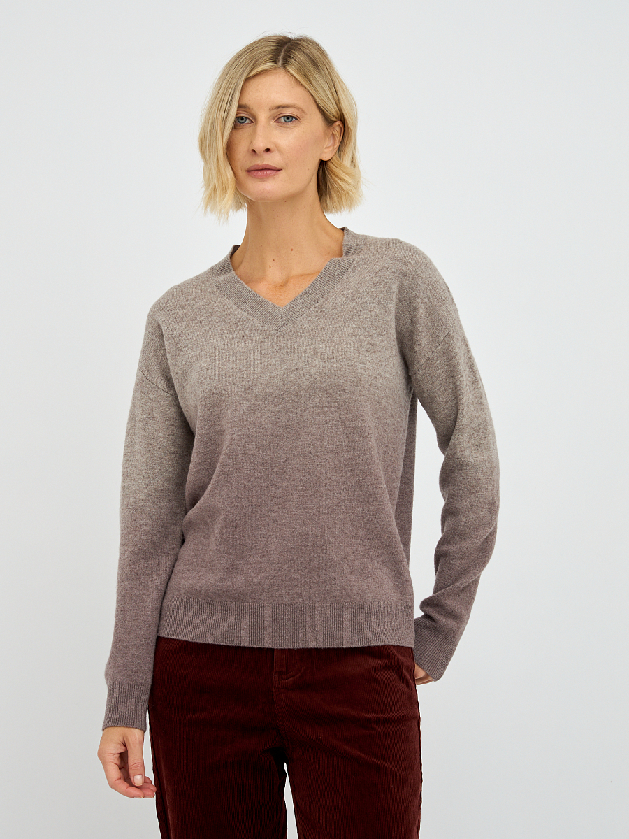 Пуловер обладает эффектом градиента, который плавно переходит от одного оттенка к другому, создавая визуально привлекательный и современный образ. Такой переход цветов добавляет изюминку и делает изделие универсальным — его легко сочетать как с джинсами, так и с юбками. Свободный крой и спущенная линия плеча придают пуловеру расслабленный и непринужденный вид, что идеально подходит для повседневной носки или для создания стильного образа на выход.