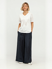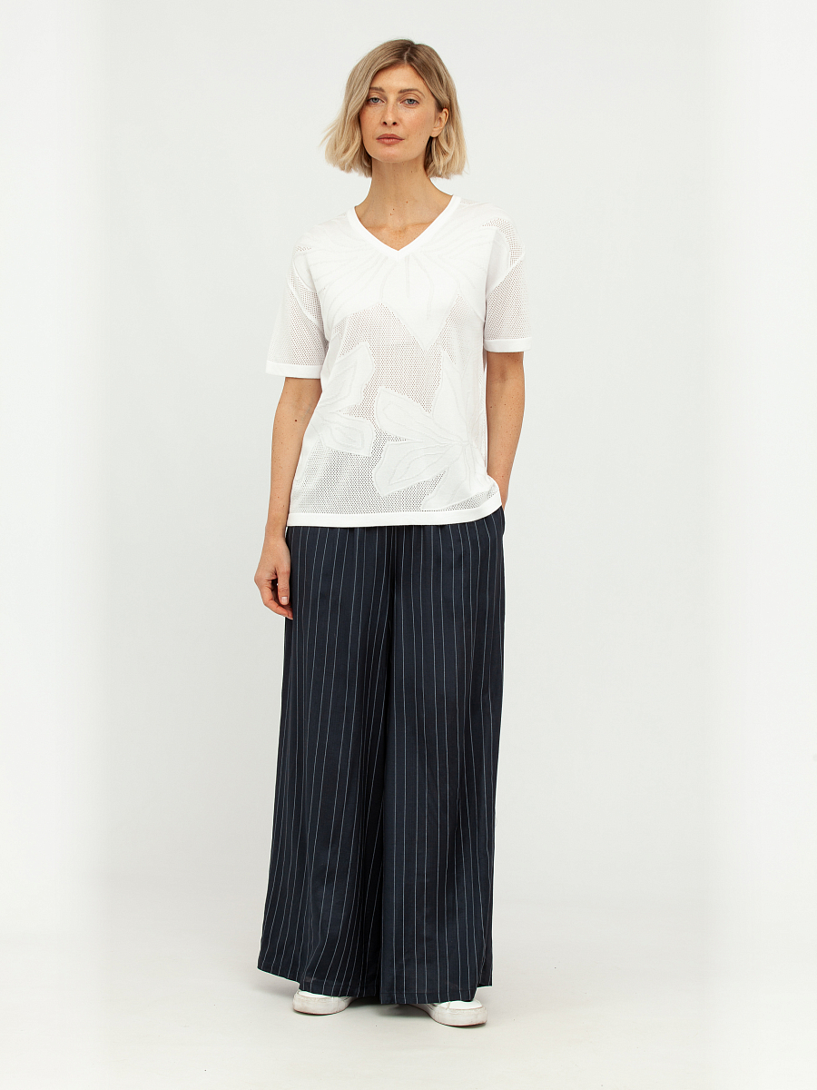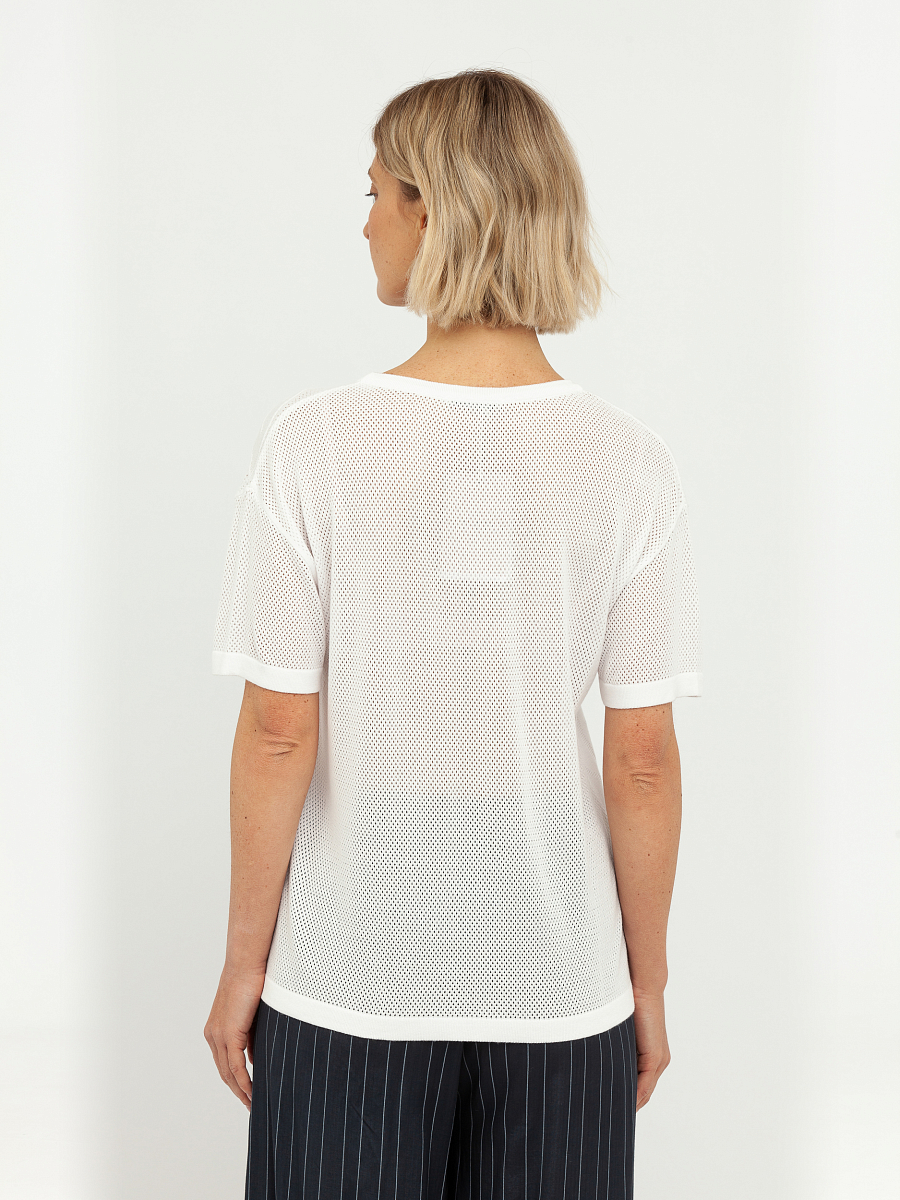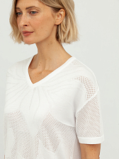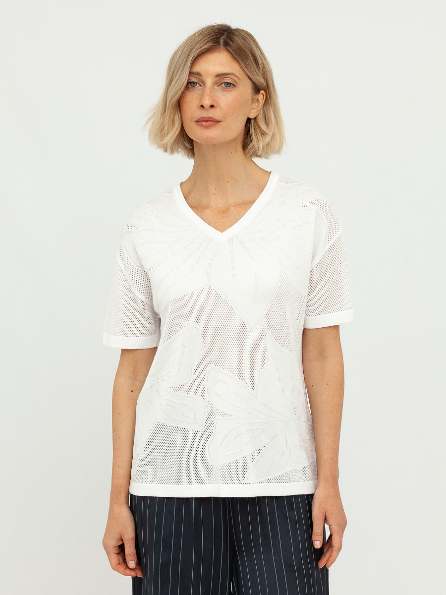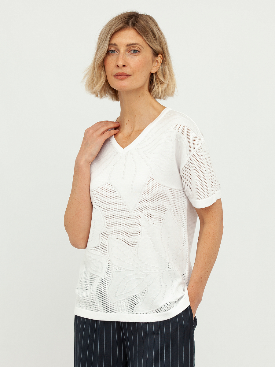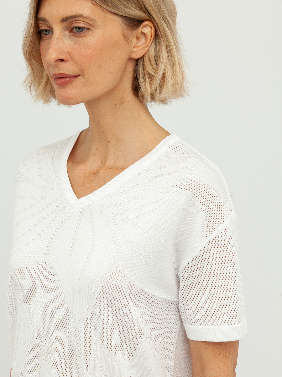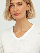 Особую изюминку этому пуловеру придает деликатная перфорация, создающая утонченный ажурный узор, который выглядит одновременно стильно и воздушно. Этот элемент дизайна добавляет изделию особую элегантность и делает его идеальным выбором для создания как повседневных, так и более нарядных образов. Глубокий V-образный вырез горловины визуально удлиняет шею и подчеркивает изящную линию плеч, придавая женственность.