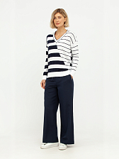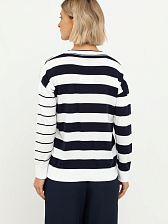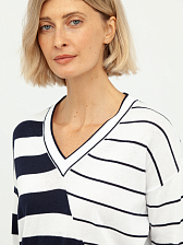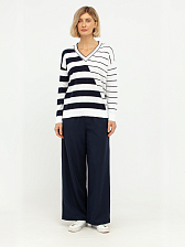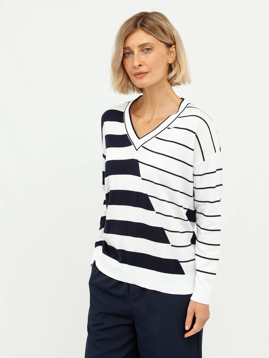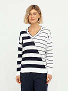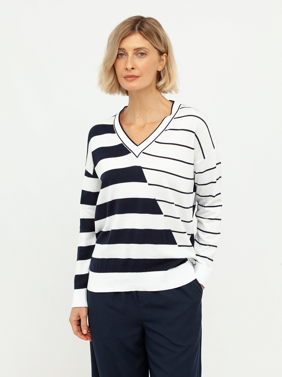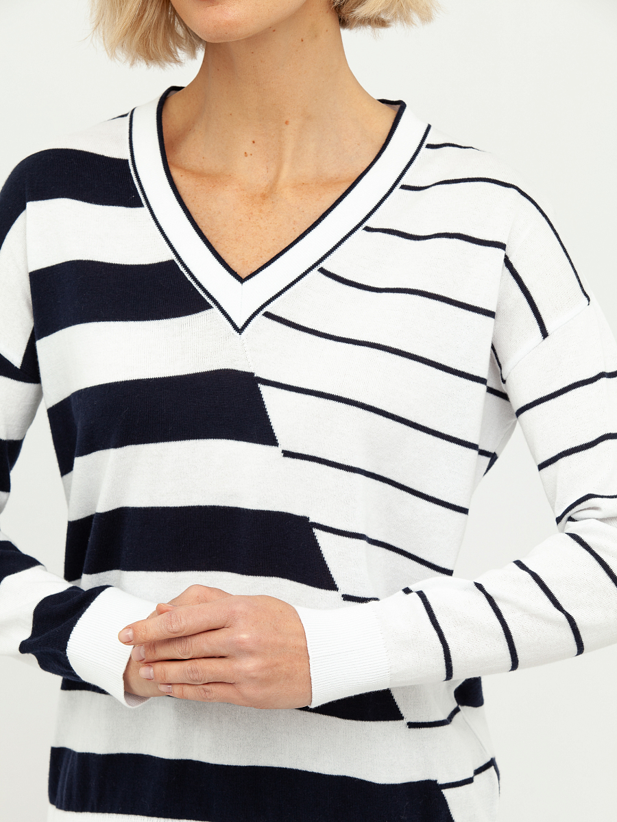 Дизайн пуловера отличается оригинальным сочетанием разных направлений полосок: одна сторона украшена широкими горизонтальными линиями, а другая – более тонкими, диагонально расположенными. Этот асимметричный узор придает модели динамичность и современный вид, визуально корректируя фигуру. Глубокий V-образный вырез горловины выгодно подчеркивает линию шеи и декольте, добавляя образу женственности и изысканности.