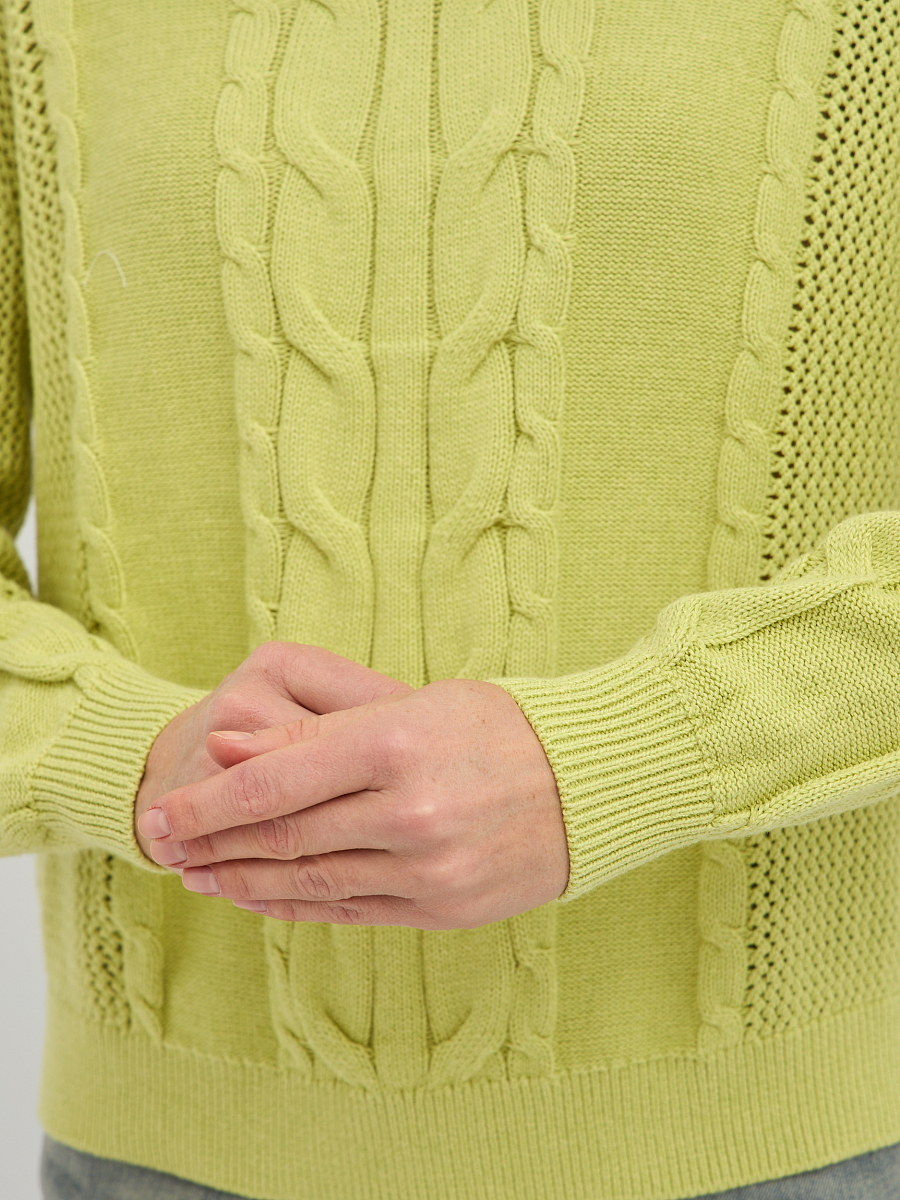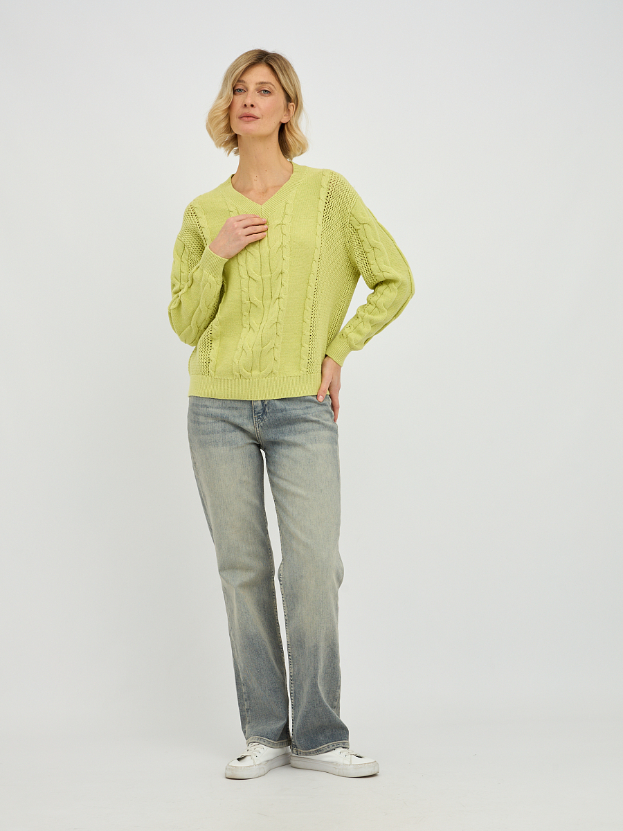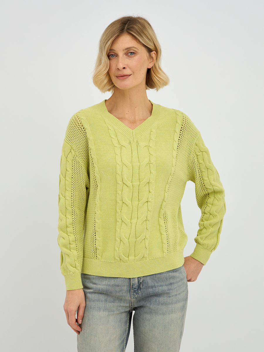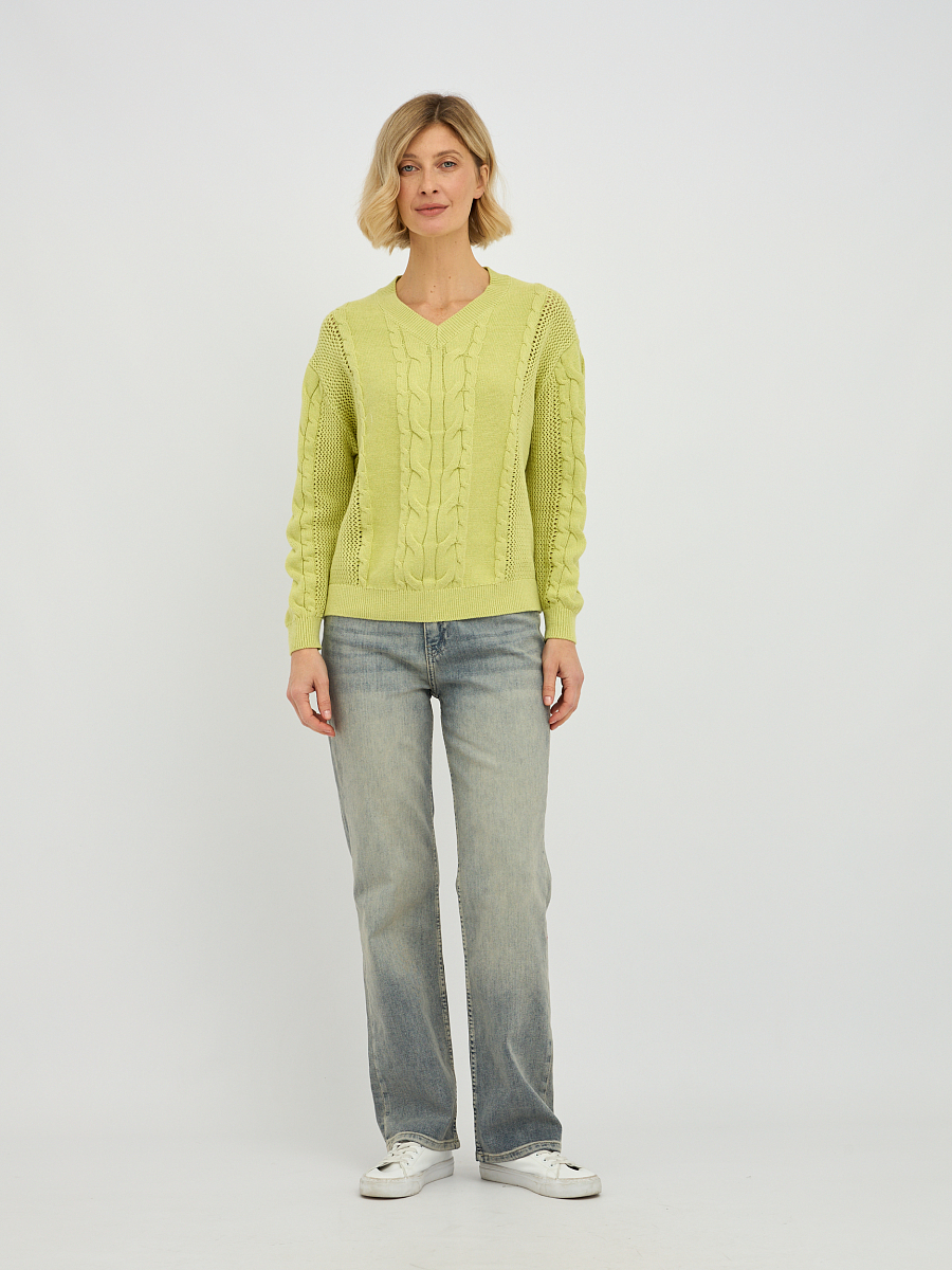 Этот стильный женский пуловер в желто-зеленом оттенке станет ярким акцентом в вашем весеннем и летнем гардеробе. Особую изюминку модели придает утонченное плетение "коса", расположенное по центру пуловера и на рукавах, которое придает изделию объем и элегантность. V-образный вырез горловины красиво подчеркивает линию шеи, визуально удлиняя ее и делая образ более женственным. Классический прямой крой и длинные рукава делают этот пуловер универсальным, подходящим для различных типов фигур.