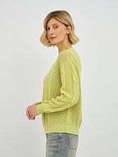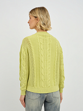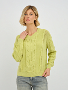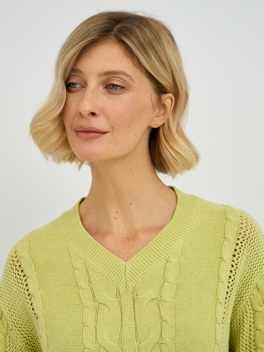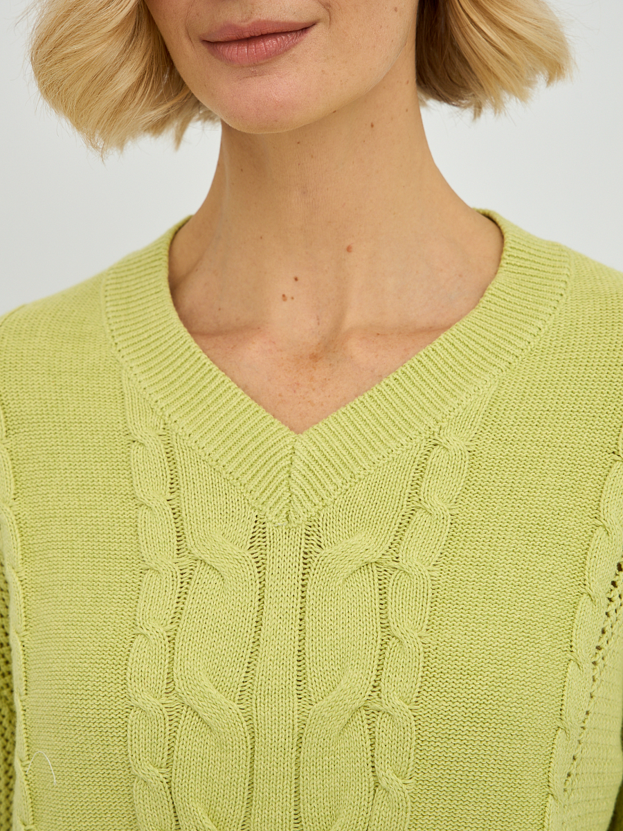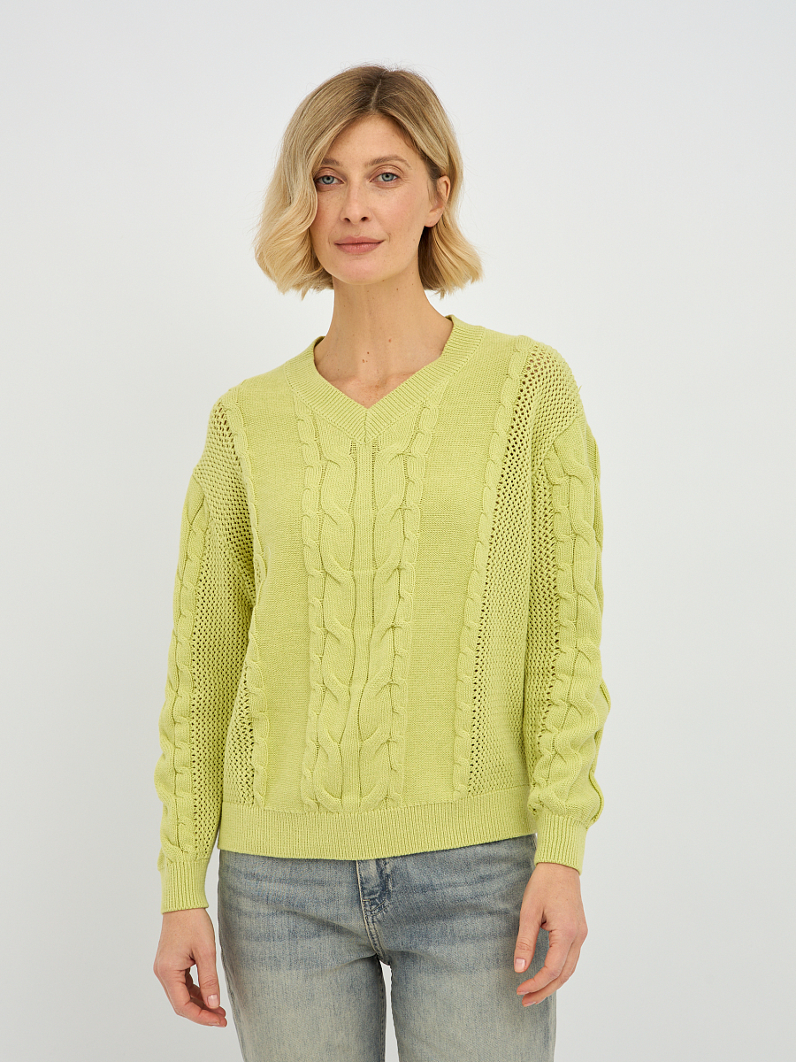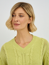 Этот стильный женский пуловер в желто-зеленом оттенке станет ярким акцентом в вашем весеннем и летнем гардеробе. Особую изюминку модели придает утонченное плетение "коса", расположенное по центру пуловера и на рукавах, которое придает изделию объем и элегантность. V-образный вырез горловины красиво подчеркивает линию шеи, визуально удлиняя ее и делая образ более женственным. Классический прямой крой и длинные рукава делают этот пуловер универсальным, подходящим для различных типов фигур.