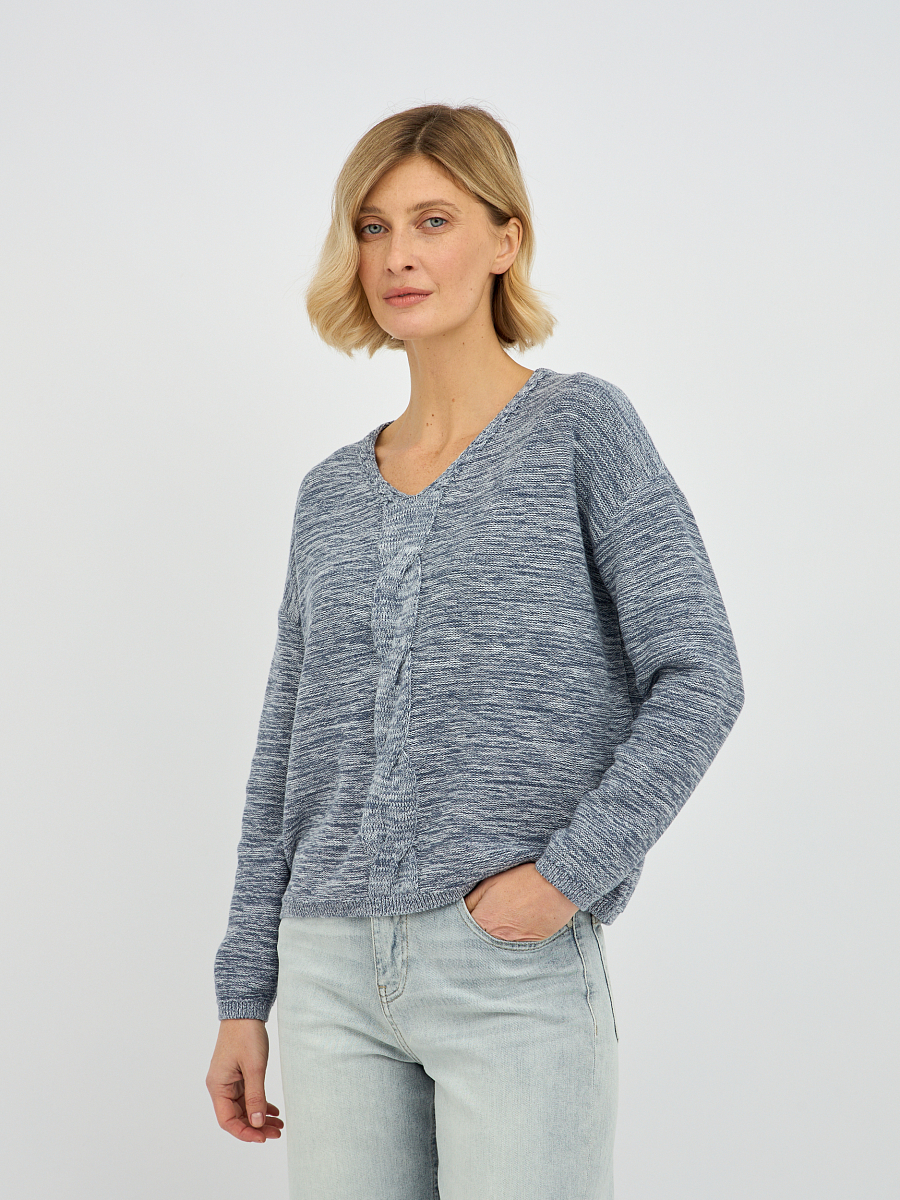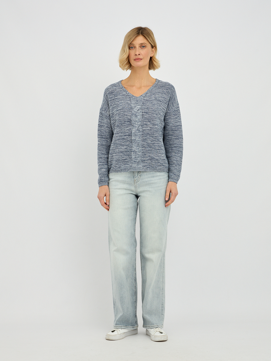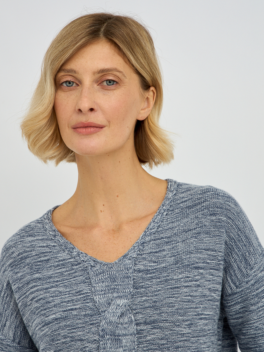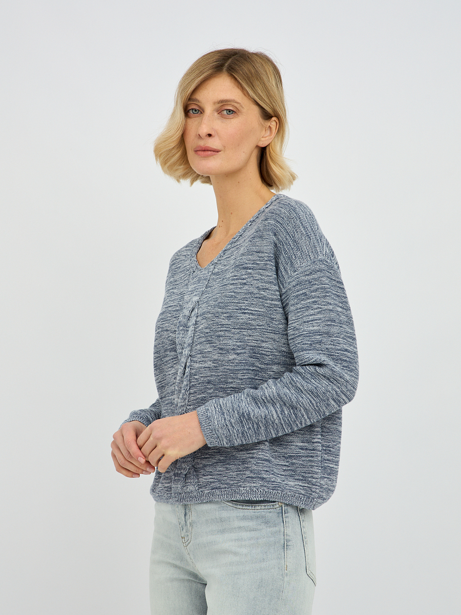 Уникальный меланжевый окрас придает изделию глубину и визуальный интерес, создавая эффект легкой текстуры и благородный внешний вид, который легко сочетается с различными элементами гардероба. Изюминкой дизайна является эффектное плетение "косы", расположенное по центру пуловера, которое добавляет нотку классической элегантности и подчеркивает изящество силуэта. V-образный вырез горловины визуально удлиняет шею и придает образу женственности, делая его универсальным для разных случаев. Свободный крой обеспечивает максимальный комфорт и свободу движений, не сковывая вас в течение дня,.