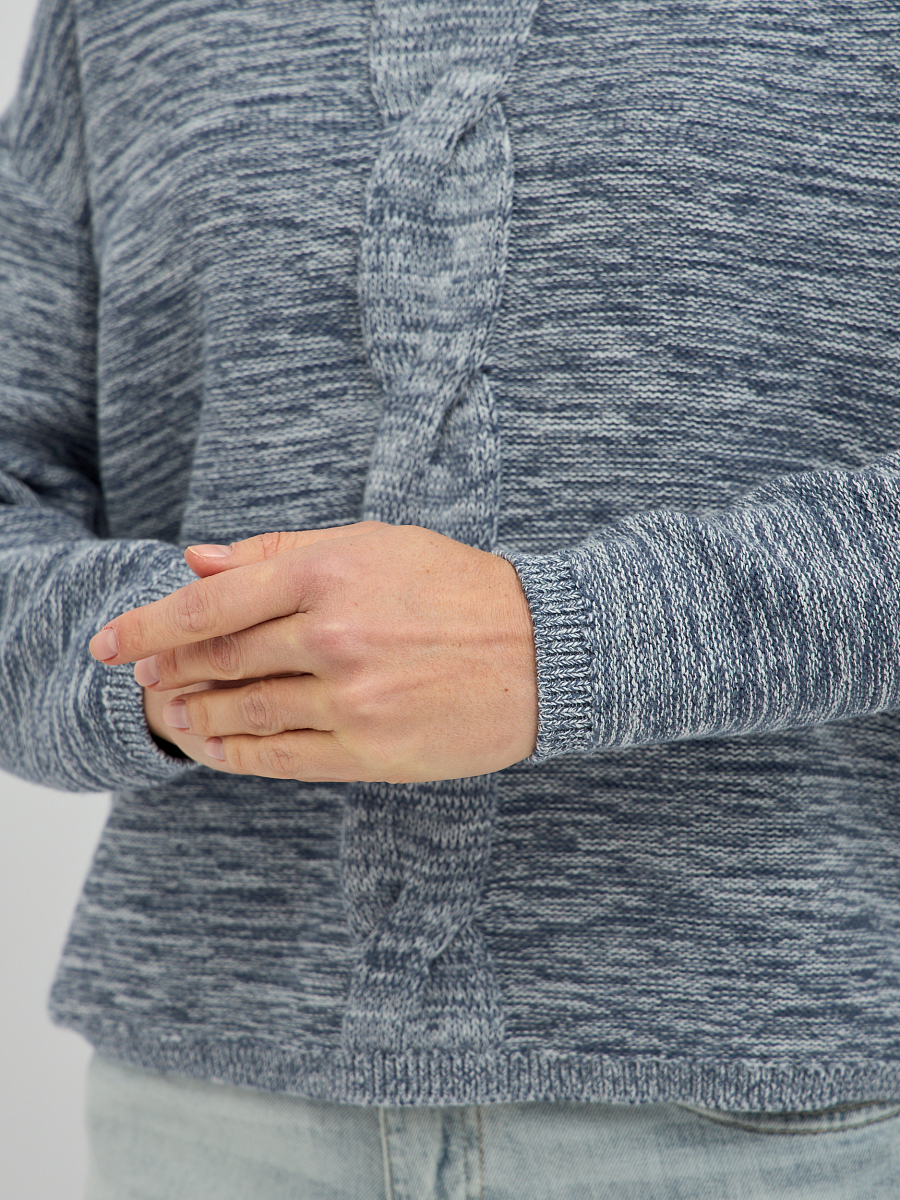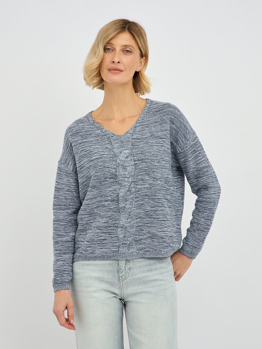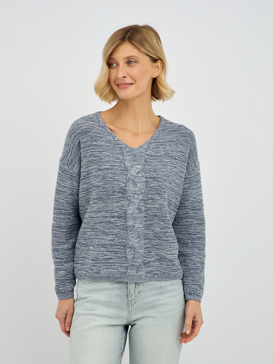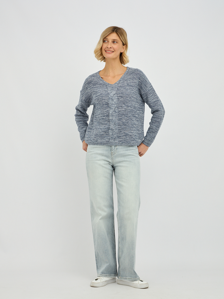 Уникальный меланжевый окрас придает изделию глубину и визуальный интерес, создавая эффект легкой текстуры и благородный внешний вид, который легко сочетается с различными элементами гардероба. Изюминкой дизайна является эффектное плетение "косы", расположенное по центру пуловера, которое добавляет нотку классической элегантности и подчеркивает изящество силуэта. V-образный вырез горловины визуально удлиняет шею и придает образу женственности, делая его универсальным для разных случаев. Свободный крой обеспечивает максимальный комфорт и свободу движений, не сковывая вас в течение дня,.