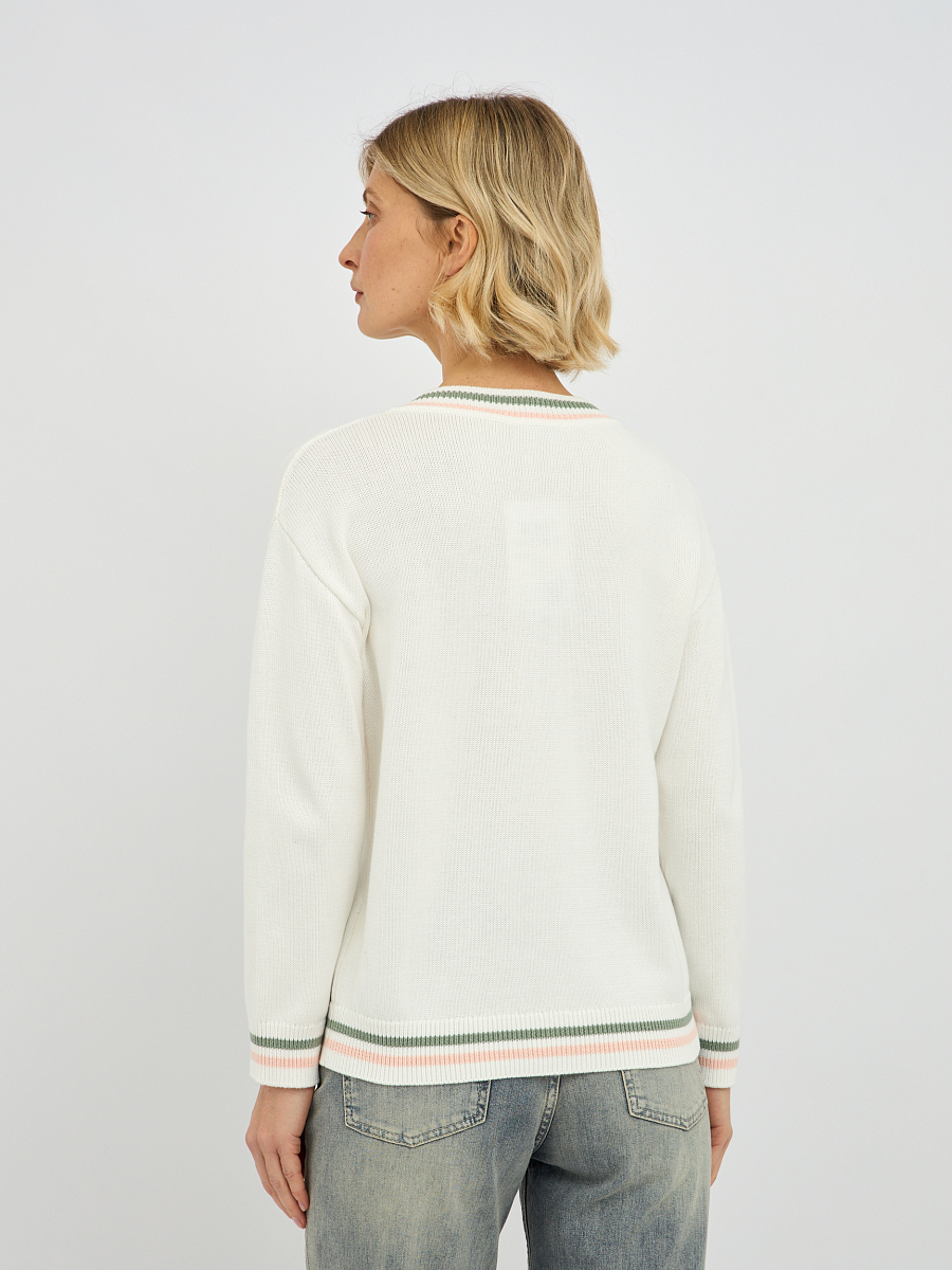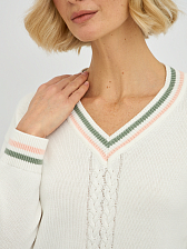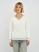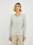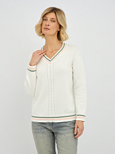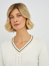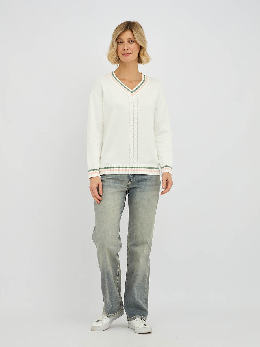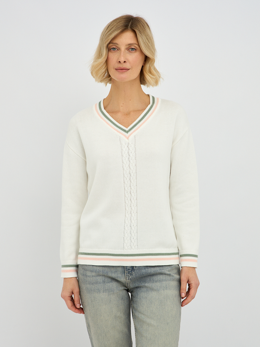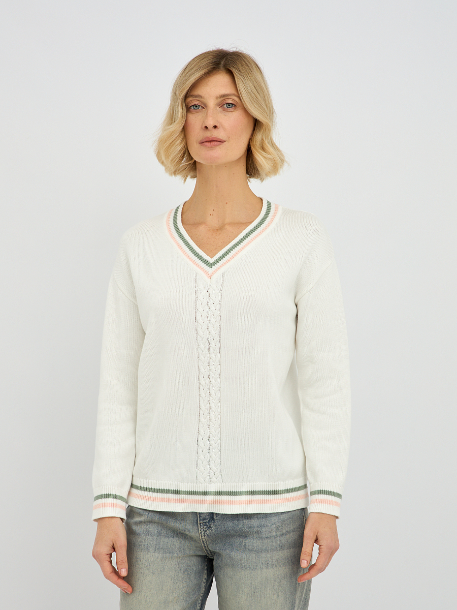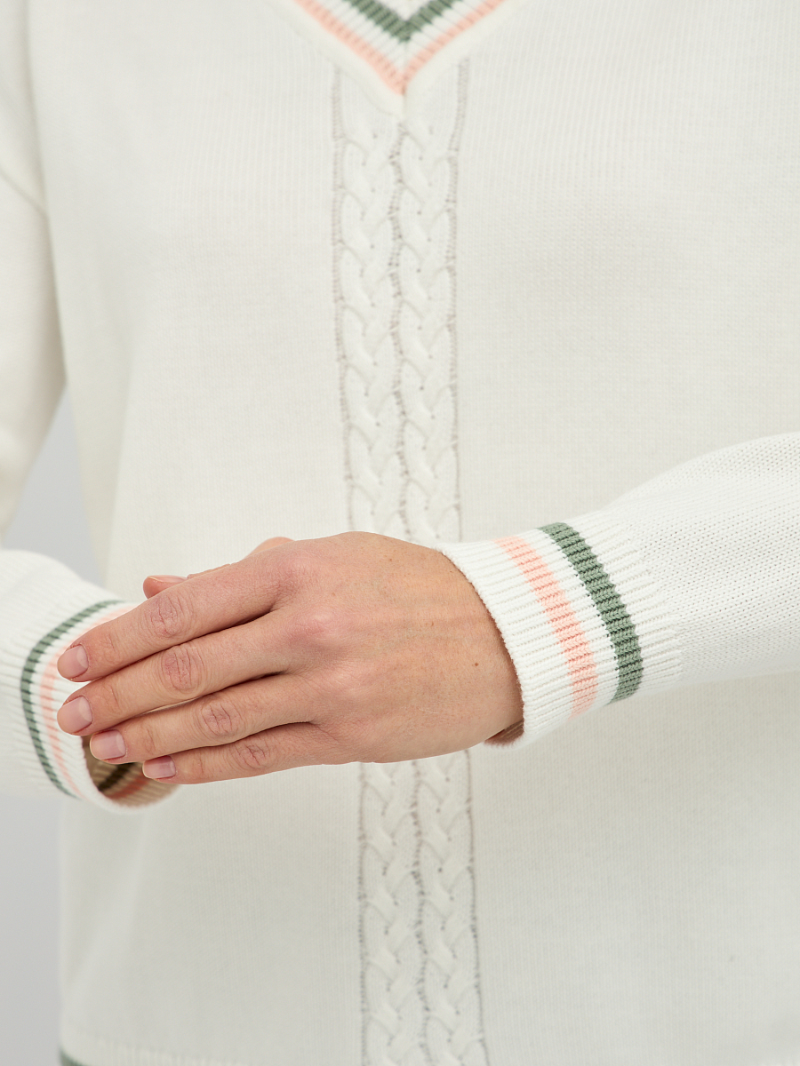 Центральным элементом дизайна является изящное плетение "коса", которое добавляет изделию текстуру и особый шарм. Контрастная окантовка по V-образному вырезу, манжетах и низу изделия придает пуловеру завершенный и элегантный вид, делая его более выразительным.