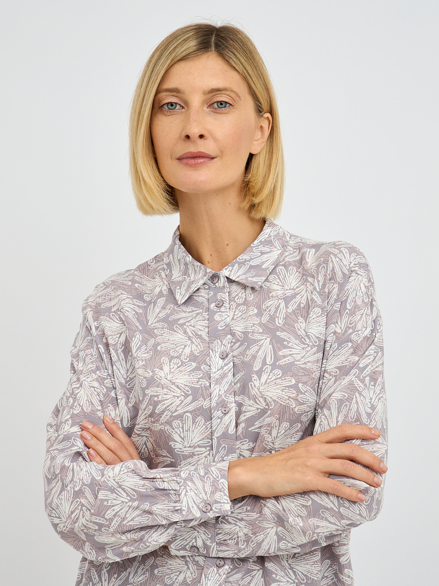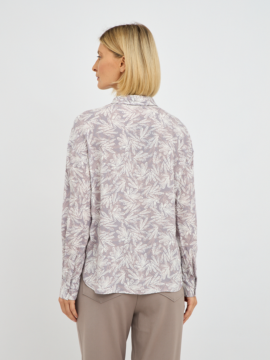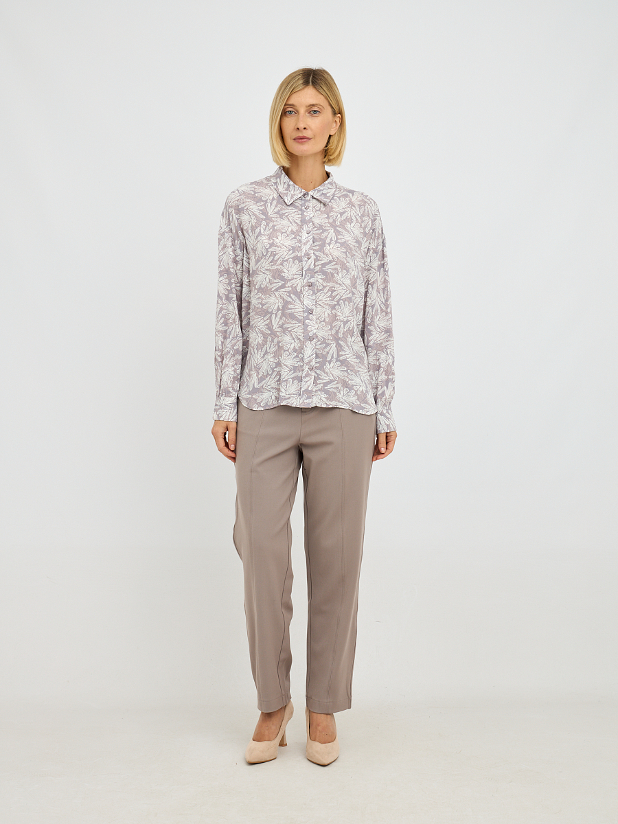 Блузка украшена элегантным растительным принтом, который добавляет образу свежести и женственности. Классический крой блузки с отложным воротником и длинными рукавами делает её универсальной для различных ситуаций.