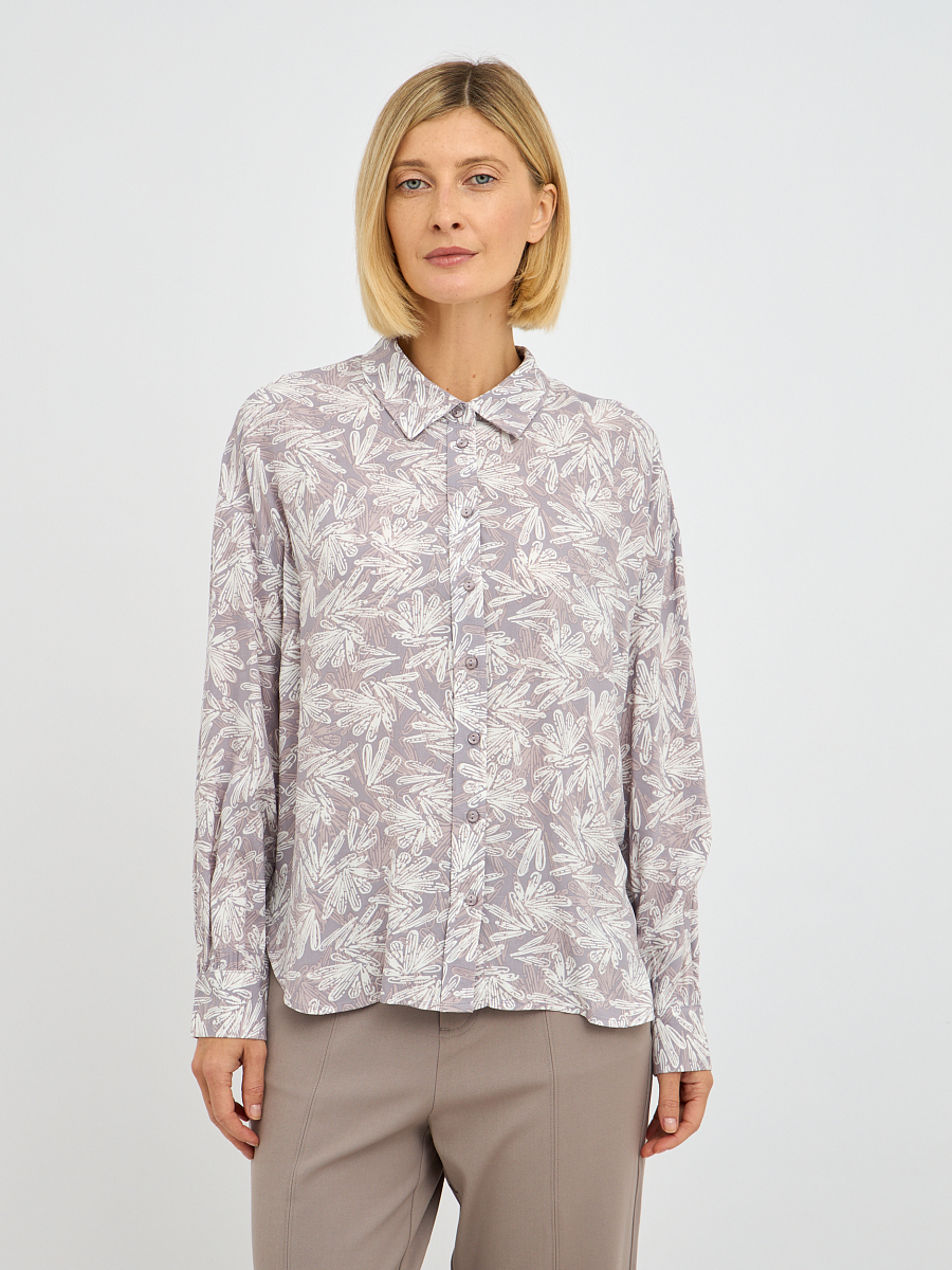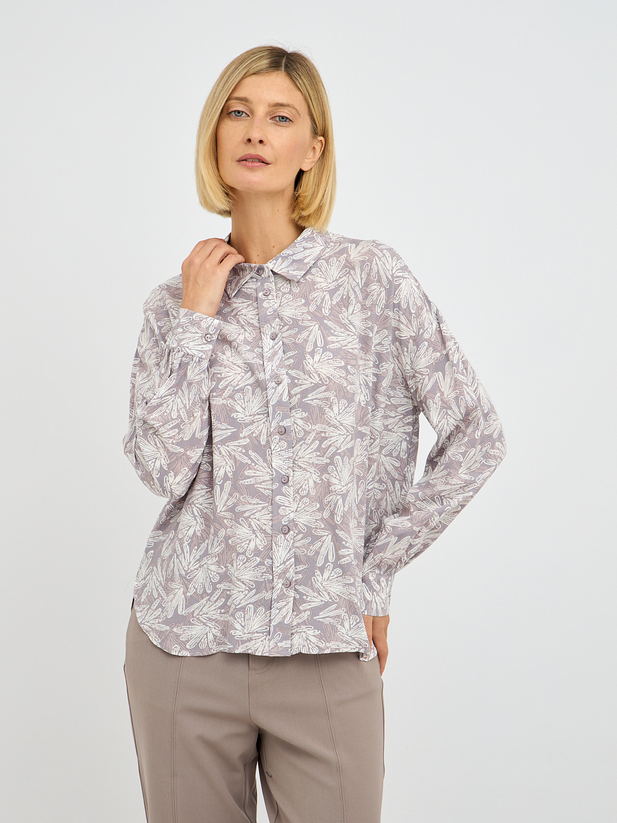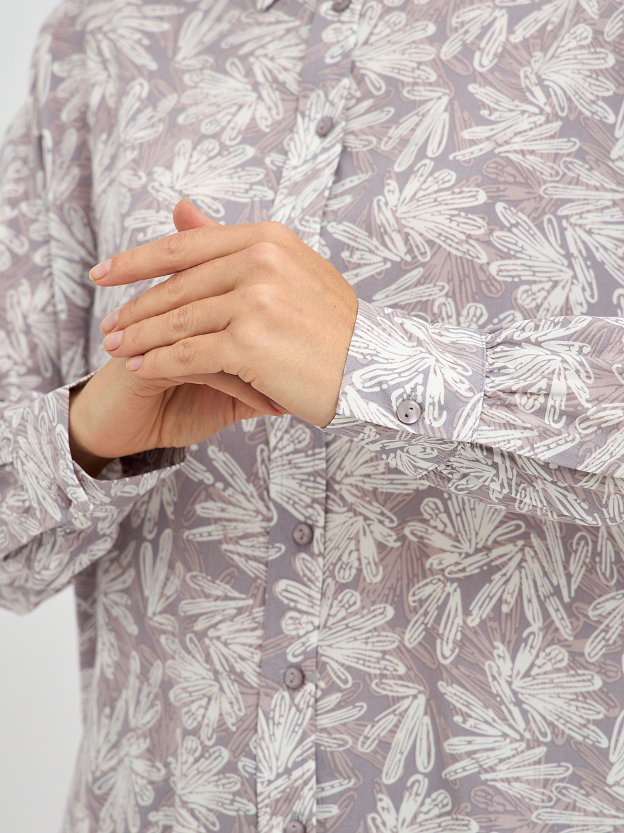 Блузка украшена элегантным растительным принтом, который добавляет образу свежести и женственности. Классический крой блузки с отложным воротником и длинными рукавами делает её универсальной для различных ситуаций.