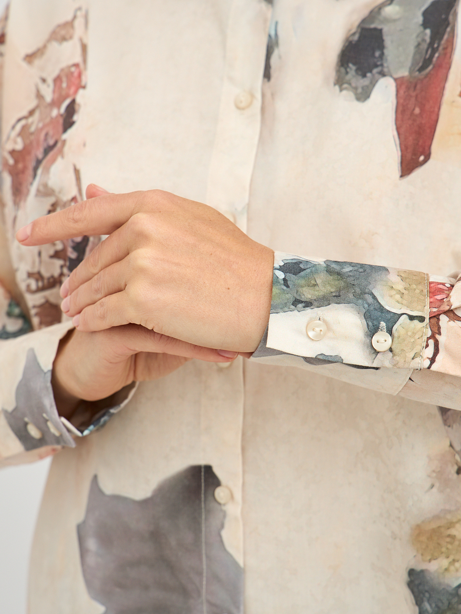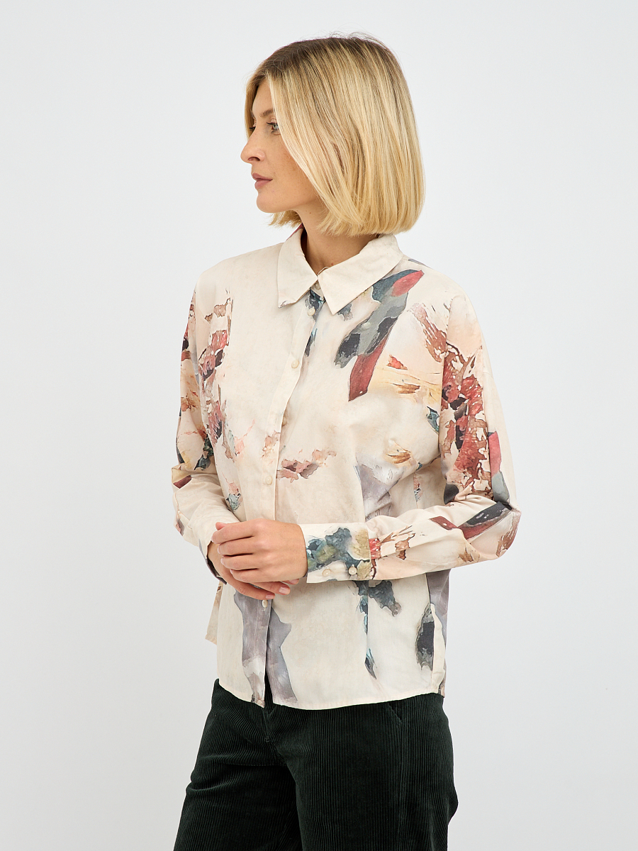 Бежевый цвет — это классика, которая легко комбинируется с другими оттенками и текстурами. Вы можете носить эту блузку как с джинсами, так и с юбками, создавая разнообразные образы для разных случаев. Принт добавляет индивидуальности и делает блузку ярким акцентом в вашем наряде.
