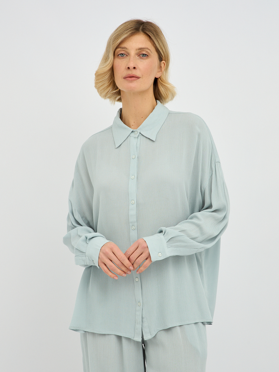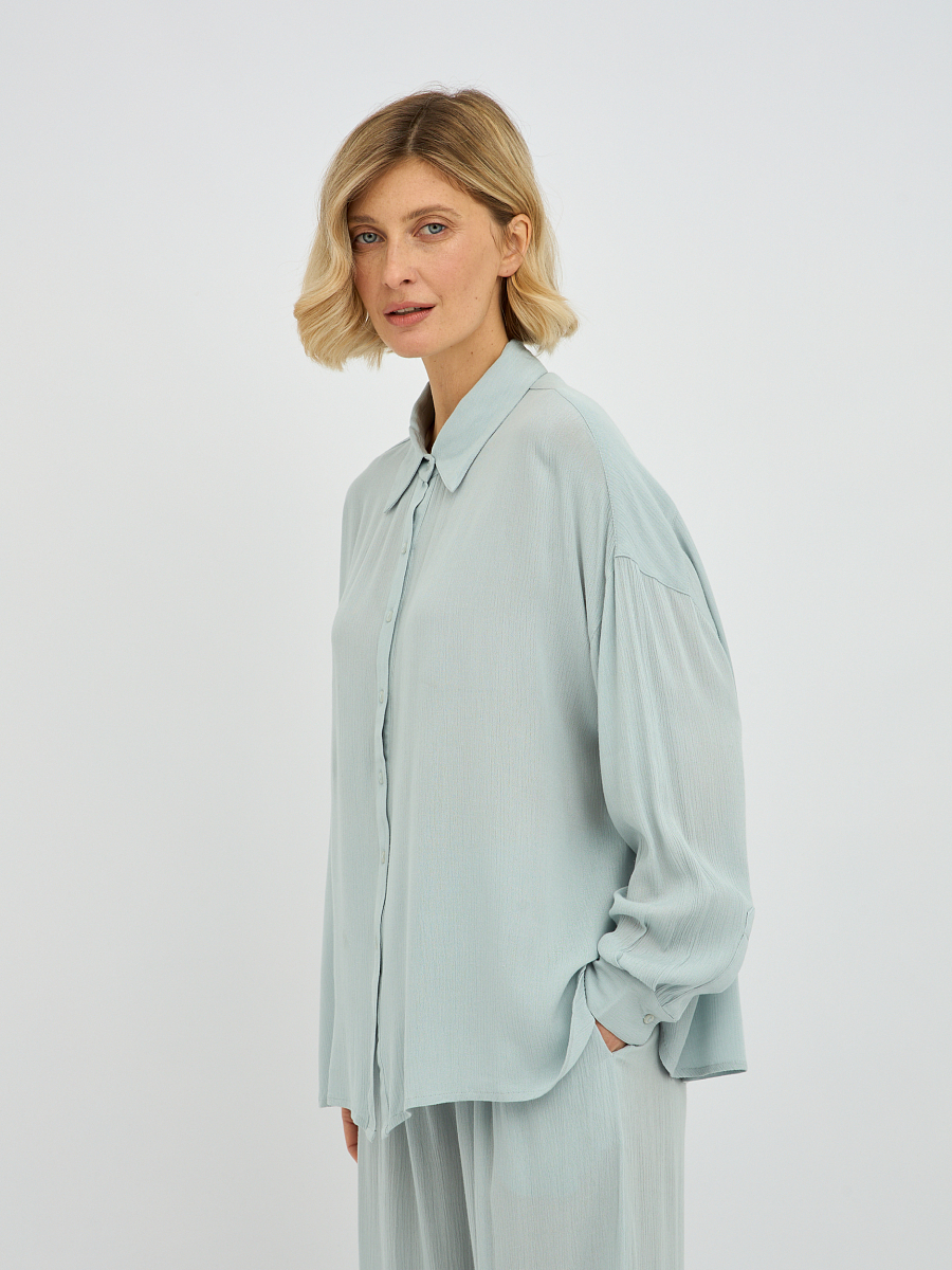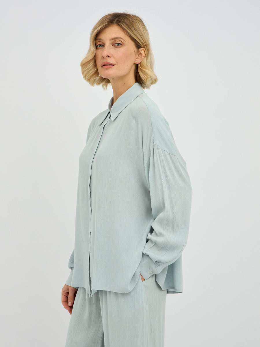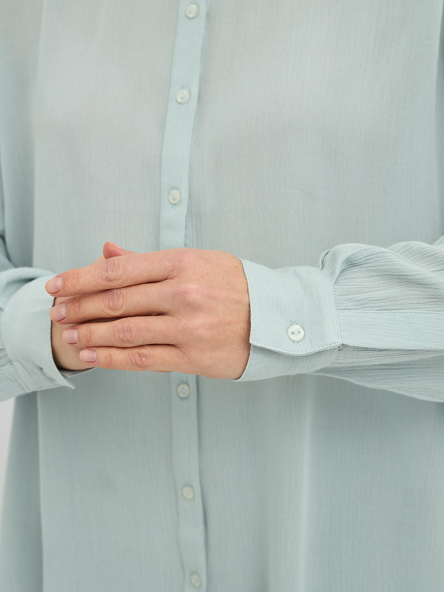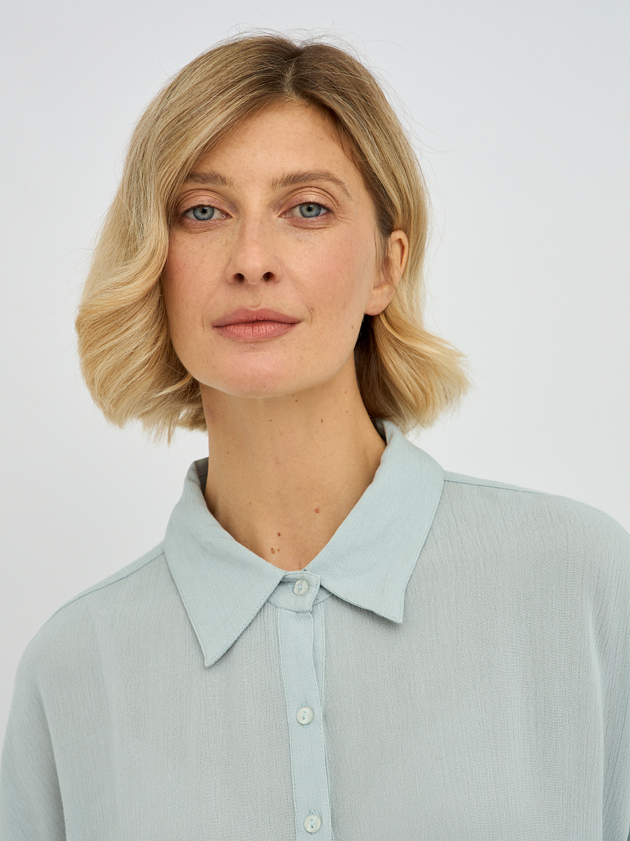 Дизайн блузки отличается минимализмом и лаконичностью, что делает ее универсальной и легко сочетаемой с различными предметами одежды. Классический отложной воротник придает образу завершенность, а плавная линия плеча и объемные рукава добавляют нотку современной моды.
