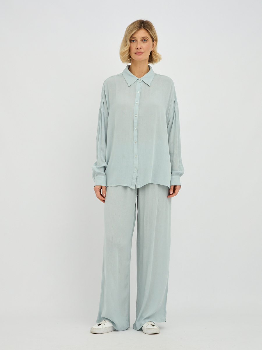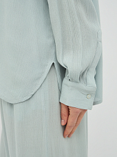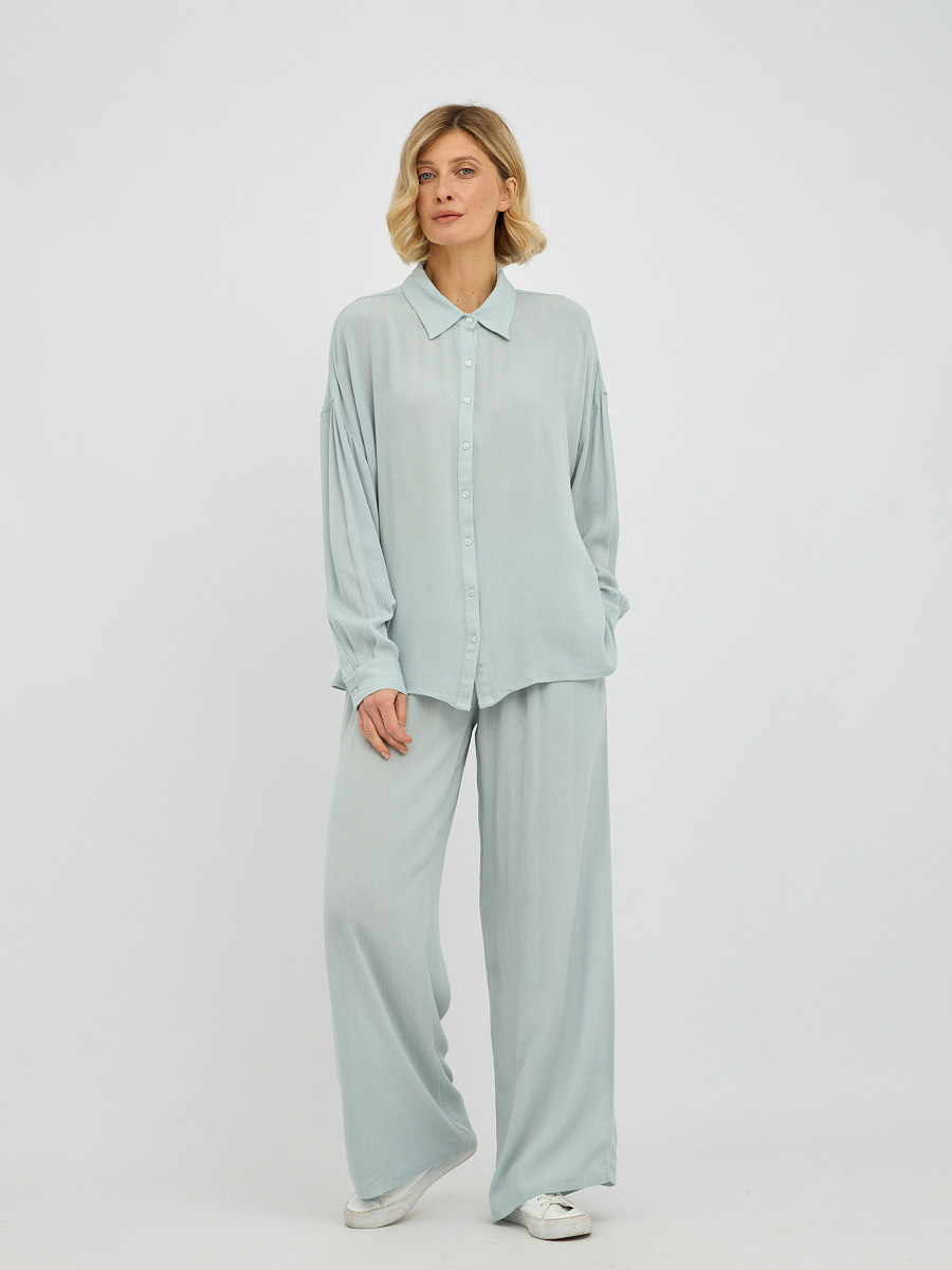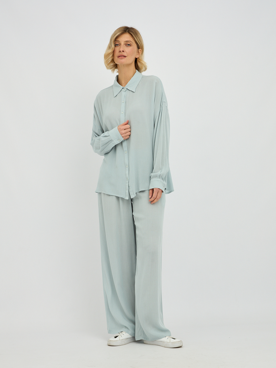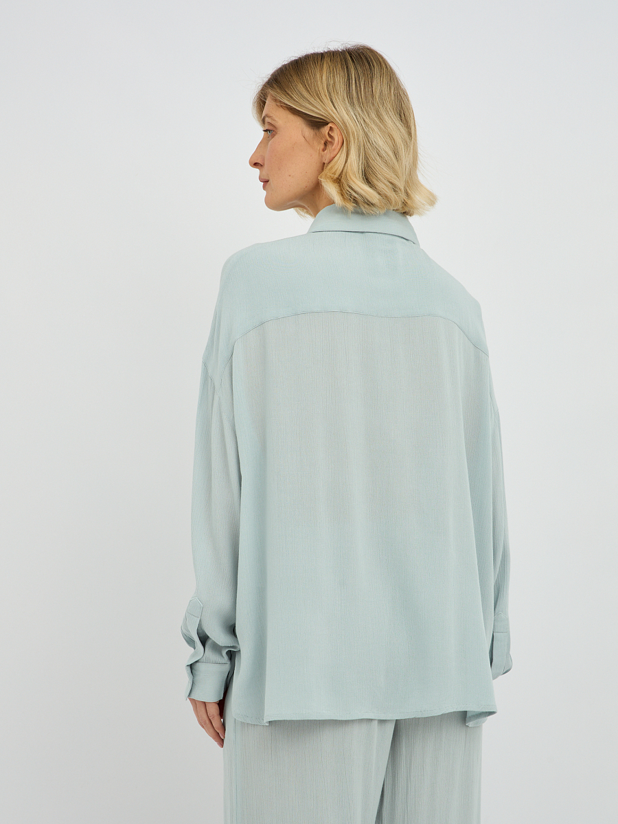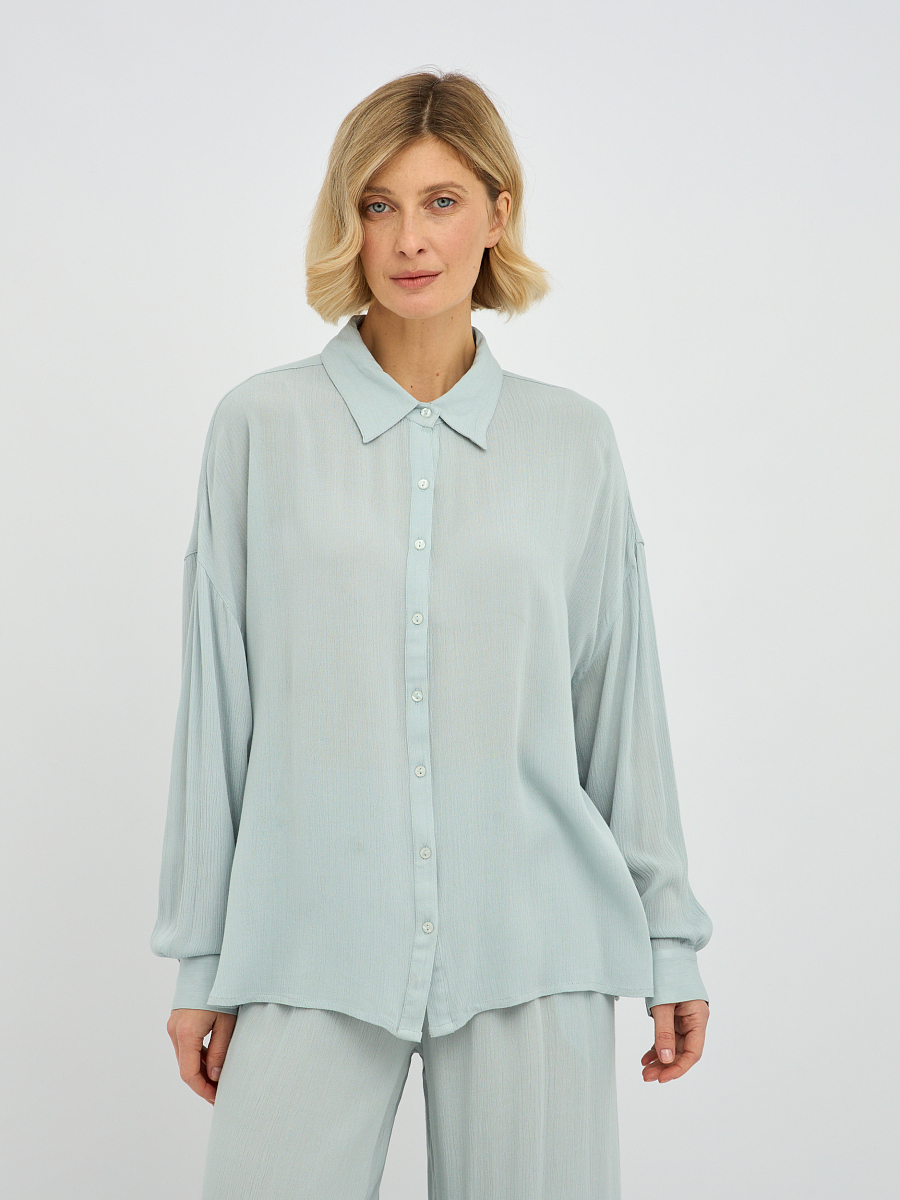 Дизайн блузки отличается минимализмом и лаконичностью, что делает ее универсальной и легко сочетаемой с различными предметами одежды. Классический отложной воротник придает образу завершенность, а плавная линия плеча и объемные рукава добавляют нотку современной моды.