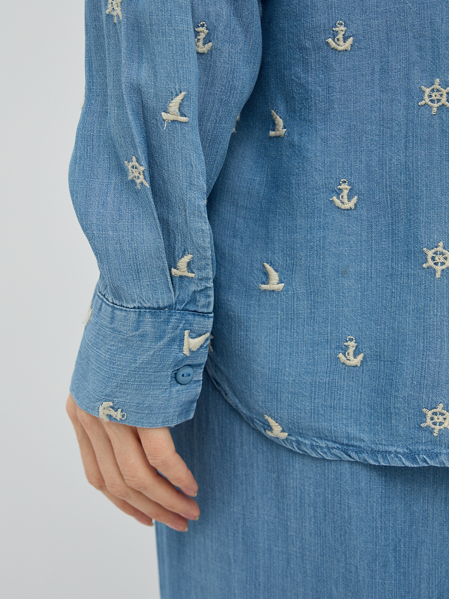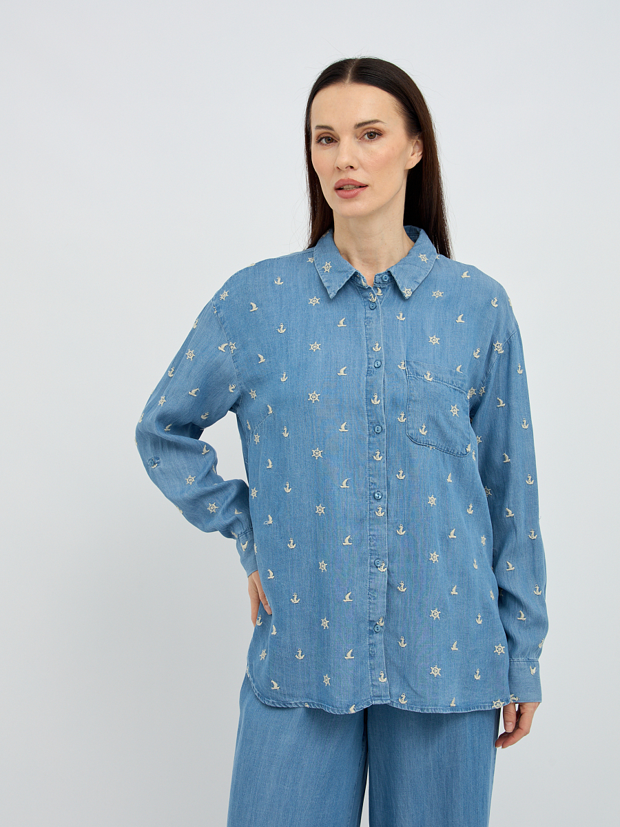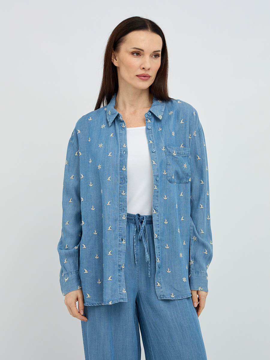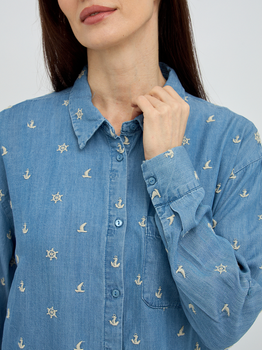 Особое очарование рубашке придает деликатная вышивка, расположенная по всей поверхности, которая добавляет образу нотку романтичности и утонченности. Классический крой с отложным воротником и длинными рукавами делает эту модель универсальной, подходящей как для повседневных, так и для более элегантных образов. Свободный силуэт обеспечивает максимальный комфорт и свободу движений, а пуговицы по всей длине позволяют регулировать степень прилегания и создавать различные варианты стилизации.