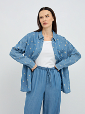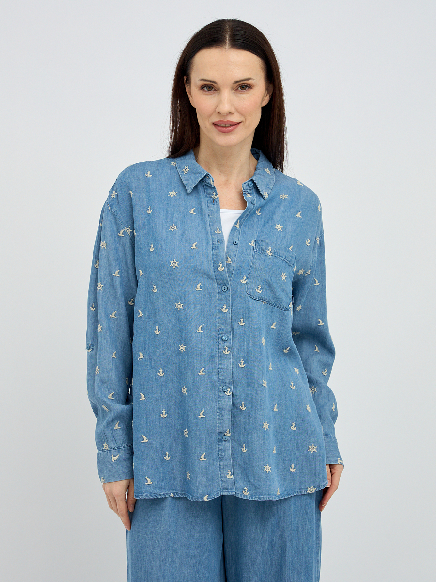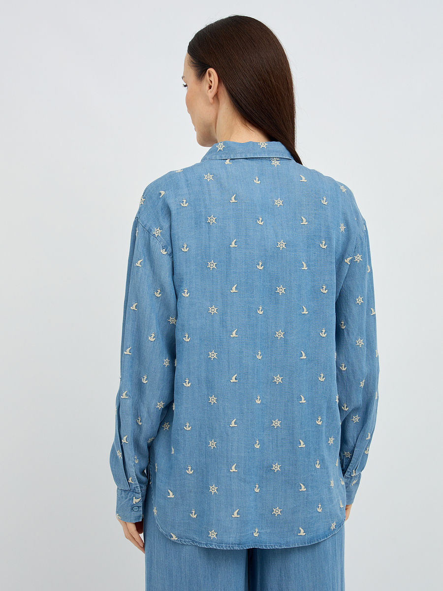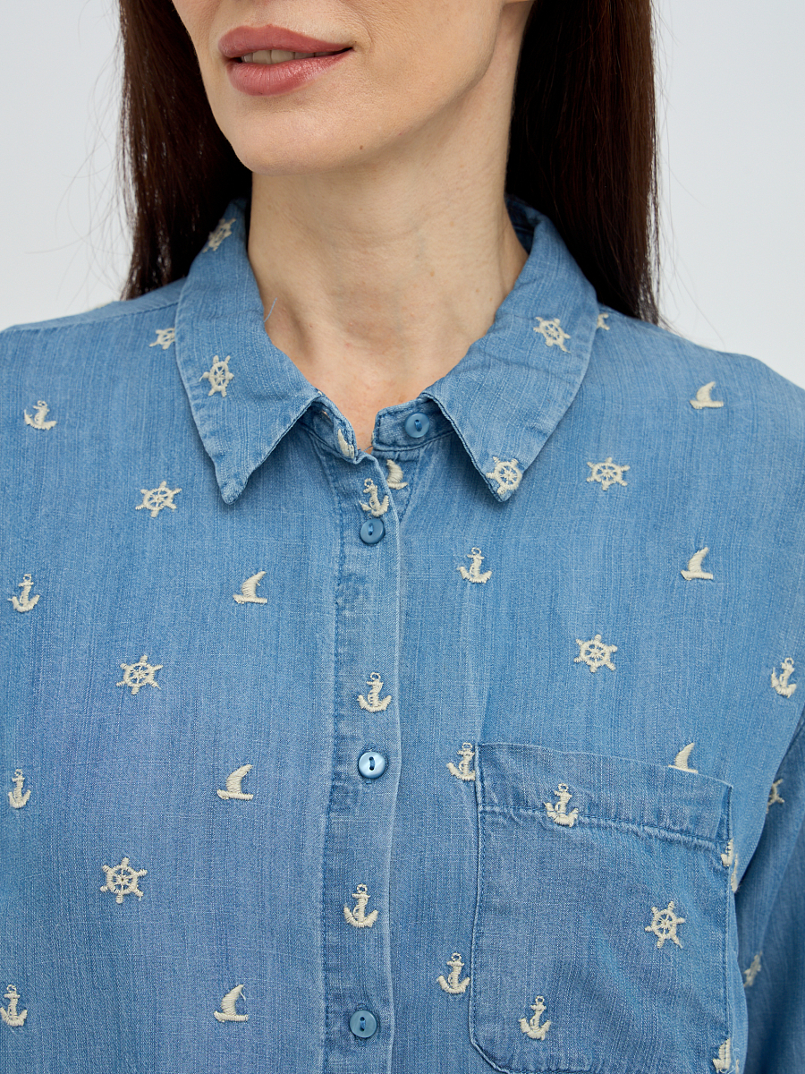 Особое очарование рубашке придает деликатная вышивка, расположенная по всей поверхности, которая добавляет образу нотку романтичности и утонченности. Классический крой с отложным воротником и длинными рукавами делает эту модель универсальной, подходящей как для повседневных, так и для более элегантных образов. Свободный силуэт обеспечивает максимальный комфорт и свободу движений, а пуговицы по всей длине позволяют регулировать степень прилегания и создавать различные варианты стилизации.