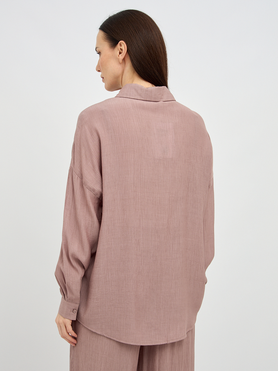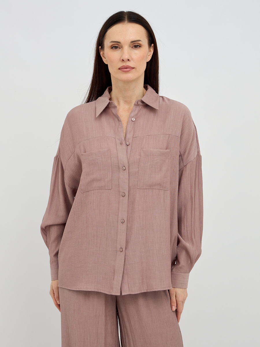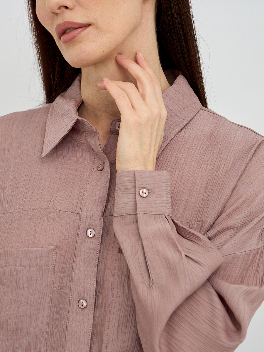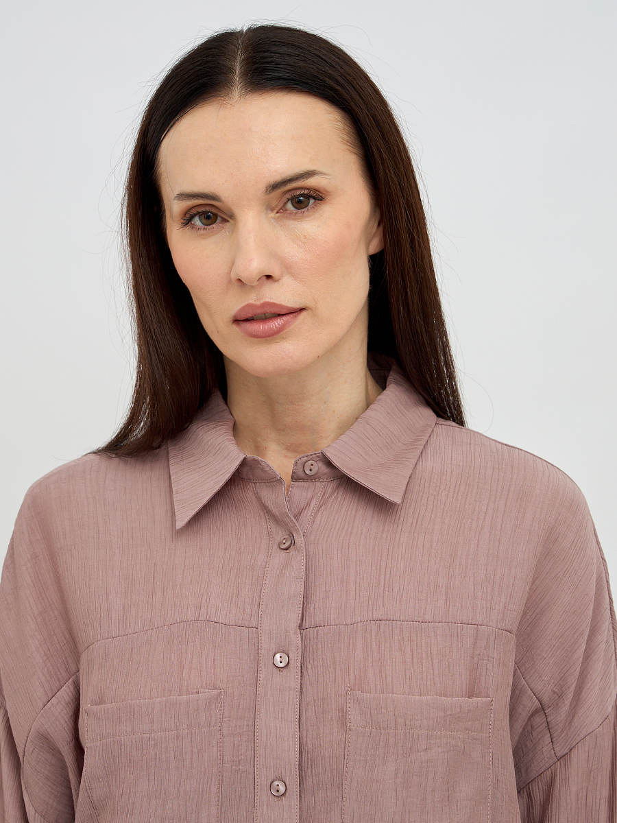 Уникальная фактура жатой ткани придает блузке особый шарм и визуальную глубину, скрывая мелкие несовершенства и добавляя образу элегантности. Свободный крой создает непринужденный и расслабленный силуэт, который подходит для любого типа фигуры, обеспечивая максимальный комфорт и свободу движений.